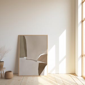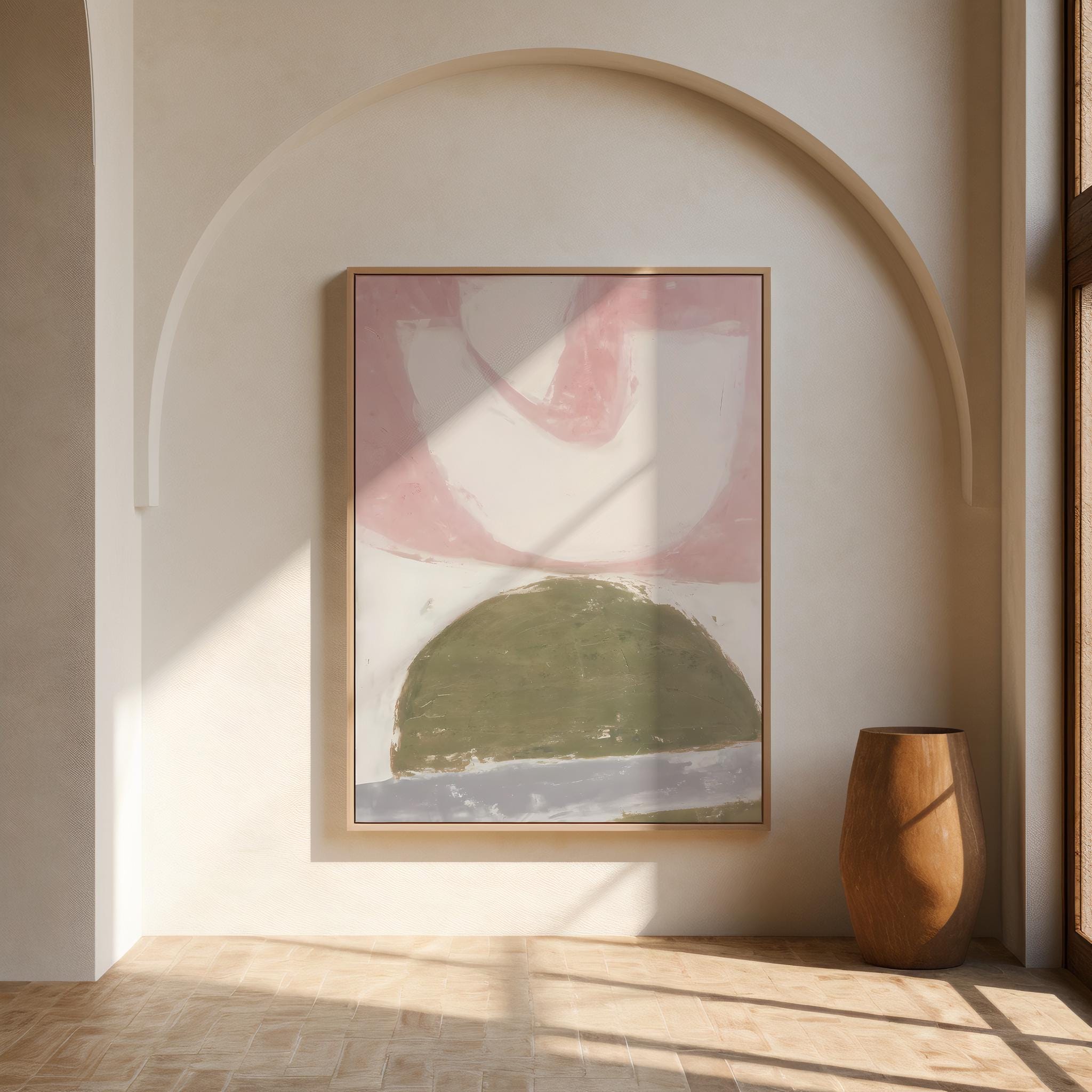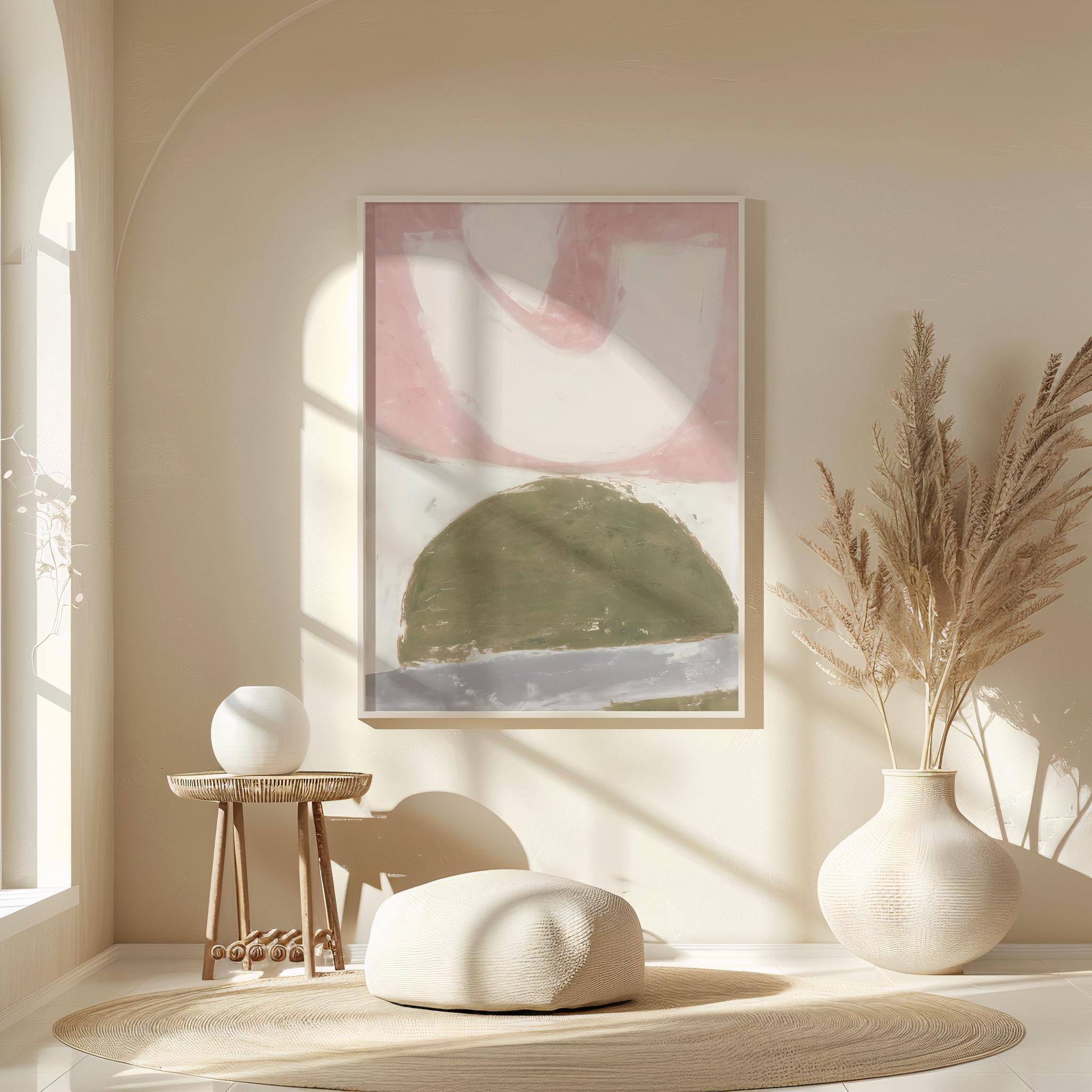 Transform your space with this minimalist abstract wall art featuring soft blush pink, olive green, and neutral gray tones. The gentle organic shapes and subtle brush textures evoke calm and sophistication, perfect for modern interiors.