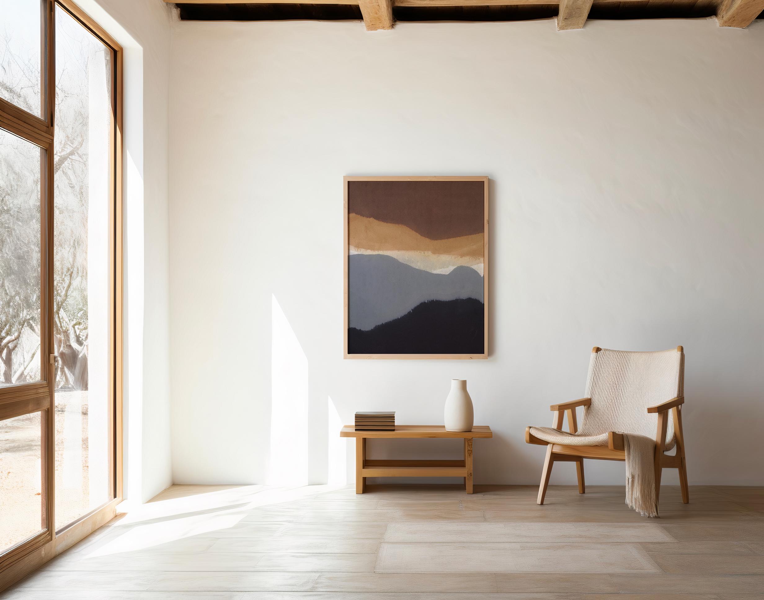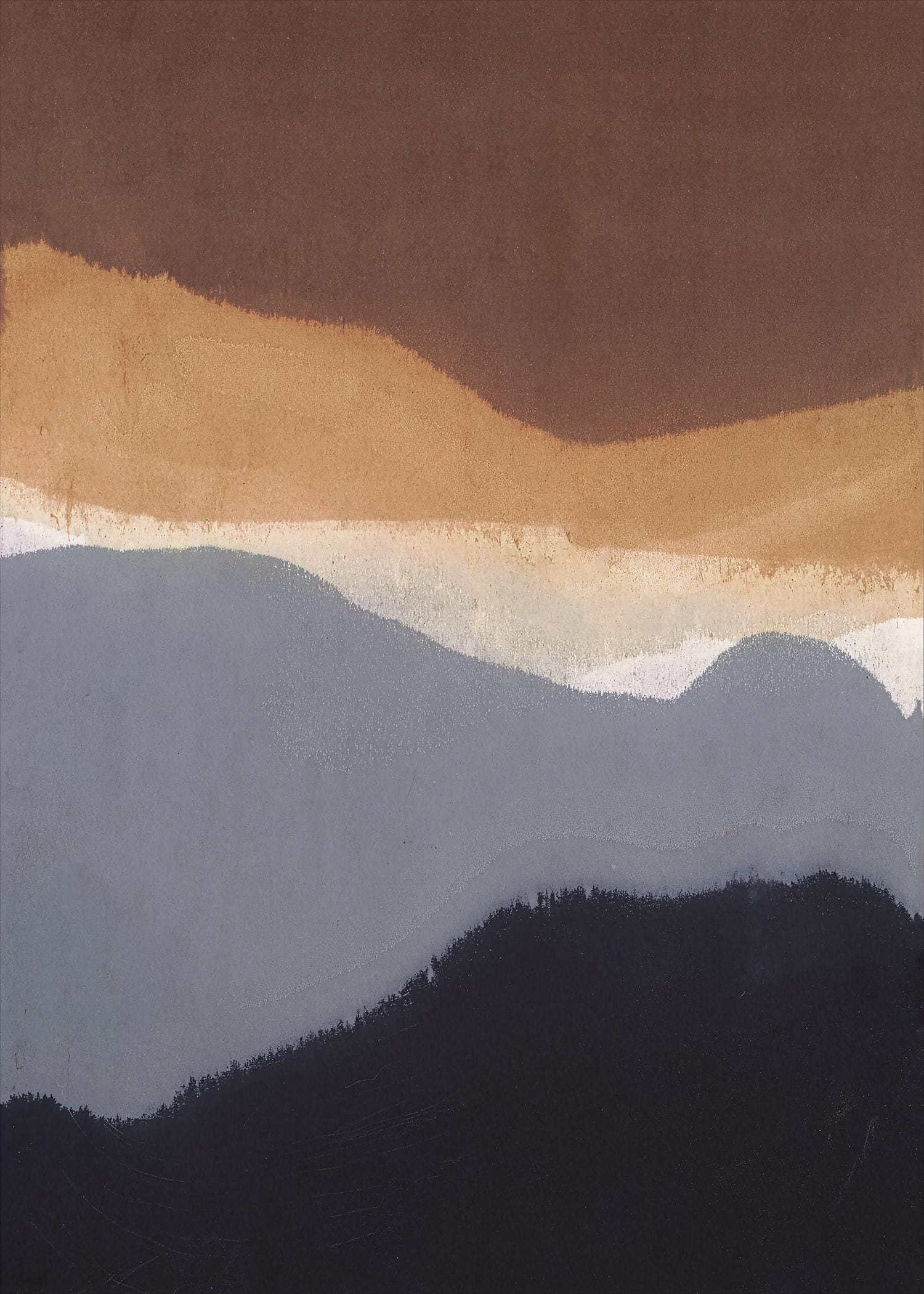 Layer by layer, this print builds a mountain scene from the ground up — dark treeline at the base, blue-grey slopes rising through soft mist, a pale horizon catching the light, then warm amber and deep chocolate brown above. It's the kind of landscape that feels both ancient and completely contemporary. Graphic without being cold. Earthy without being heavy.