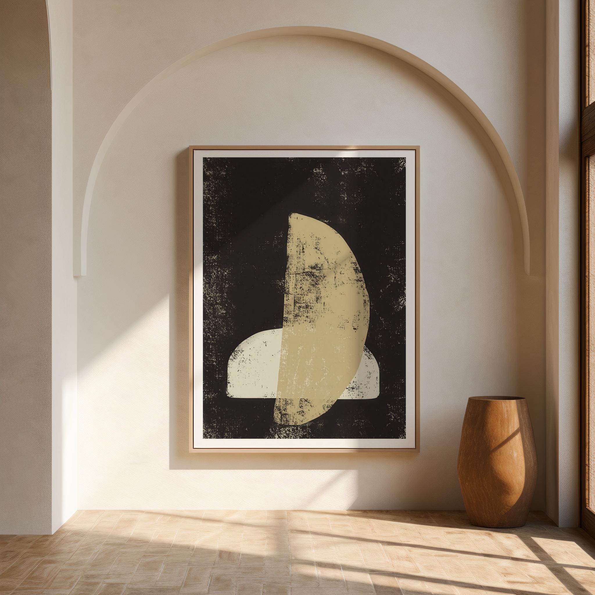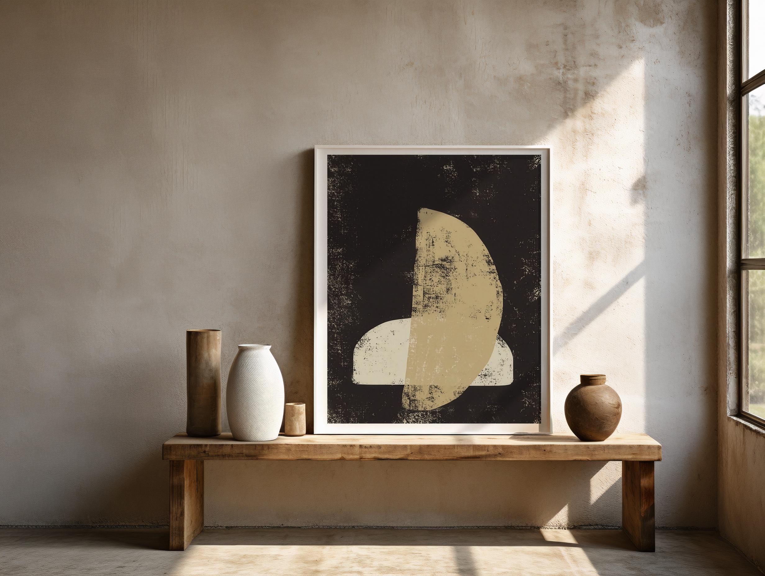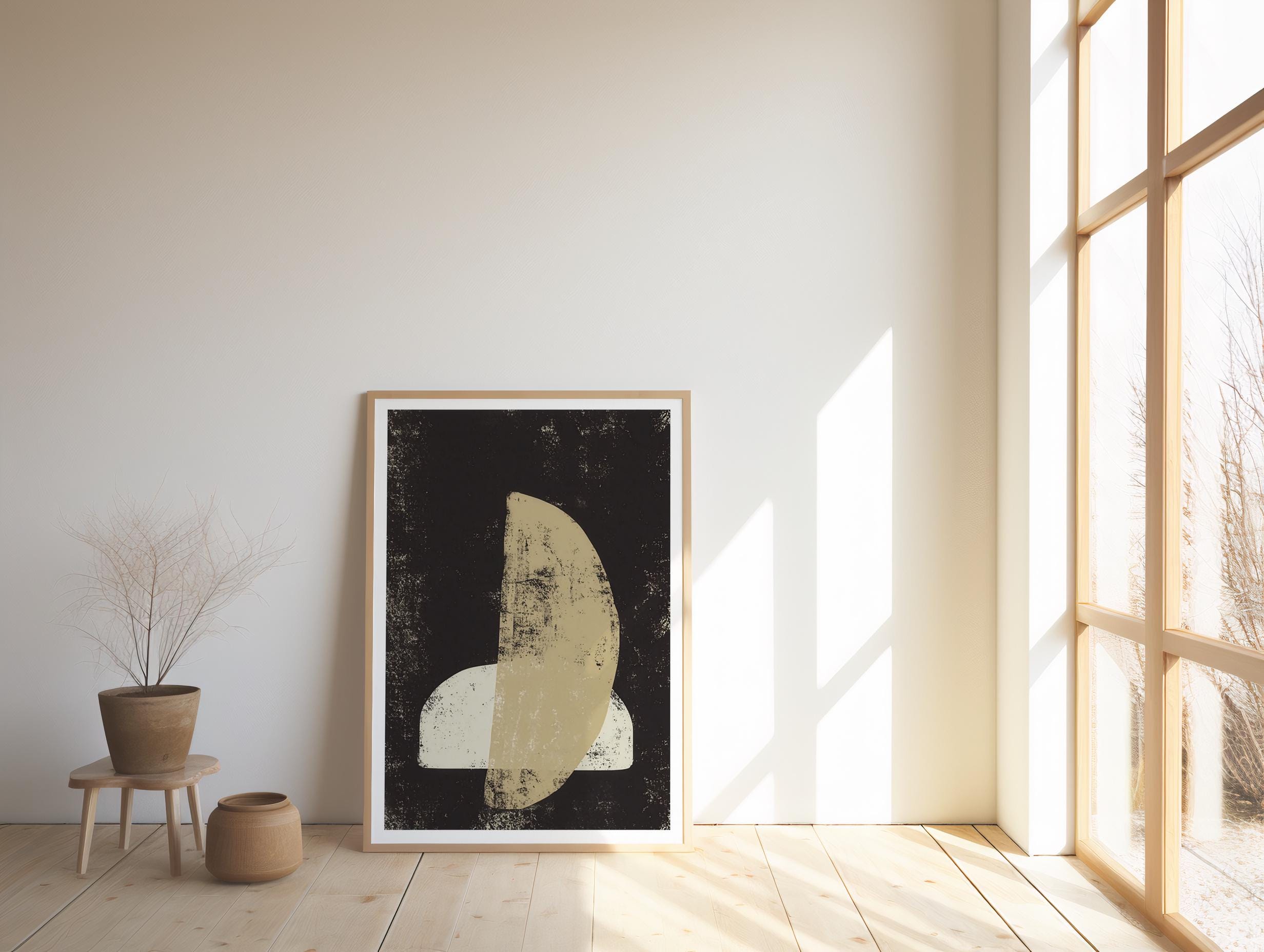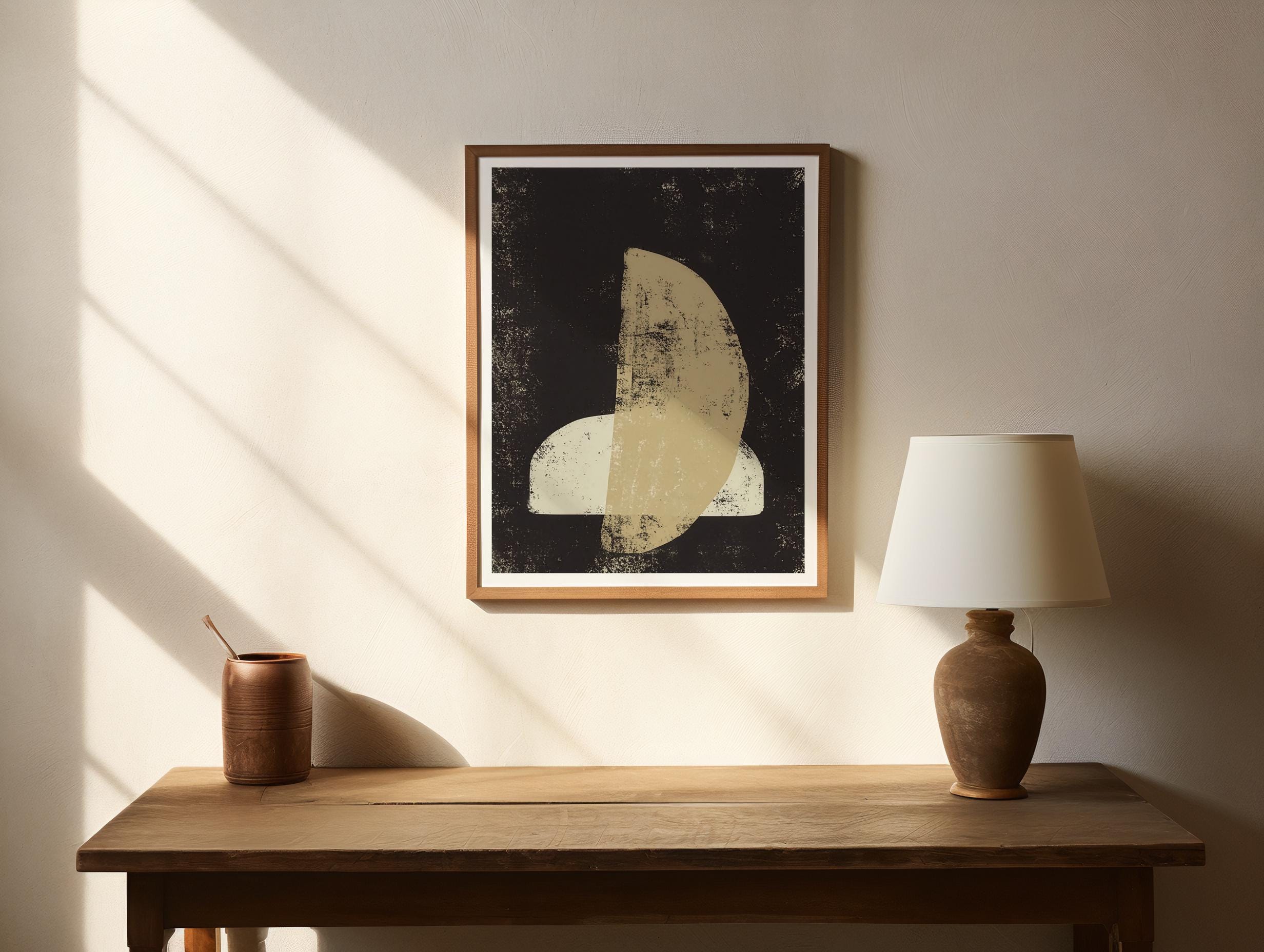 Bring refined minimalism to your home with this modern abstract wall art print. Featuring soft beige and cream geometric forms on a deep black textured background, this mid-century inspired digital download blends organic balance with bold simplicity. Perfect for neutral interiors, Scandinavian décor, or contemporary gallery walls.