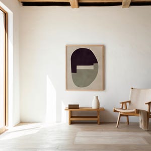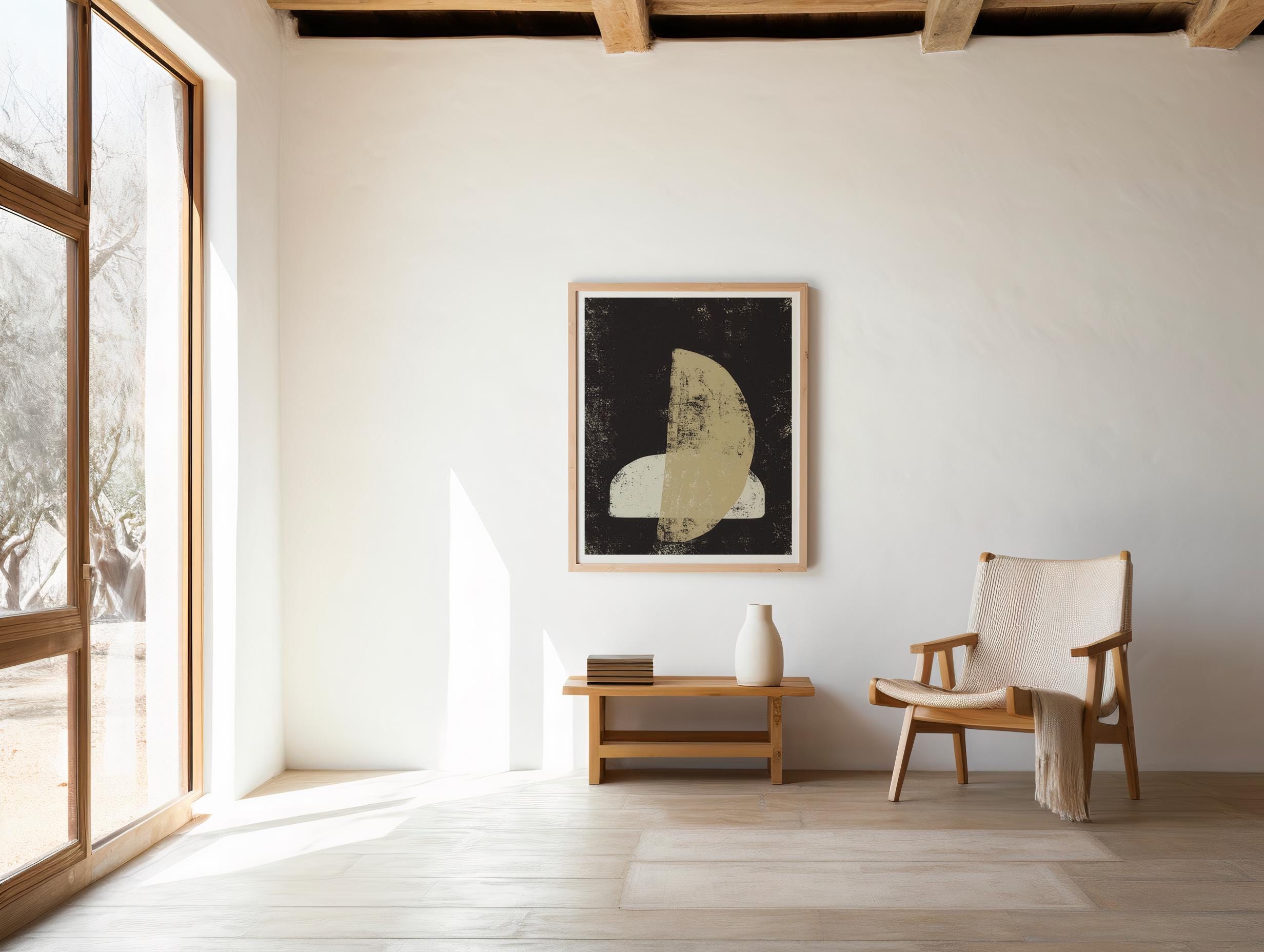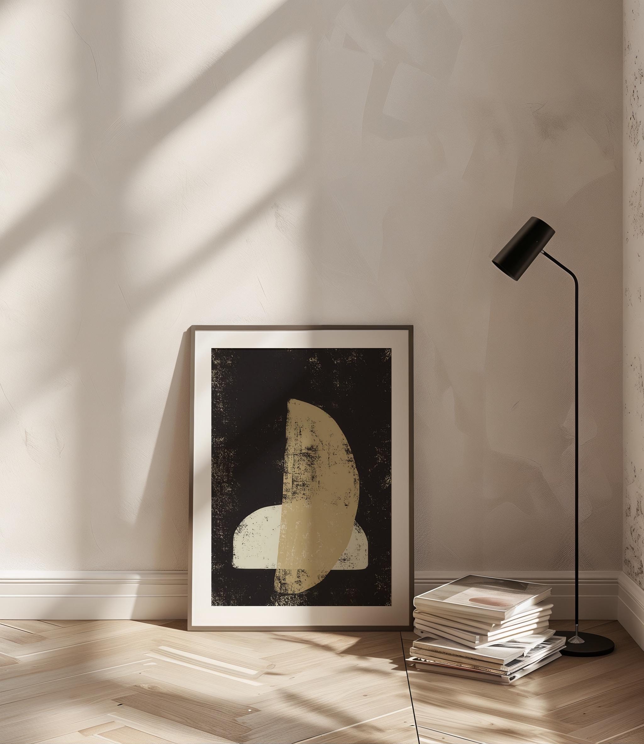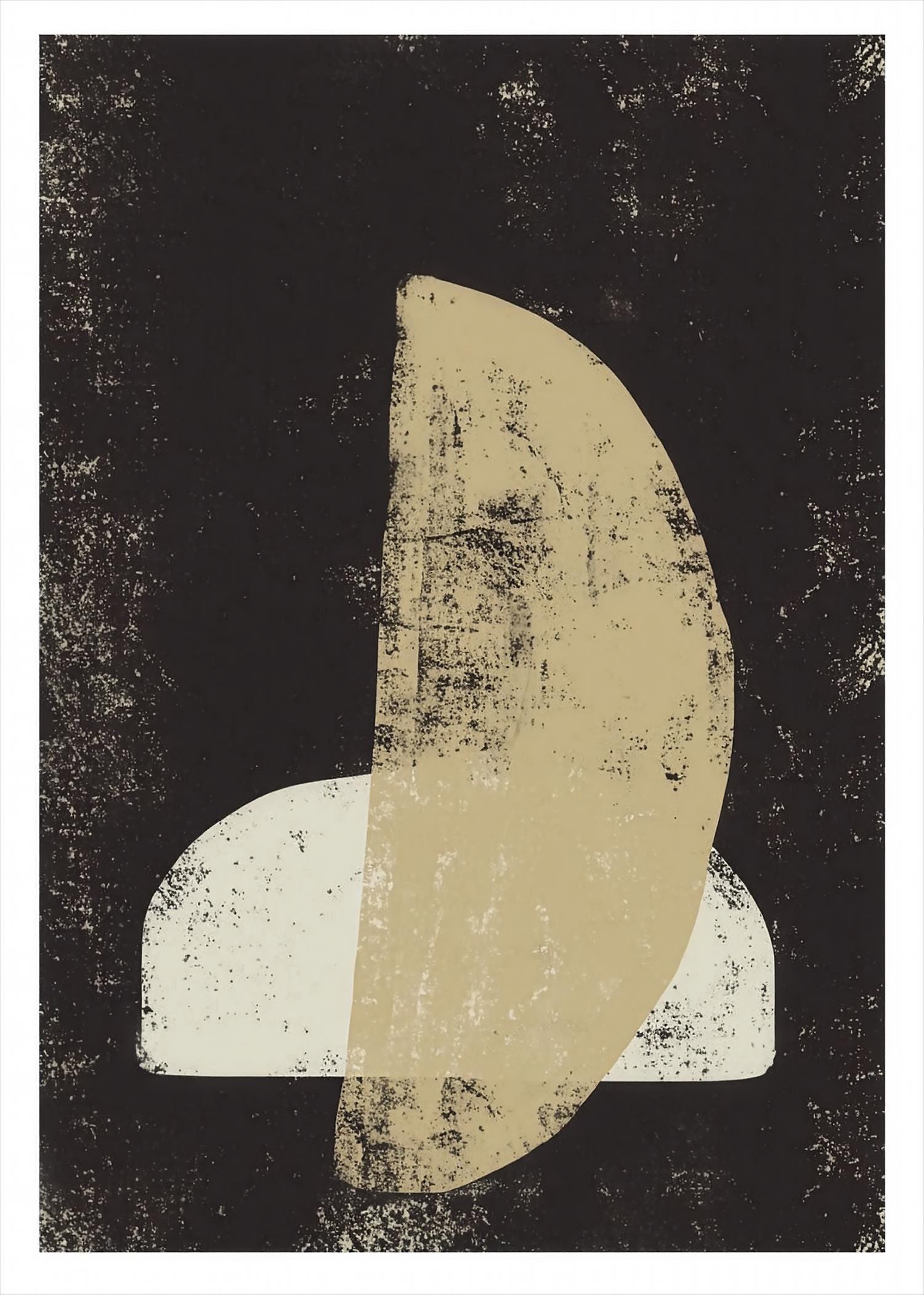 Bring refined minimalism to your home with this modern abstract wall art print. Featuring soft beige and cream geometric forms on a deep black textured background, this mid-century inspired digital download blends organic balance with bold simplicity. Perfect for neutral interiors, Scandinavian décor, or contemporary gallery walls.
