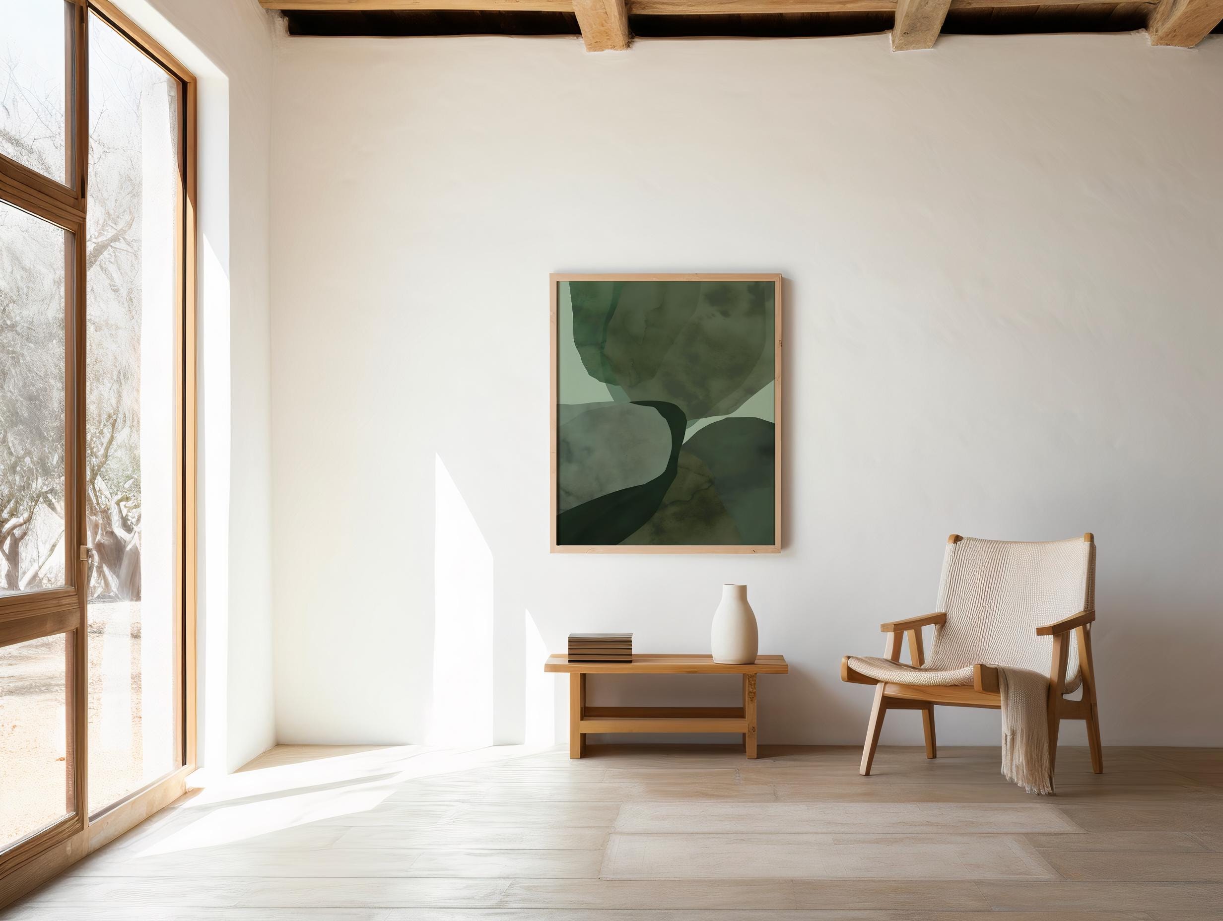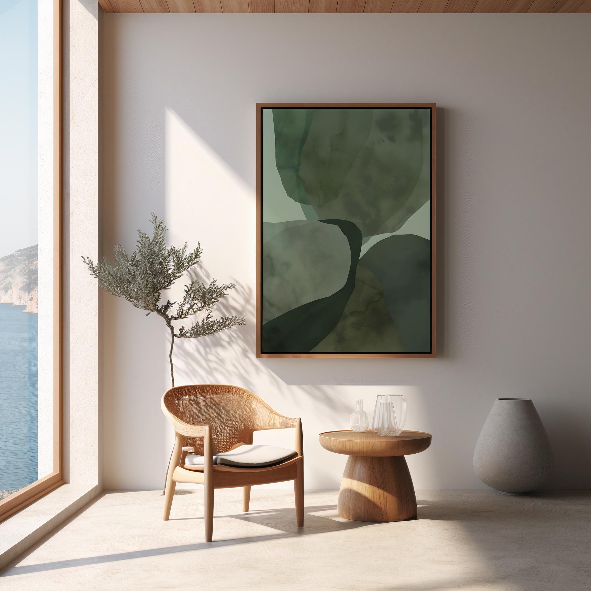 Immerse your space in calm and sophistication with this green abstract watercolor print—a minimalist composition of layered organic shapes in deep forest, sage, and moss tones. The soft gradients and translucent layers evoke a sense of earthy elegance and natural balance, perfect for tranquil interiors.