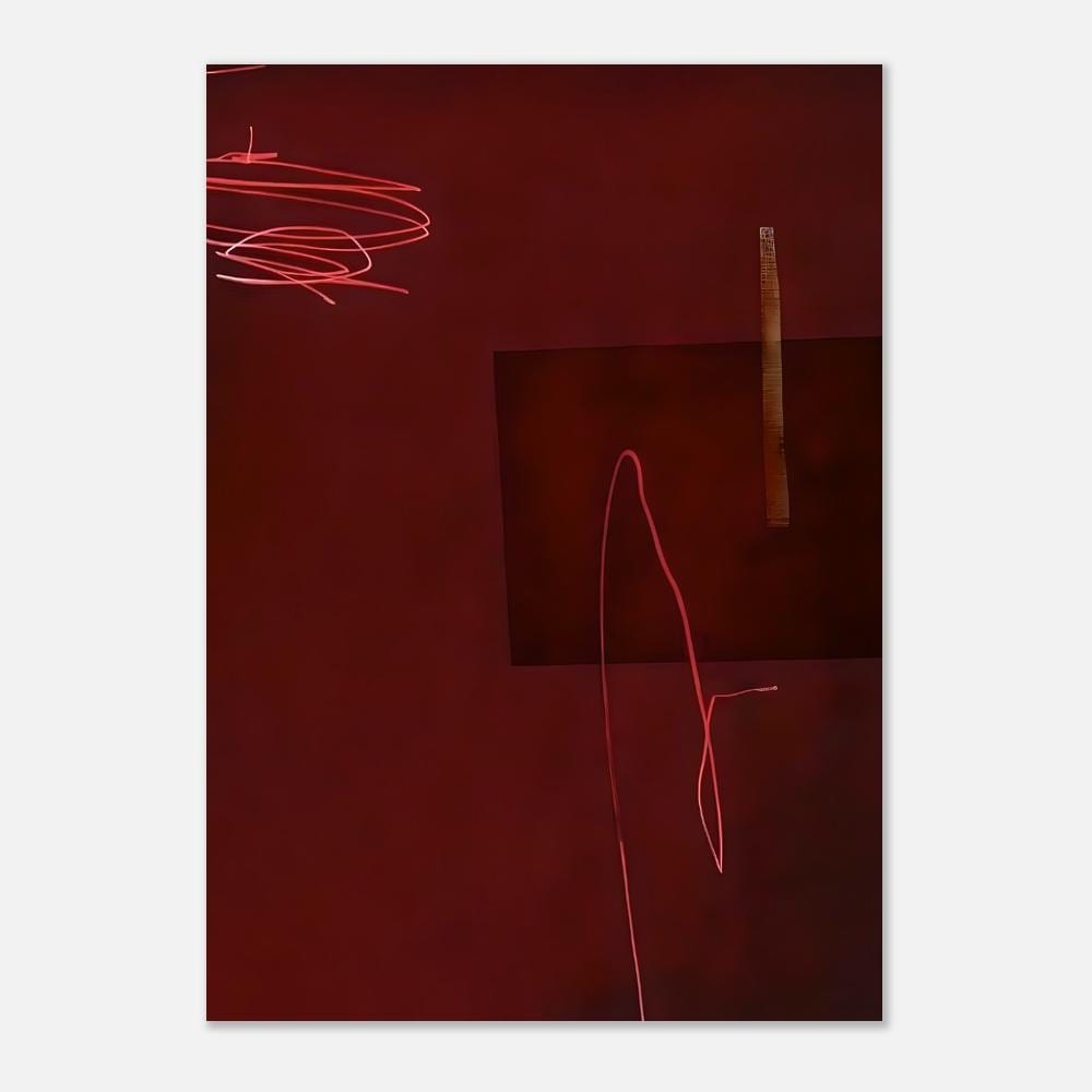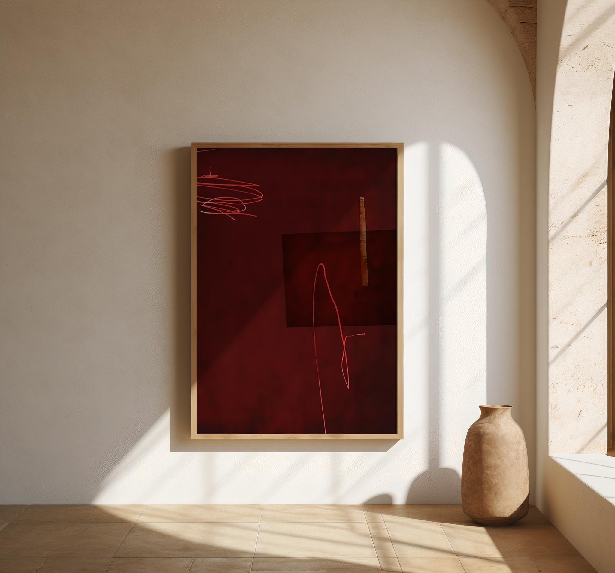 This bold red abstract artwork features layered tonal depth with striking linear elements that create movement and contrast. Deep crimson and burgundy tones blend with subtle texture, while fine glowing lines add a contemporary, architectural edge.