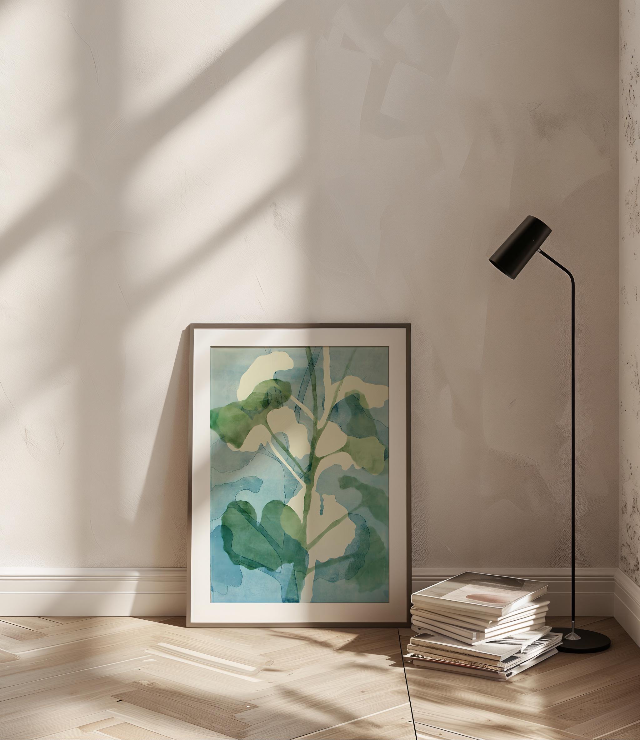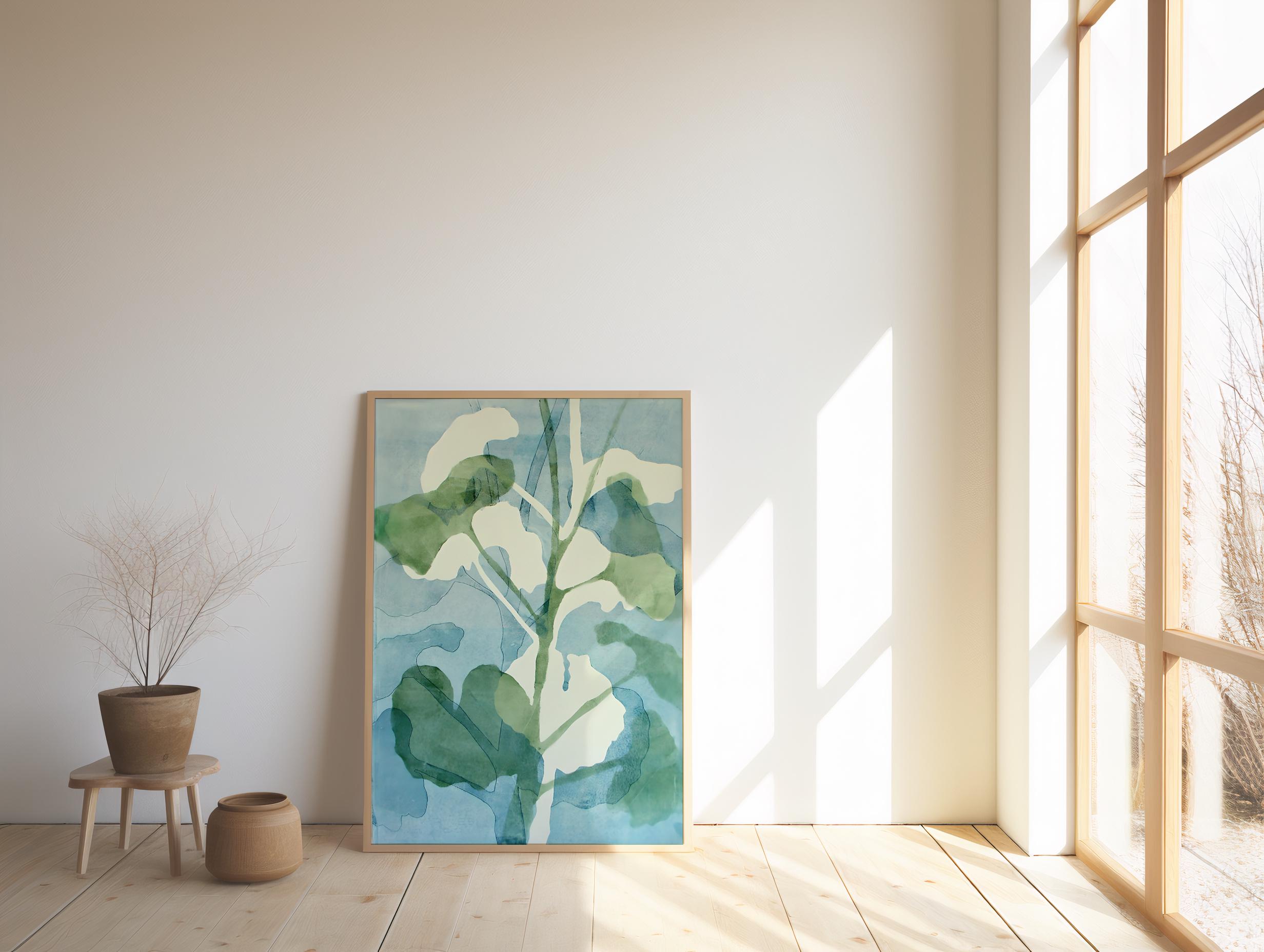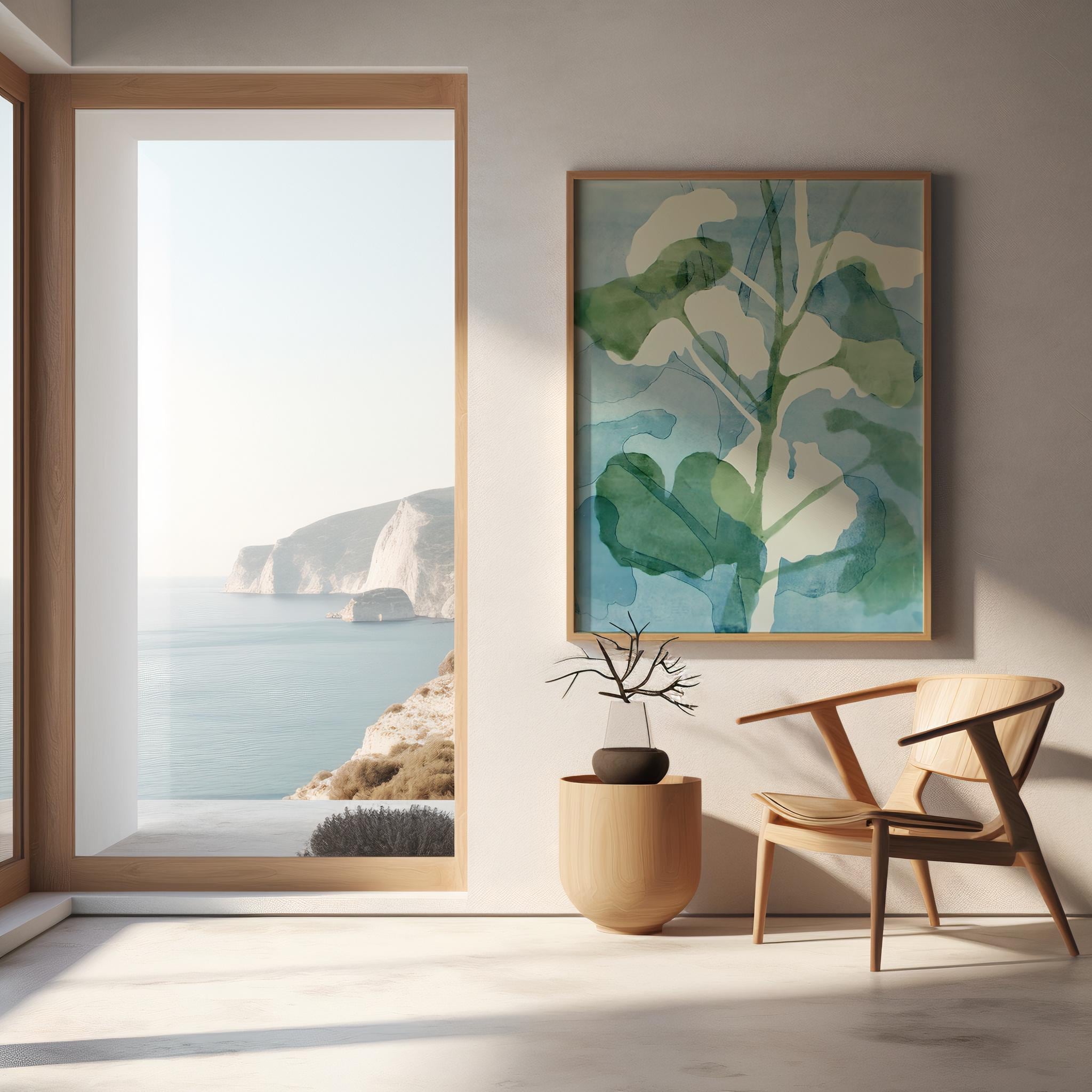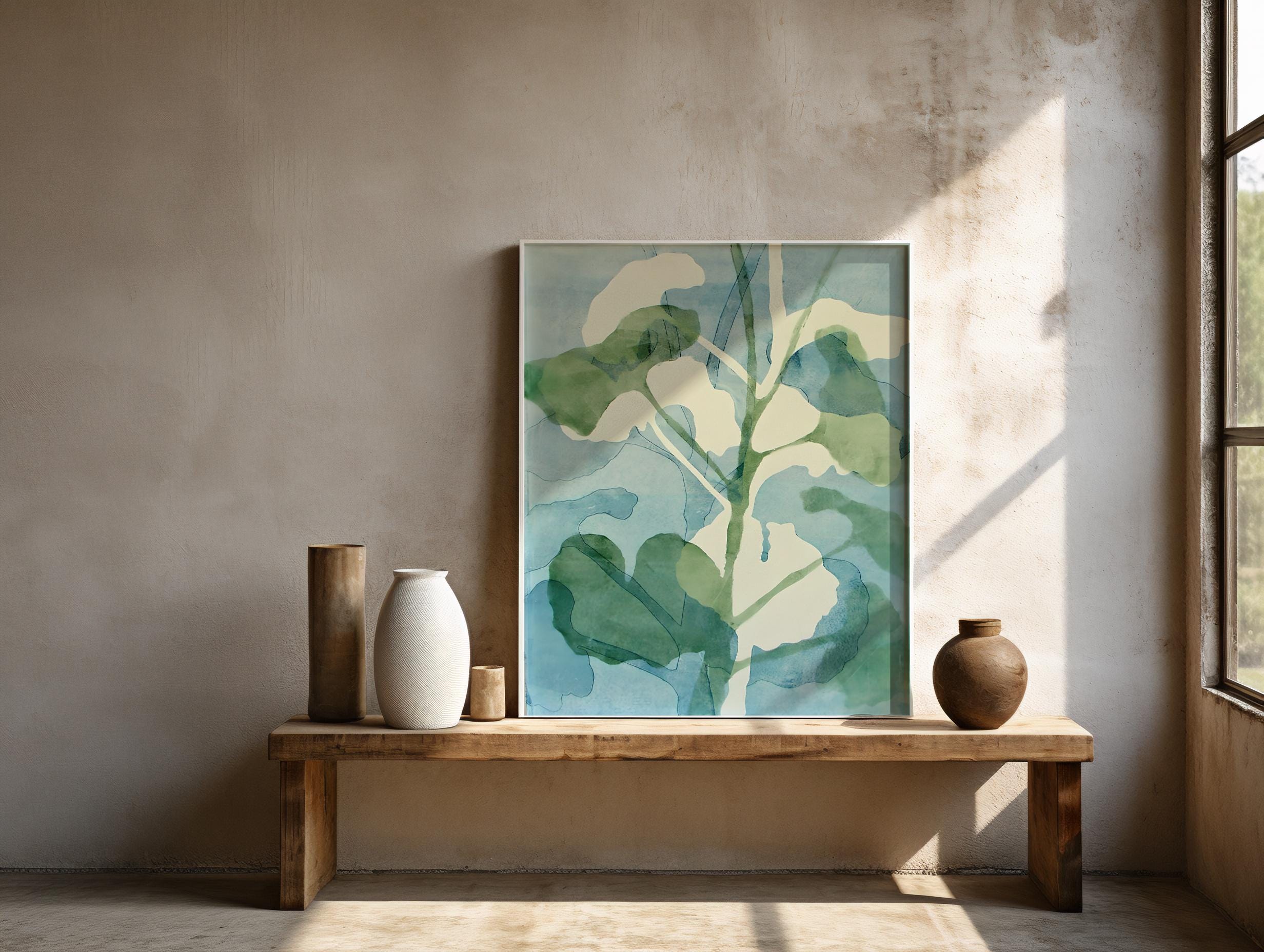 Bring serenity and natural elegance to your space with this minimalist botanical watercolor print — a digital artwork blending soft green leaves and translucent blue layers for a fresh, modern look. Perfect for art lovers who appreciate simplicity and organic design.