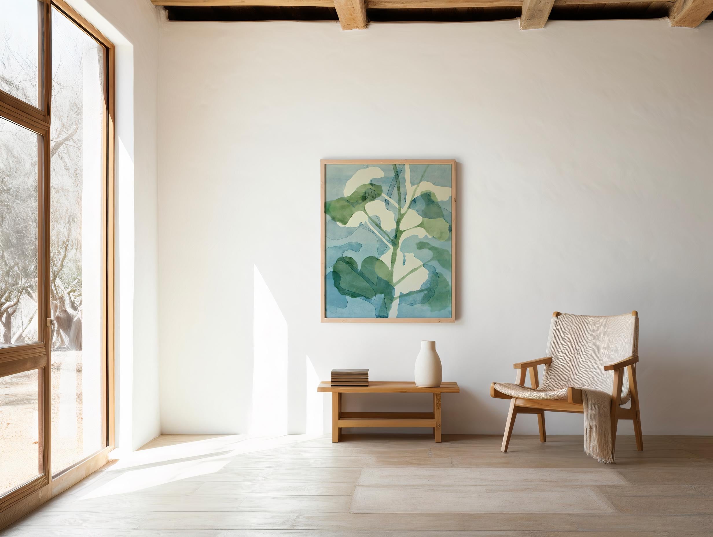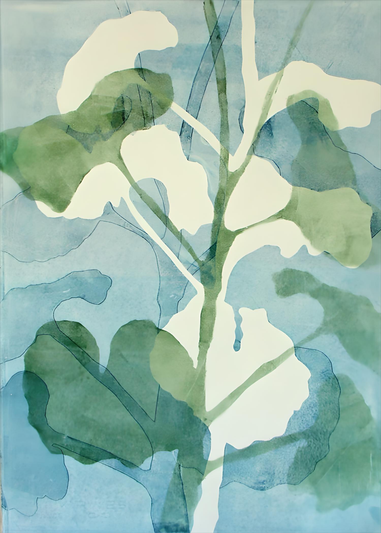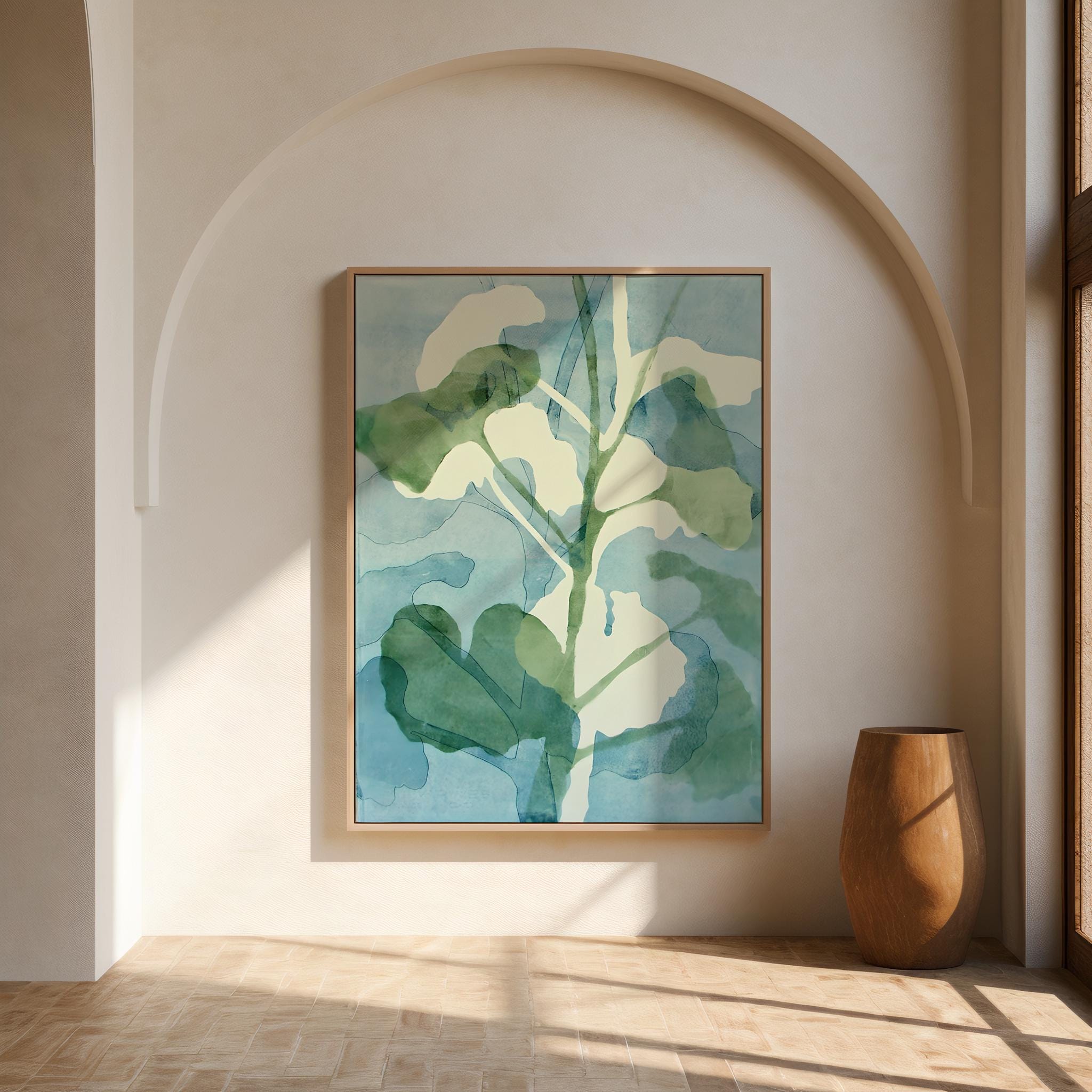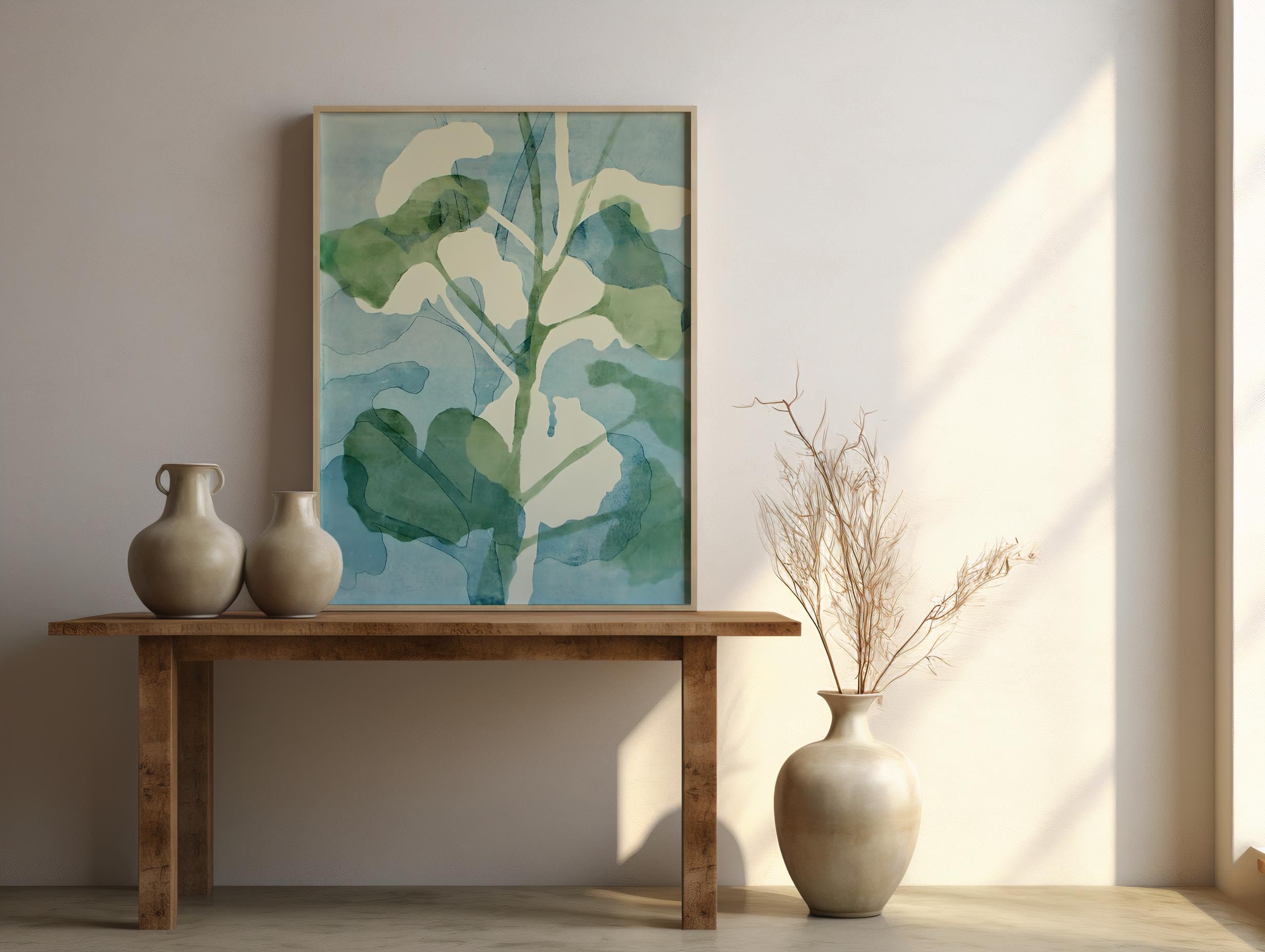 Bring serenity and natural elegance to your space with this minimalist botanical watercolor print — a digital artwork blending soft green leaves and translucent blue layers for a fresh, modern look. Perfect for art lovers who appreciate simplicity and organic design.
