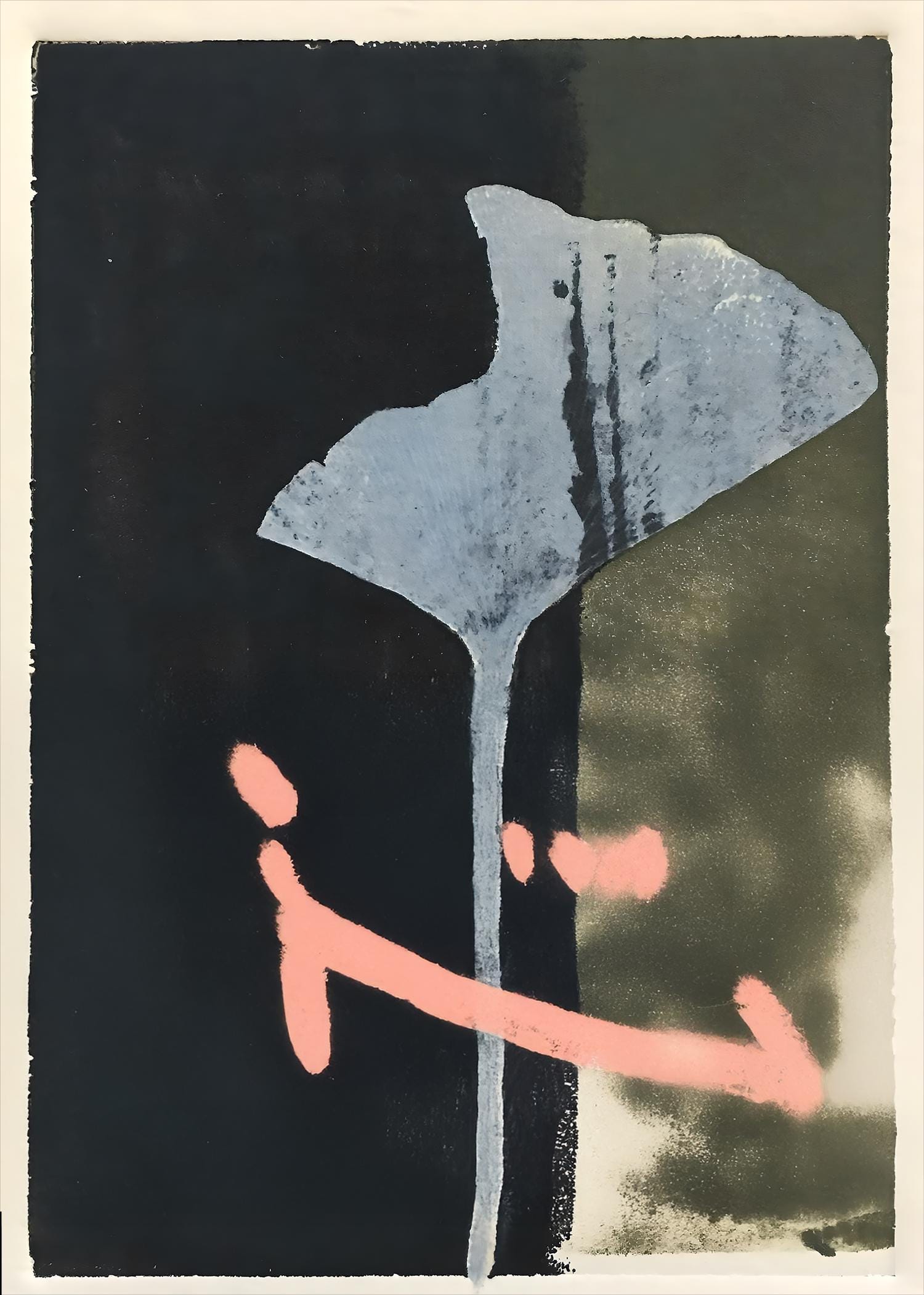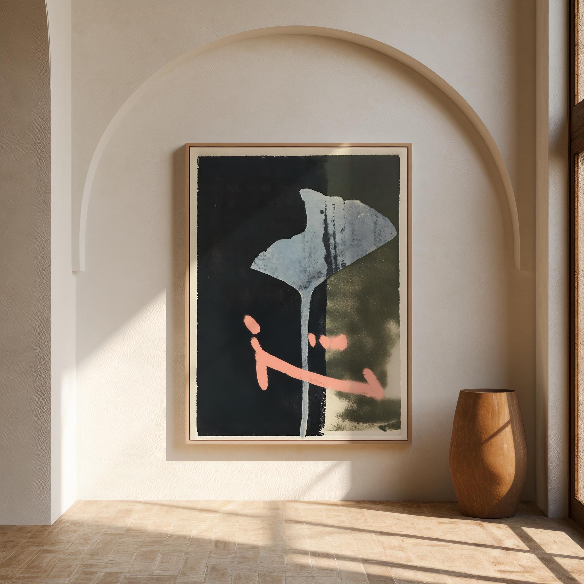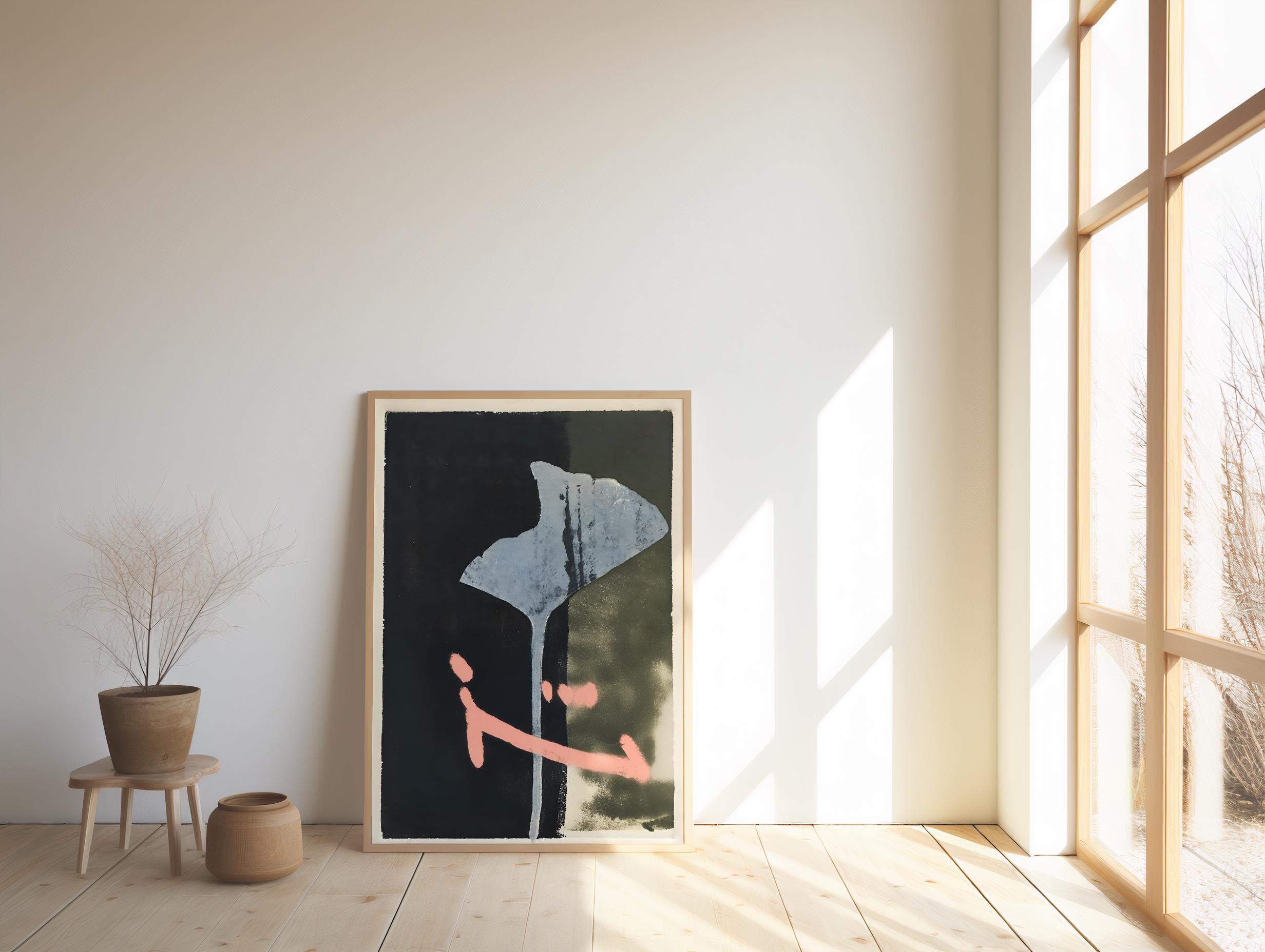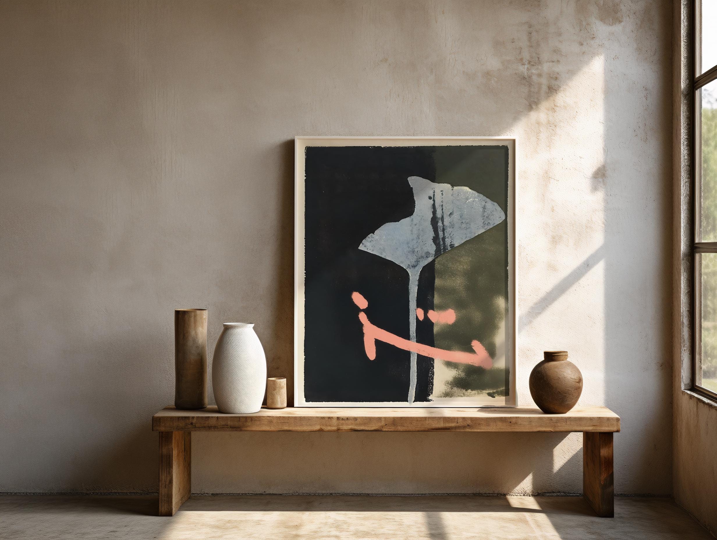 Transform your space with this modern abstract botanical print, featuring a bold ginkgo leaf silhouette in misty blue against a deep, moody background — accented by expressive coral brushstrokes. This digital download artwork captures elegance, texture, and emotion in one striking minimalist composition.