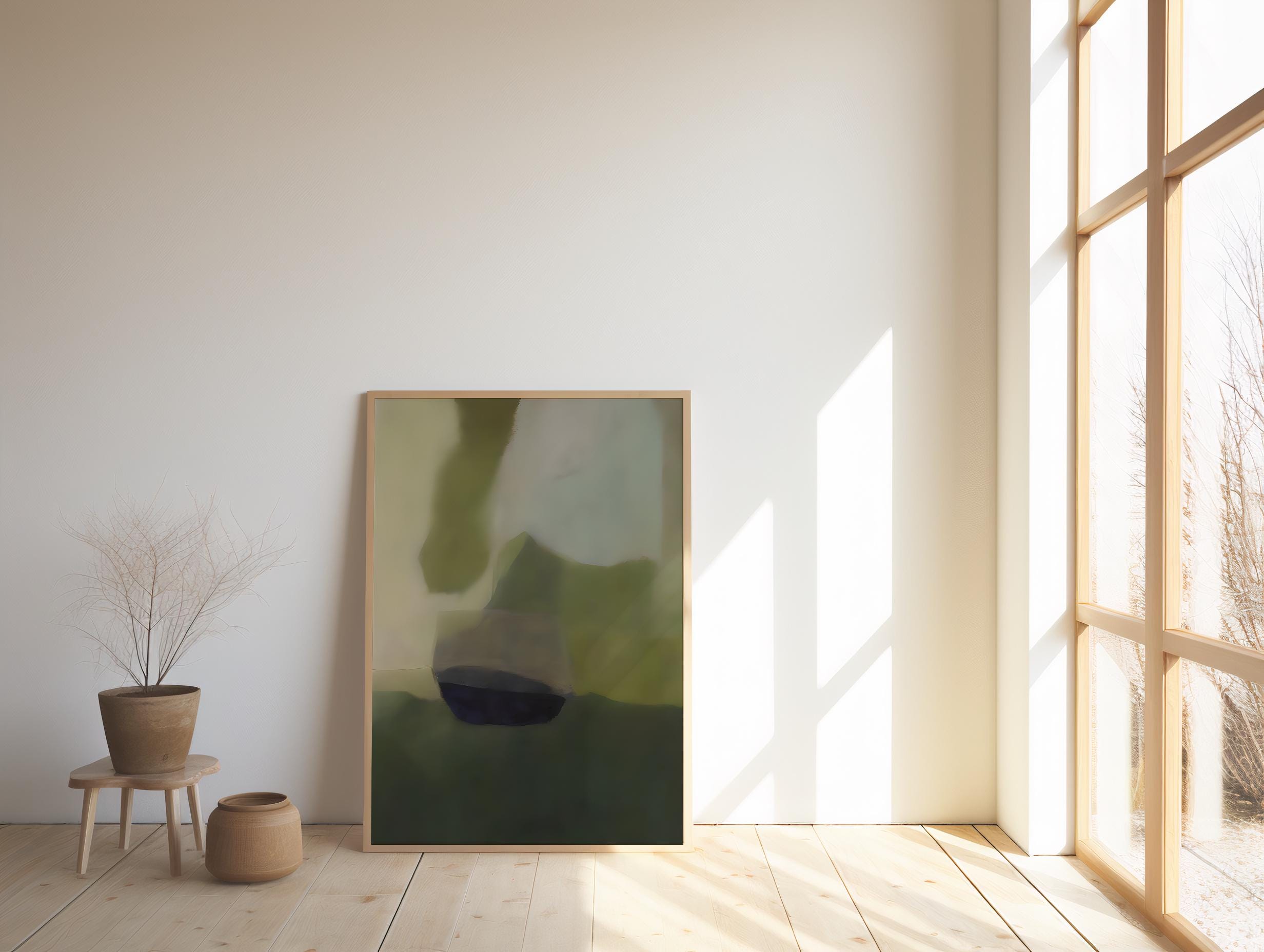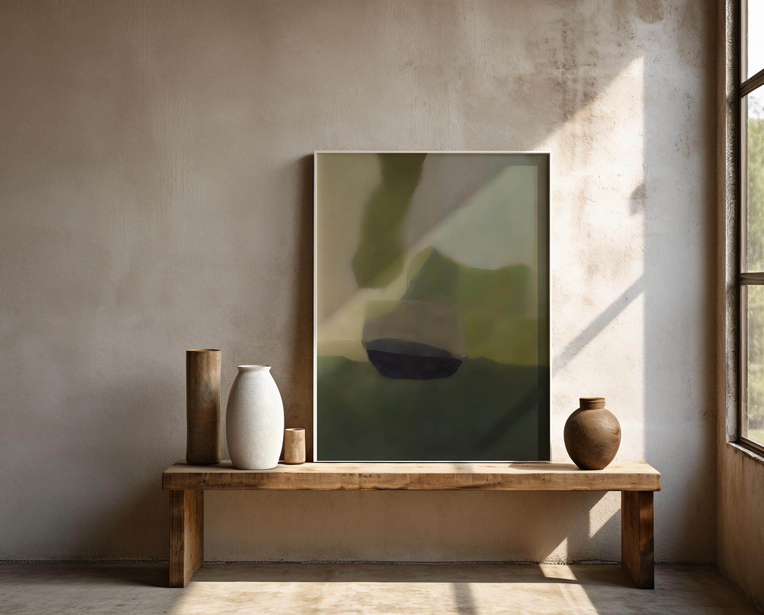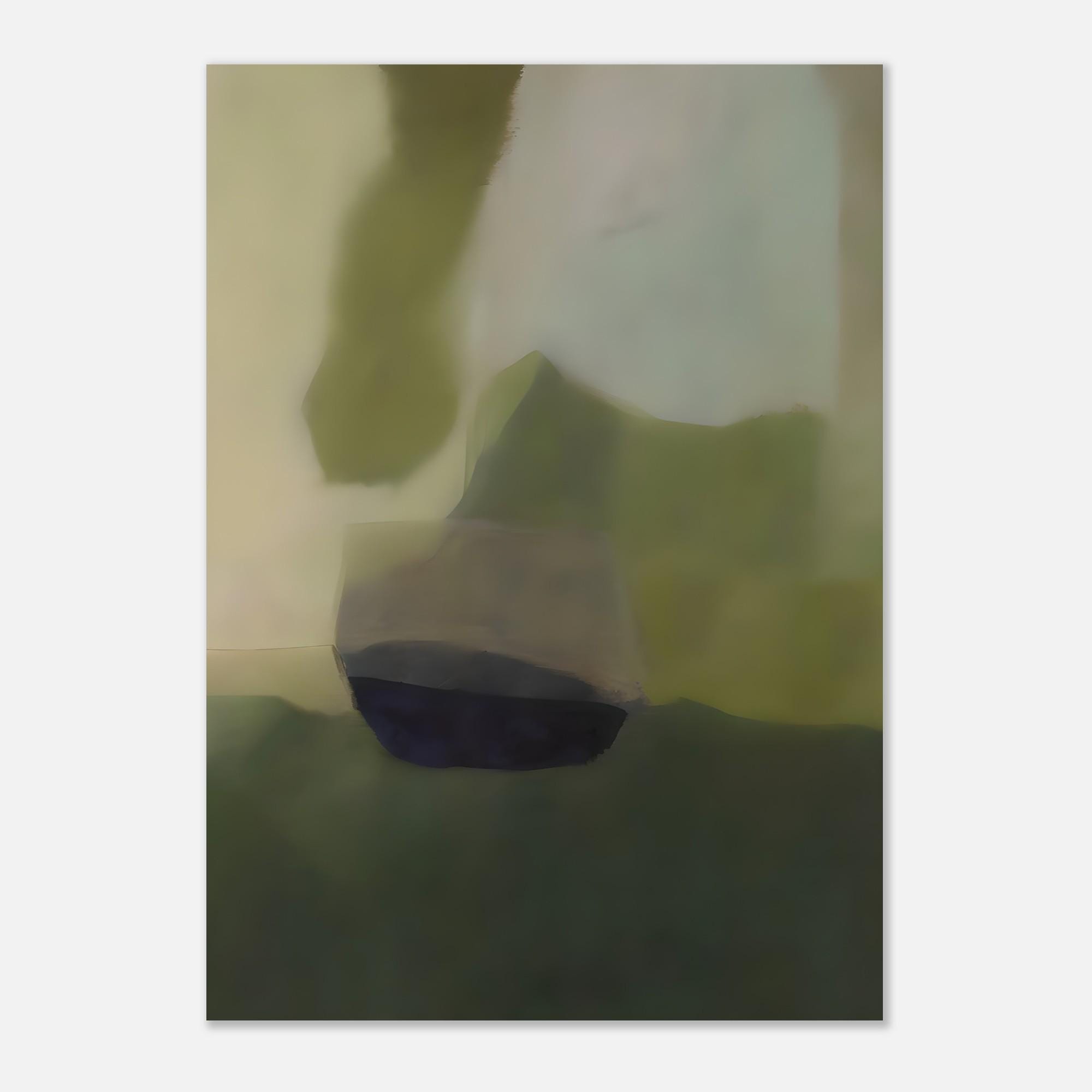 This abstract artwork features layered forms in olive green, moss, and muted earthy tones, creating a calm and atmospheric composition. The soft blending of shapes and colors evokes a subtle landscape-like feeling while maintaining a modern abstract aesthetic.