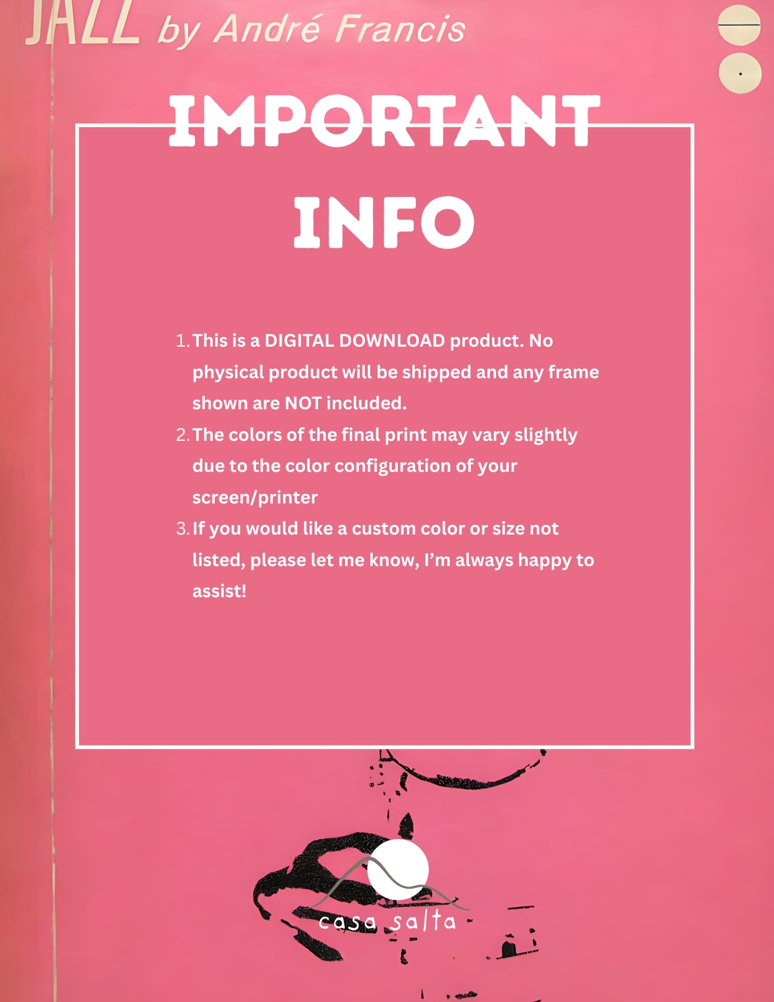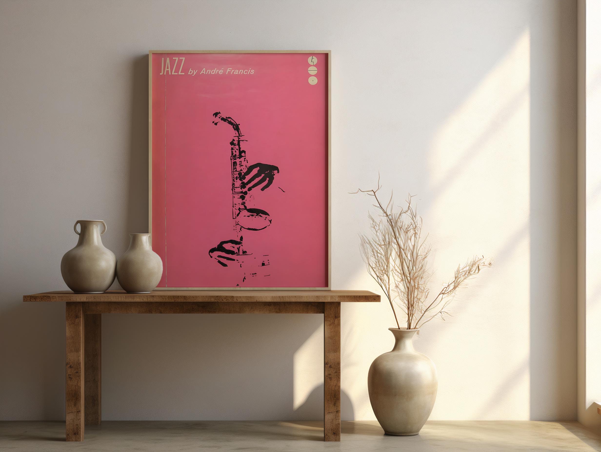Add bold rhythm and color to your space with this Vintage Jazz Poster Print — a striking pink and black minimalist artwork inspired by mid-century music design. Featuring a saxophone silhouette and expressive typography, this piece captures the soul of jazz with modern sophistication.