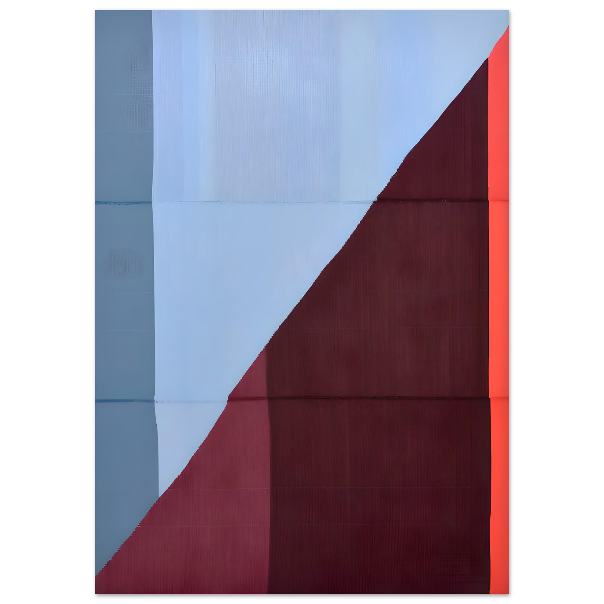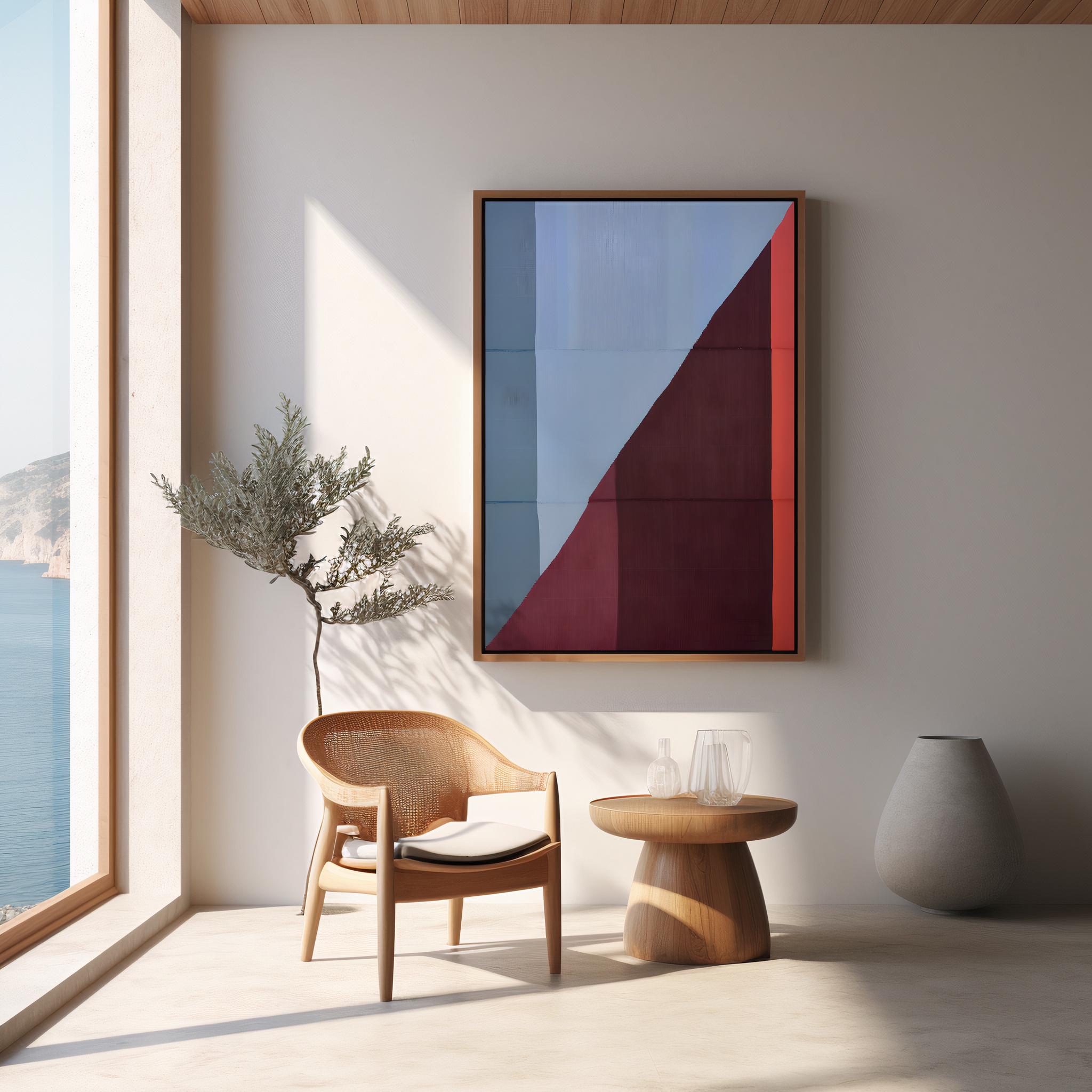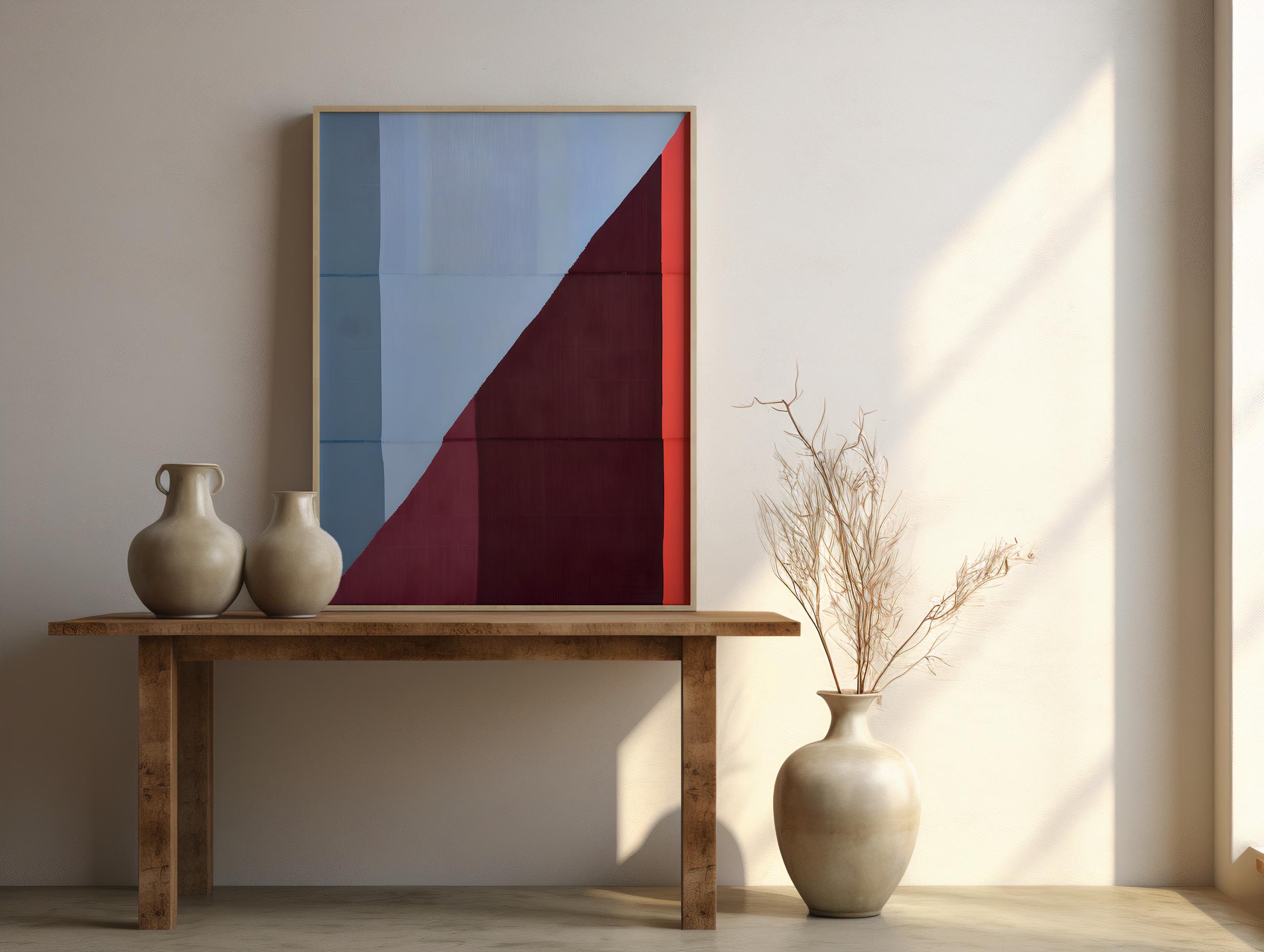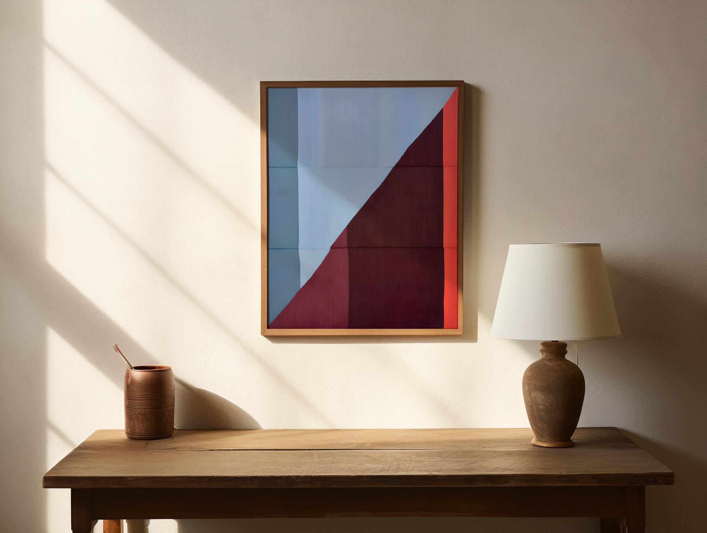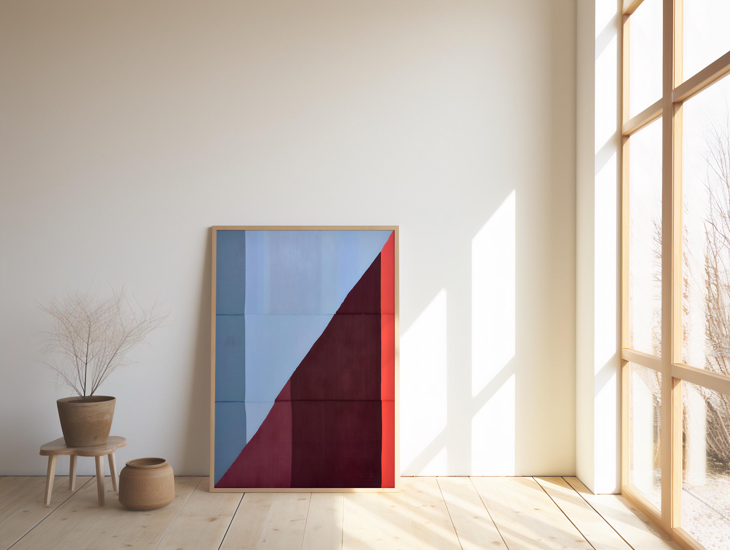 A striking modern abstract composition featuring bold geometric blocks of deep wine red, muted blue, and warm coral. The clean diagonal division creates balance and tension, evoking a mid-century minimalist aesthetic. Perfect for contemporary interiors, offices, or design-forward spaces that appreciate fine color harmony and simplicity.