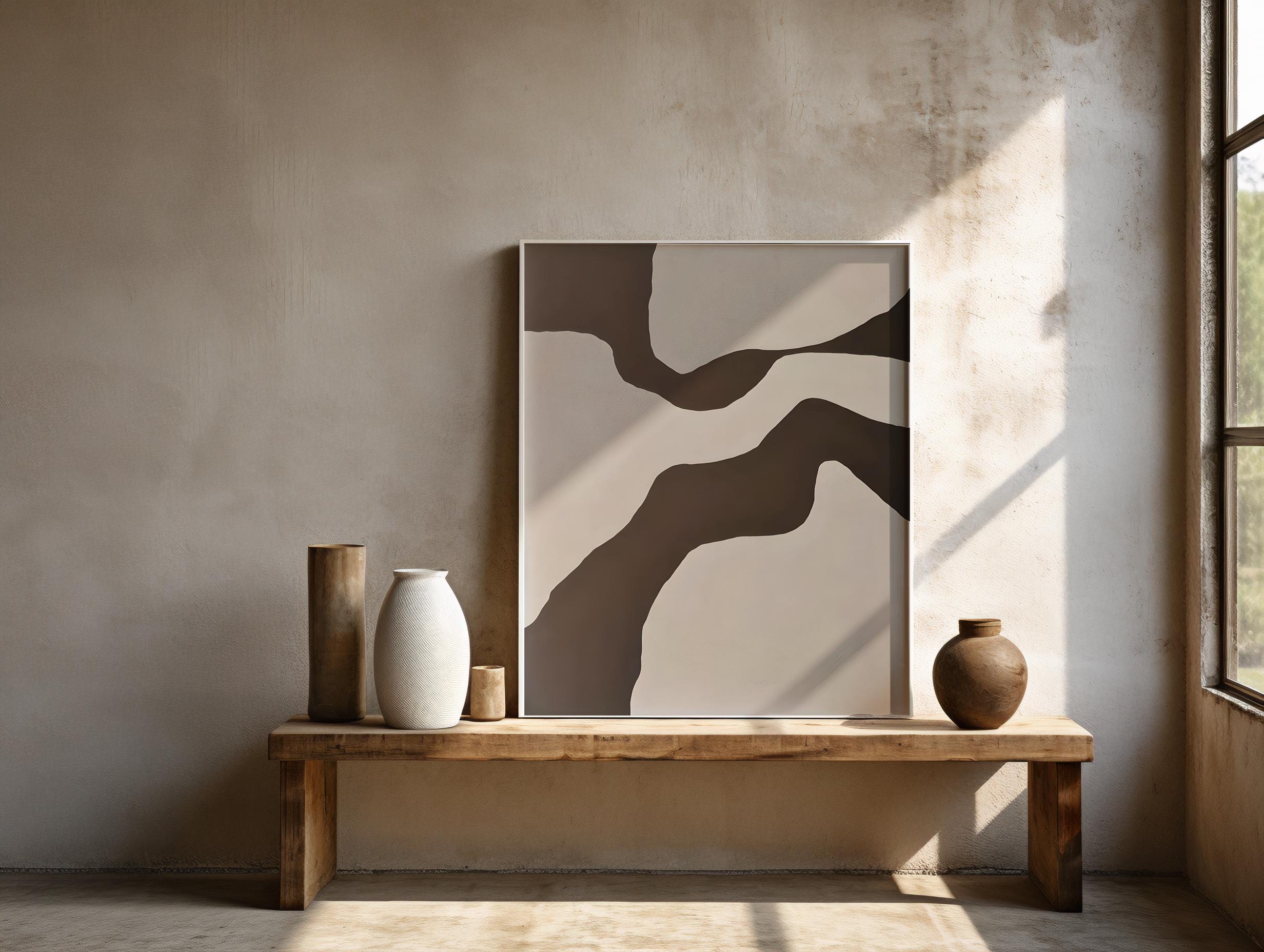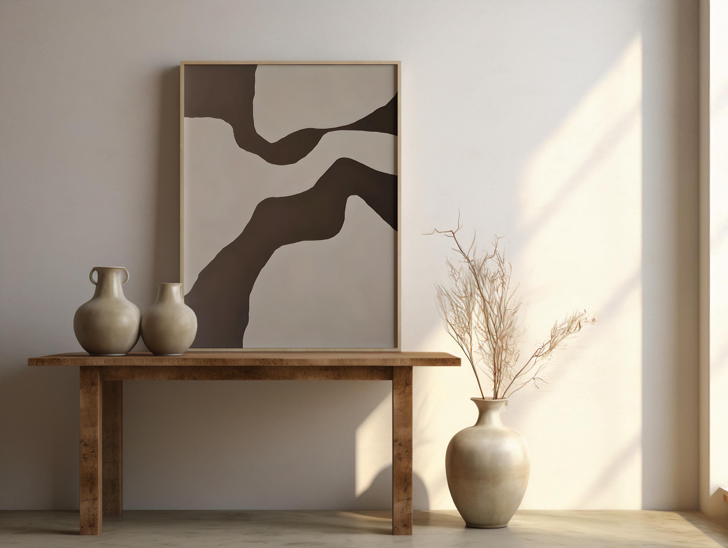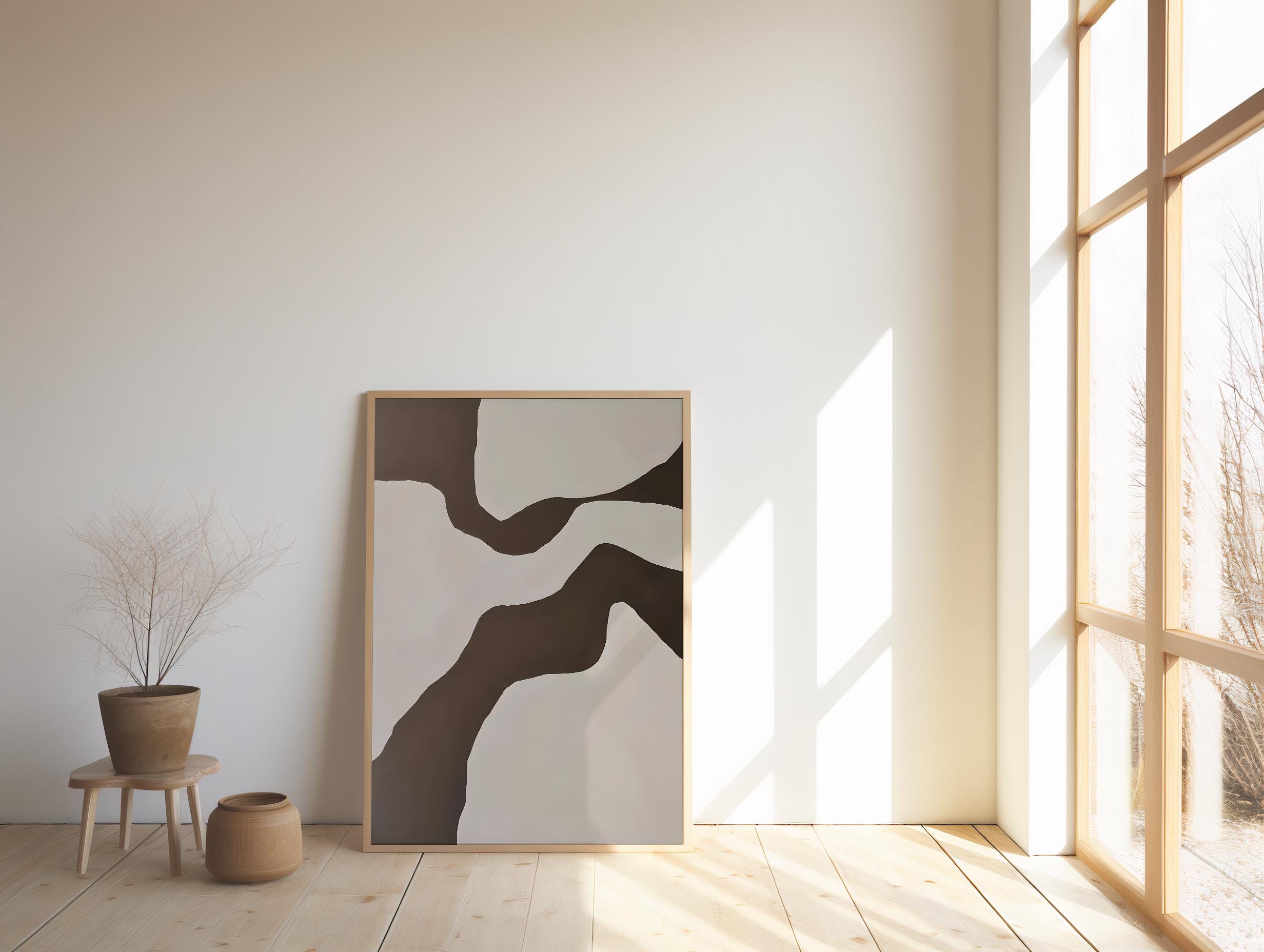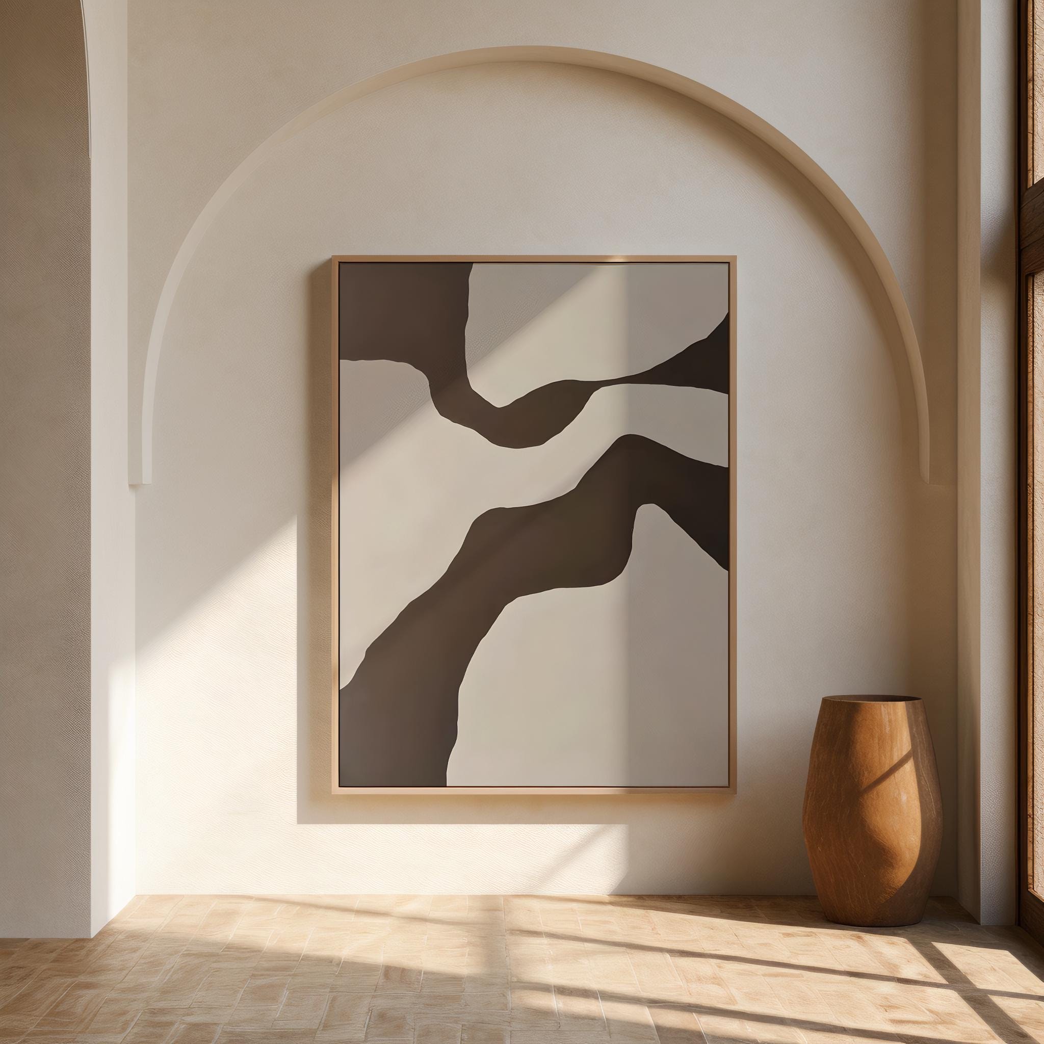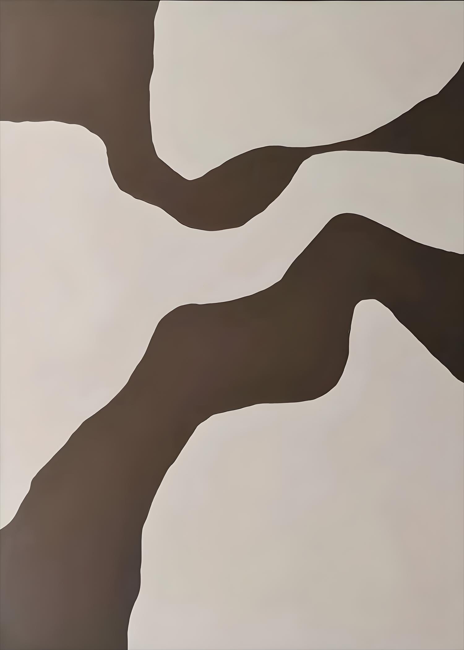 Abstract, organic-shape artwork featuring smooth brown flowing forms against a soft beige background. Minimal, warm, modern. Ideal for living rooms, bedrooms, offices, and neutral interior palettes.