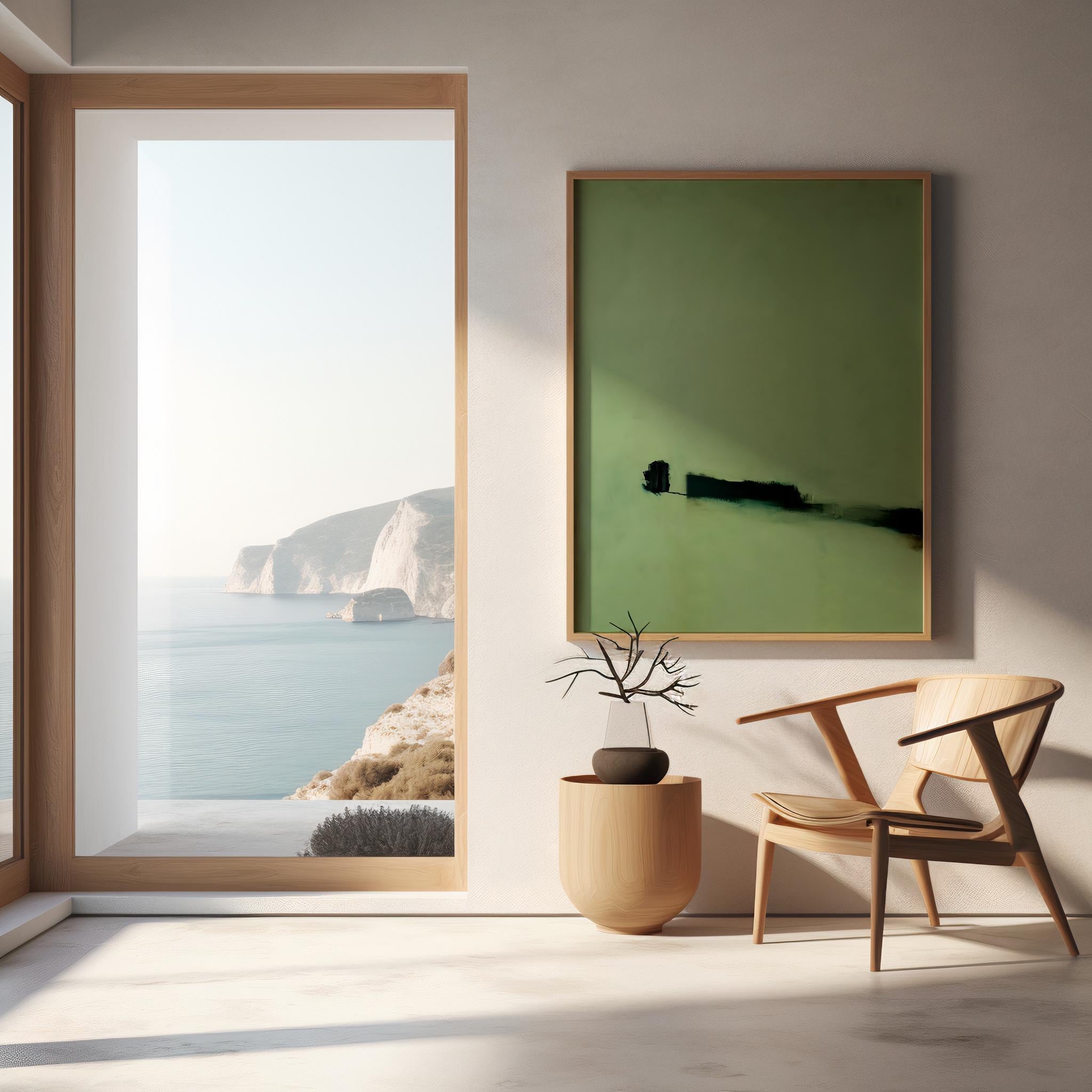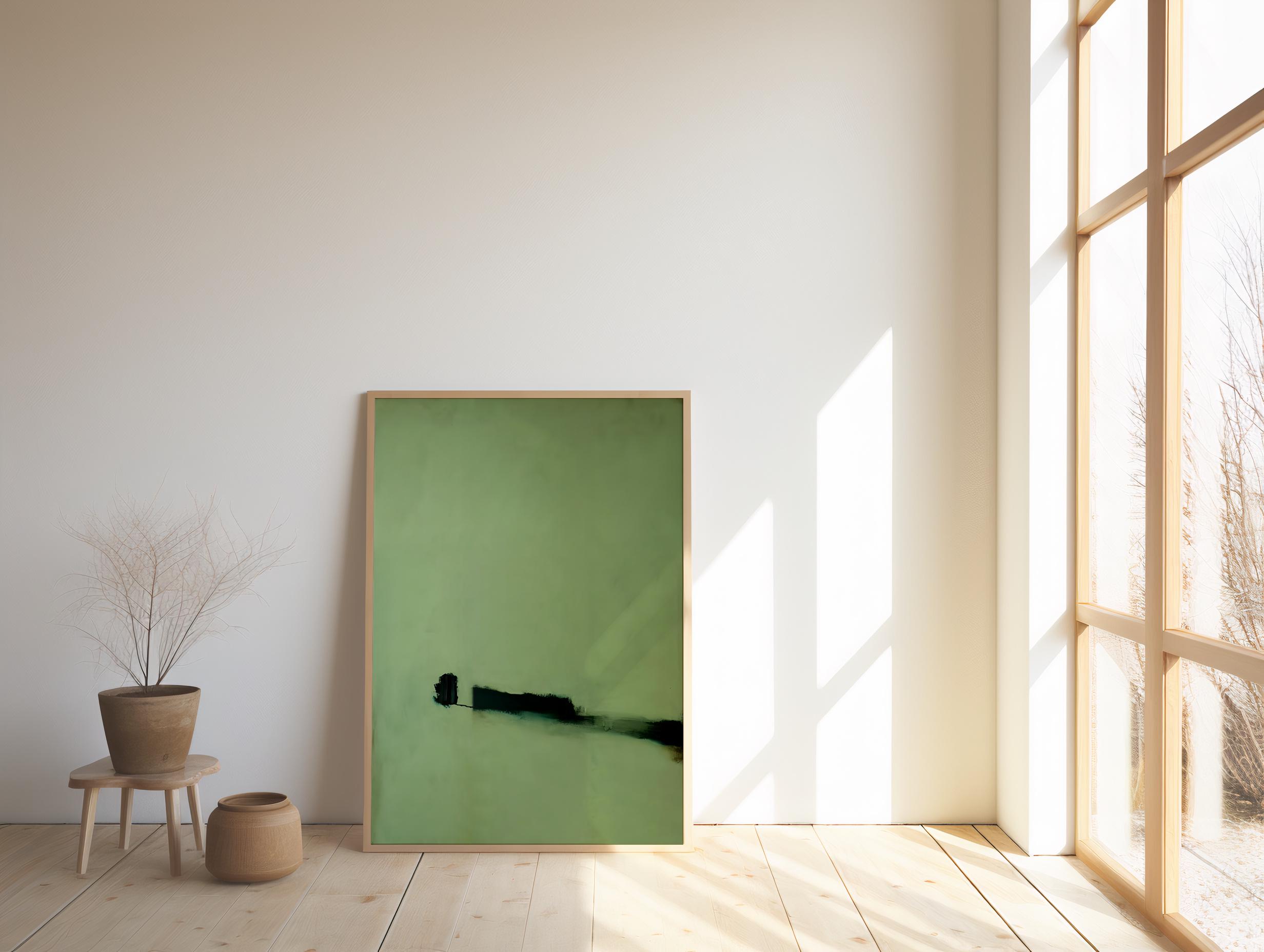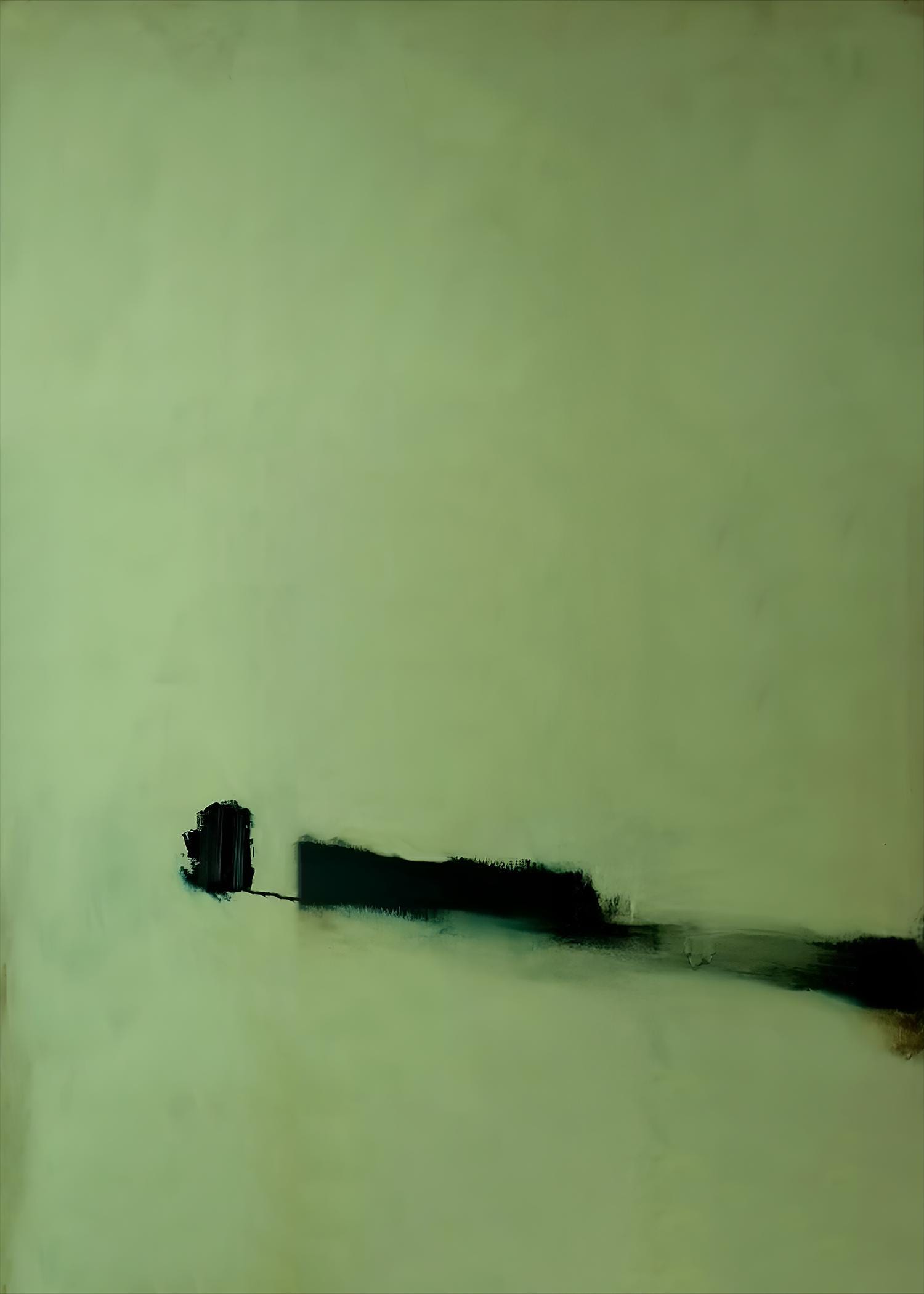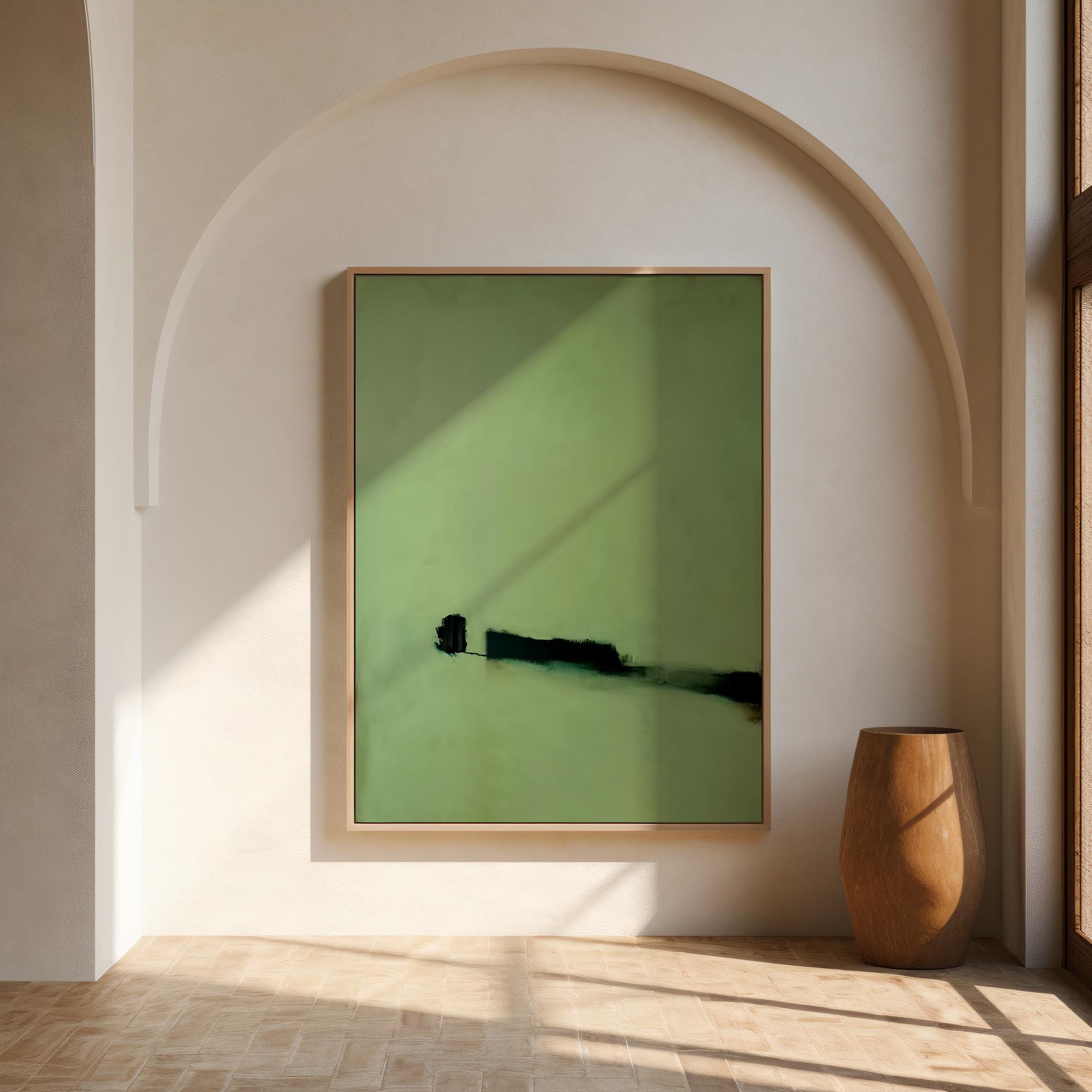 This piece features a soft green abstract field with a single deep, brush-textured stroke stretching across the lower portion of the composition. The contrast between the calm green atmosphere and the dark, inky horizontal mark creates a serene, meditative landscape effect—suggestive of horizon lines, distant land forms, or minimalist nature scenes.