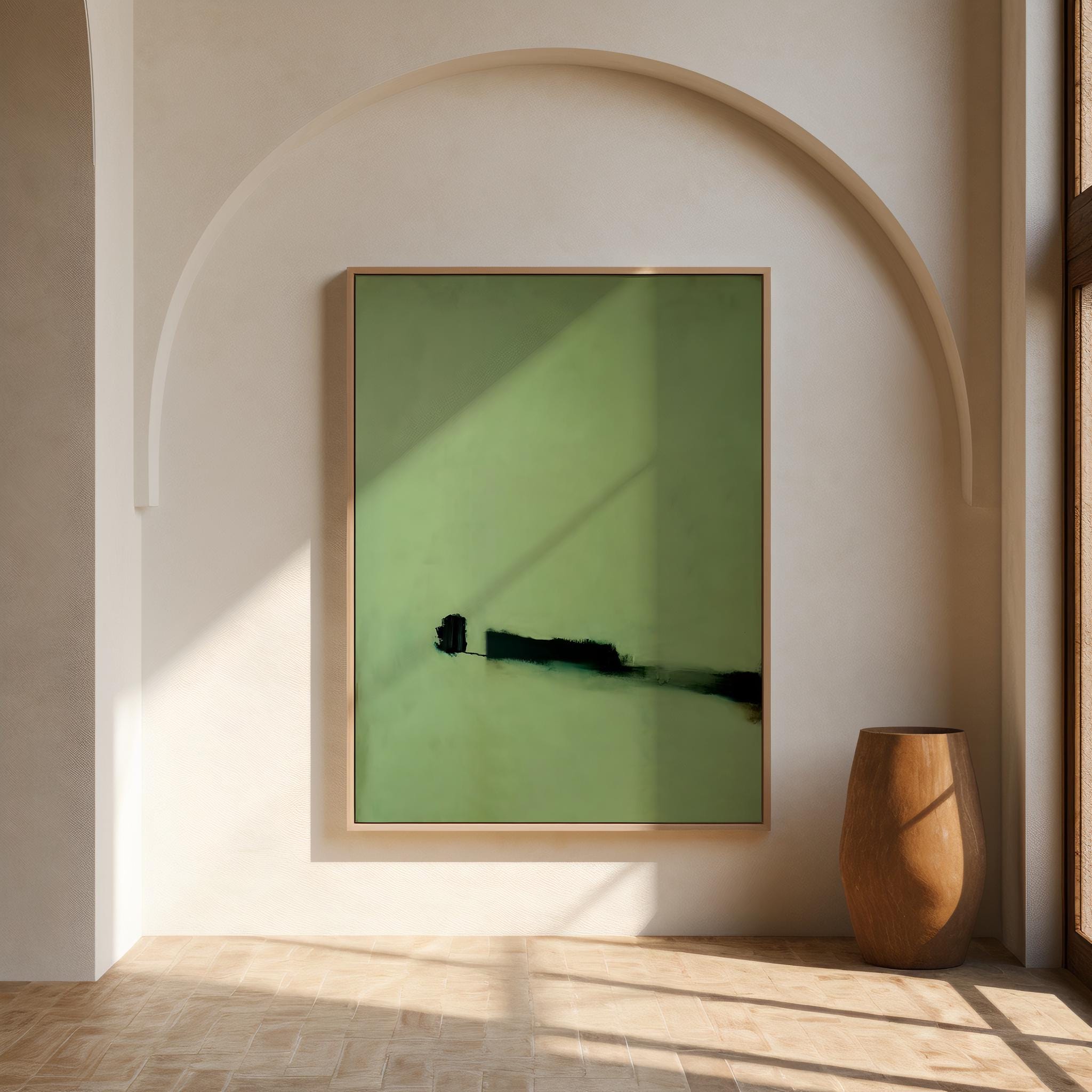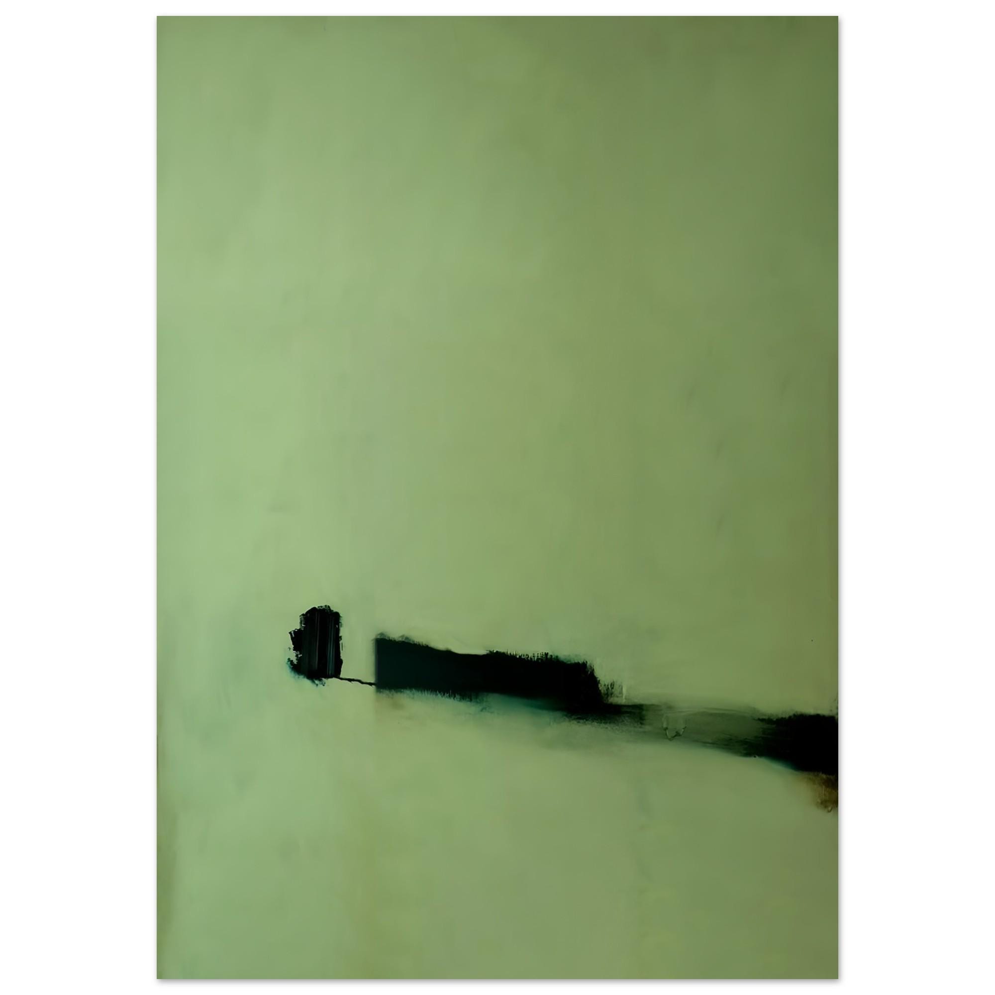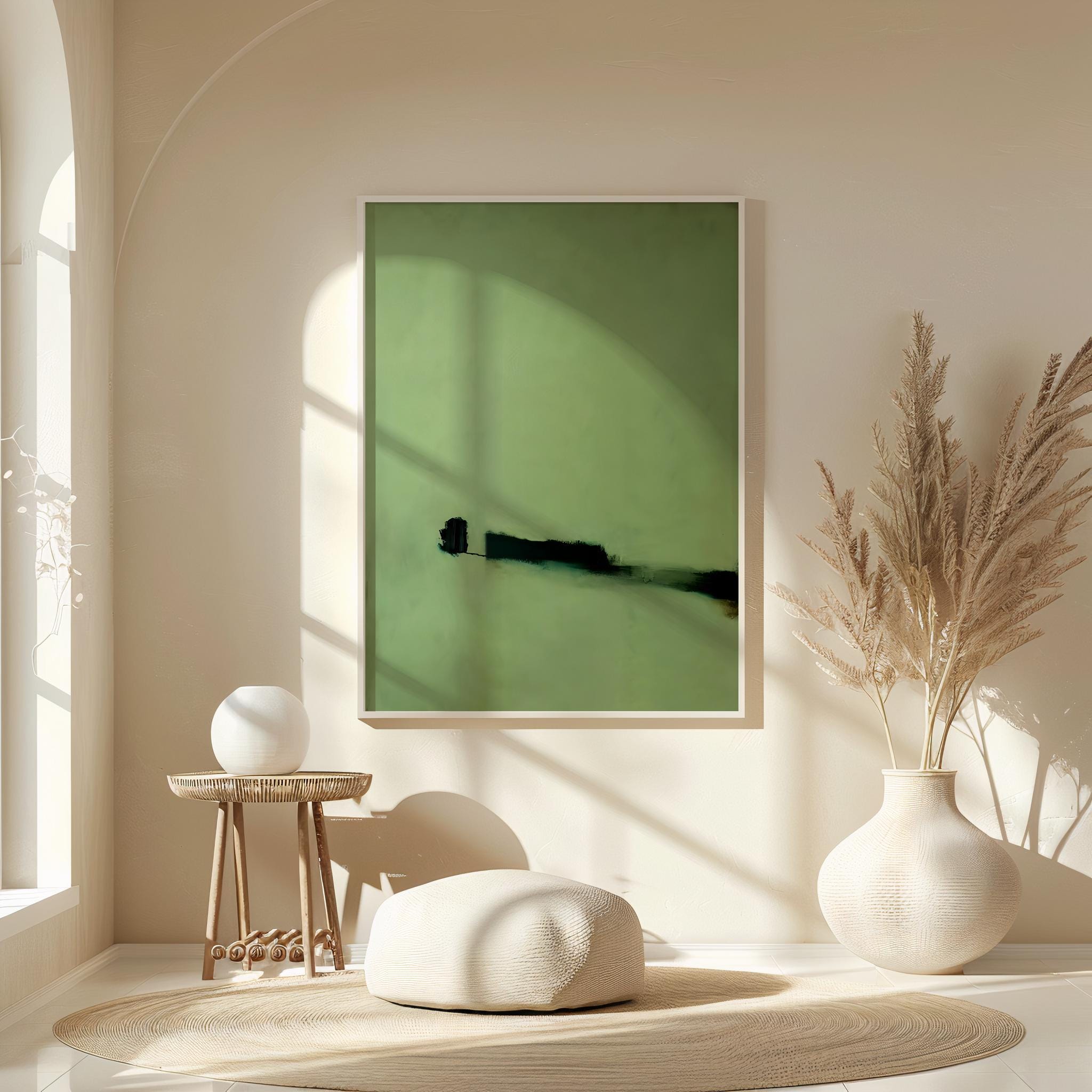This fine art poster showcases a soft green abstract expanse with a deep, painterly brushstroke stretching quietly across the lower field. The subtle texture, layered pigments, and atmospheric blending create a minimalist landscape effect—evoking horizon lines, earth, and open space. The composition is calm, modern, and museum-style, making it ideal for elevated interiors.