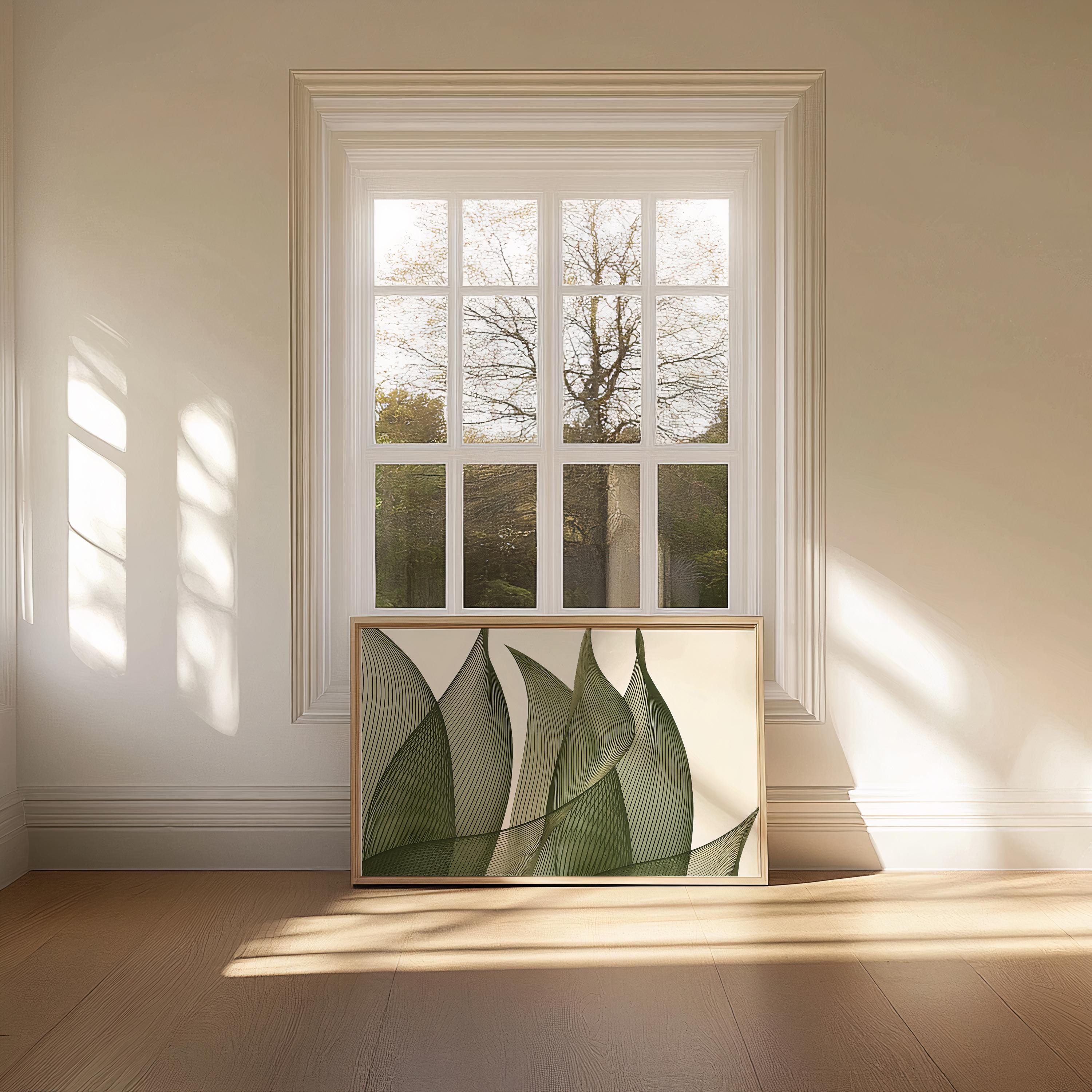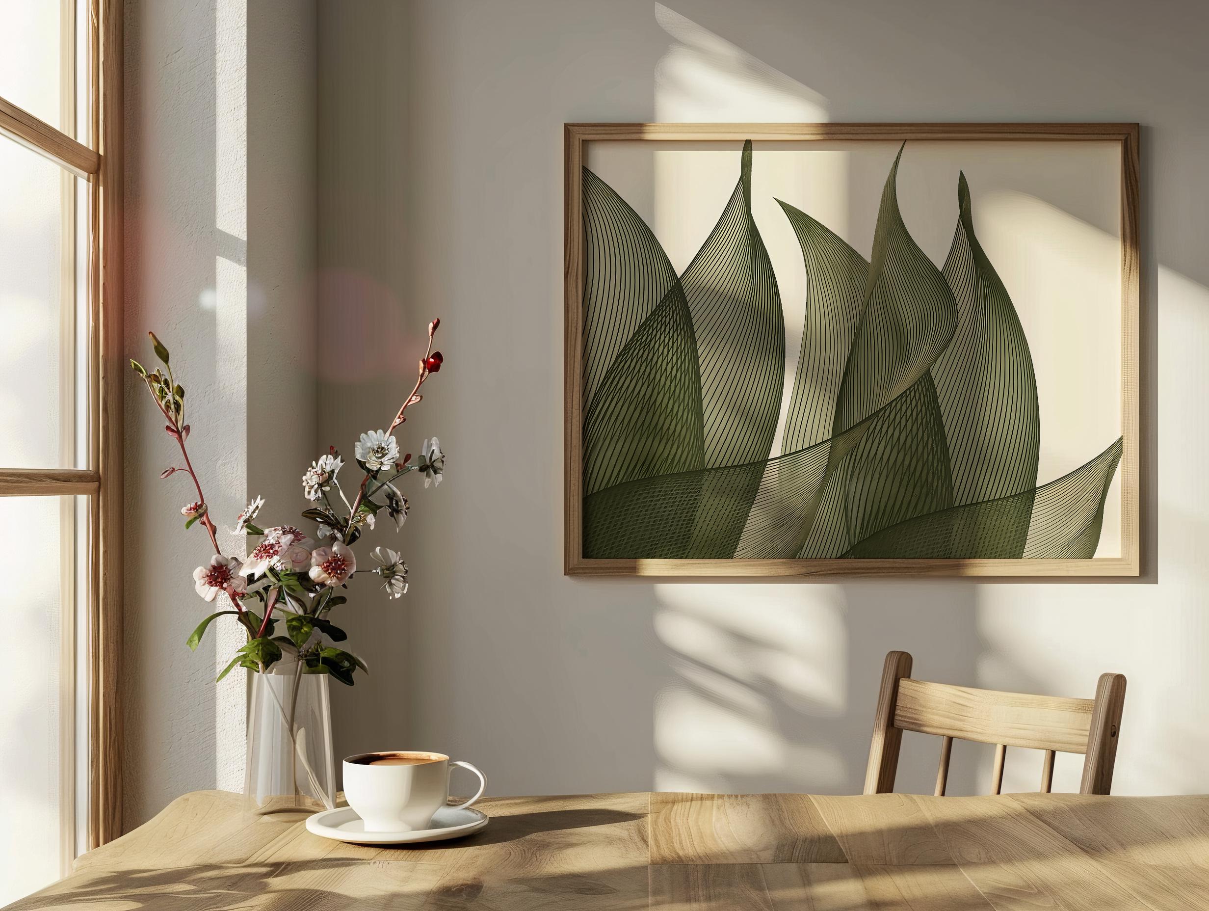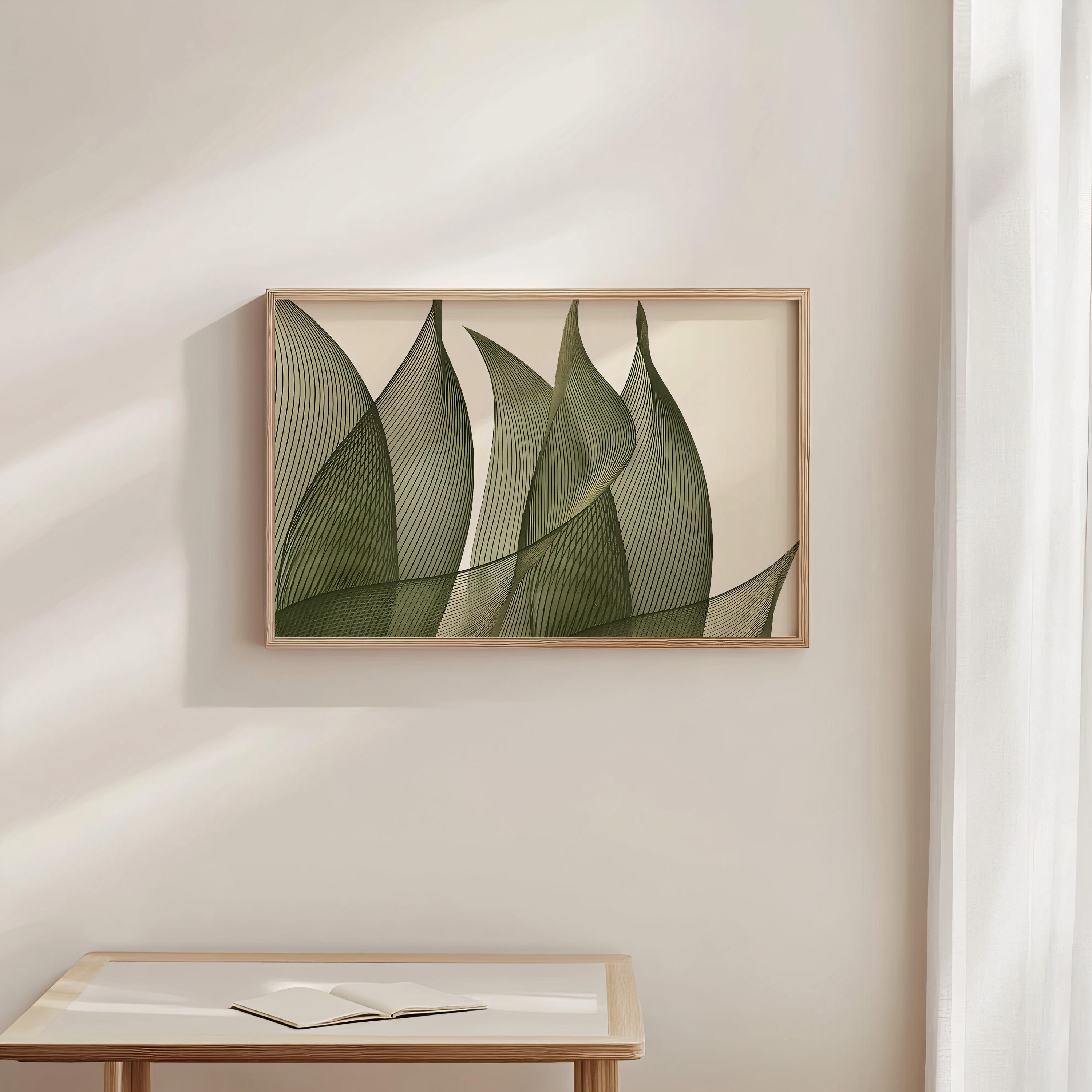 This artwork was originally created as a custom piece for a client, who requested one of our best-selling vertical designs to be reimagined in a horizontal format. The result is a beautifully expanded composition that keeps the essence of the original—bold, flowing sage-green leaves with fine linear detail—while offering a wider, more sculptural layout perfect for larger wall spaces.