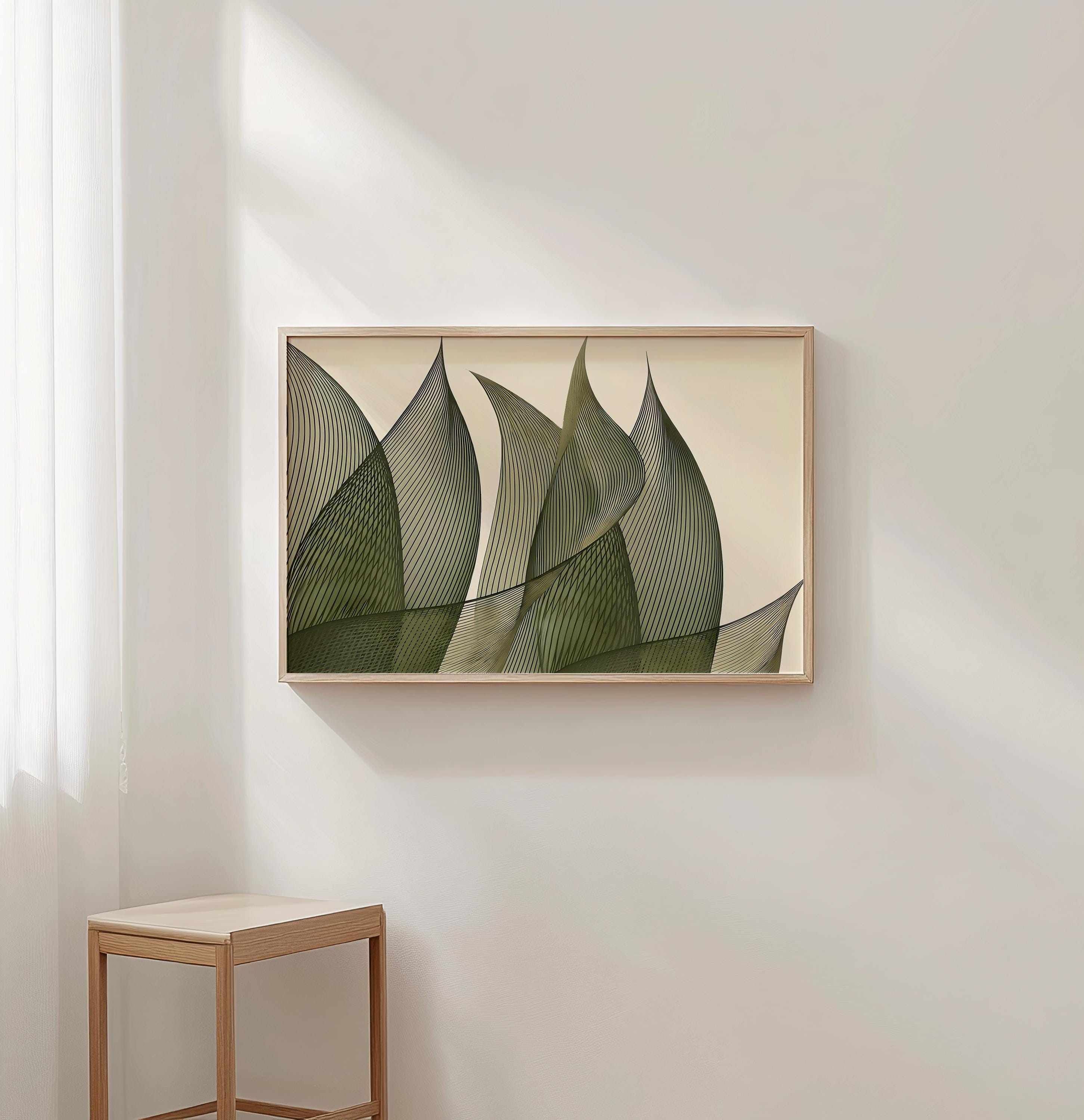 An organic botanical abstract artwork featuring flowing leaf-inspired forms in layered olive green and soft neutral tones. Fine linear detailing and sculptural shapes create a sense of movement and depth, blending natural elements with a modern, architectural feel. Designed to bring calm, balance, and refined greenery into contemporary, minimalist, and design-forward interiors.