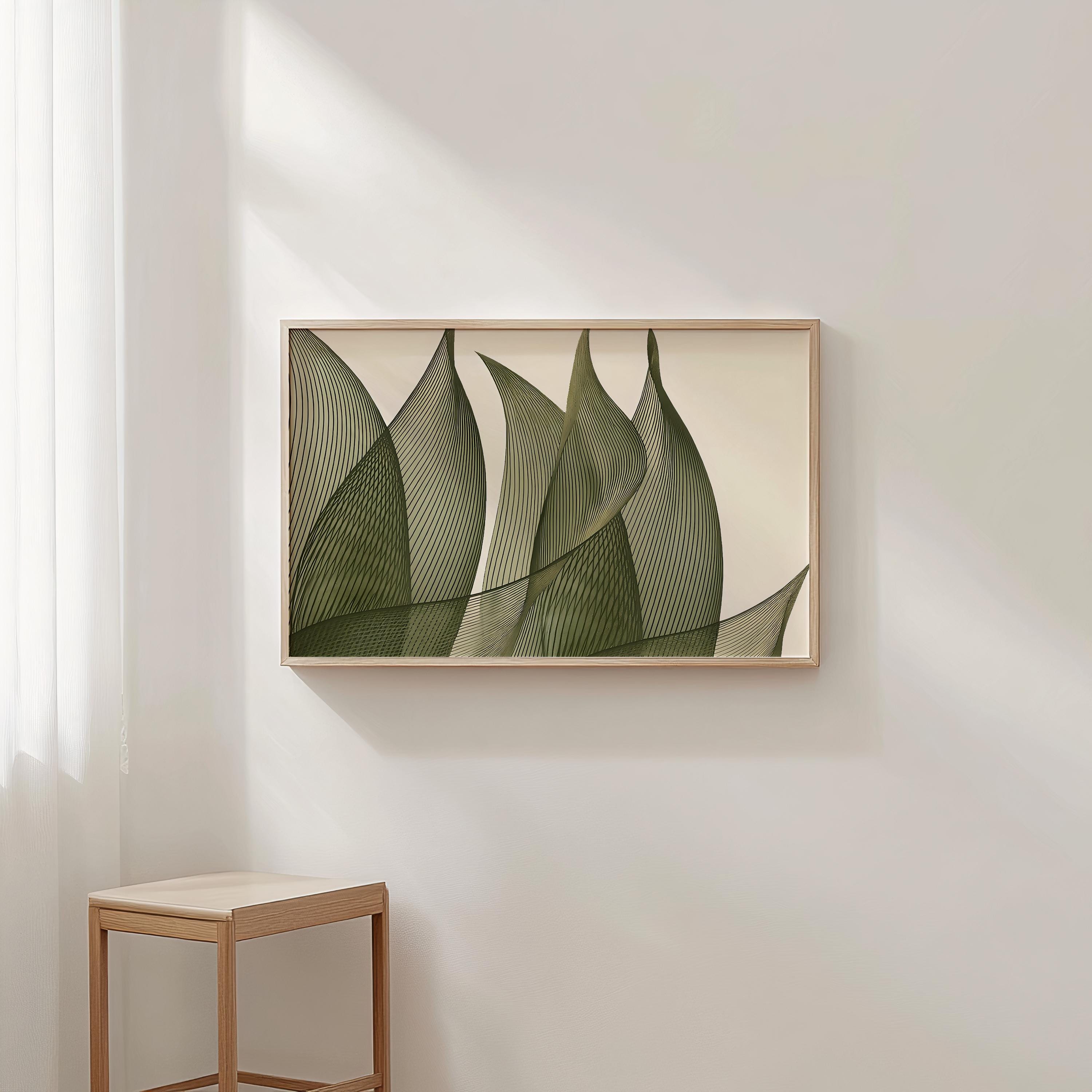 This artwork was originally created as a custom piece for a client, who requested one of our best-selling vertical designs to be reimagined in a horizontal format. The result is a beautifully expanded composition that keeps the essence of the original—bold, flowing sage-green leaves with fine linear detail—while offering a wider, more sculptural layout perfect for larger wall spaces.