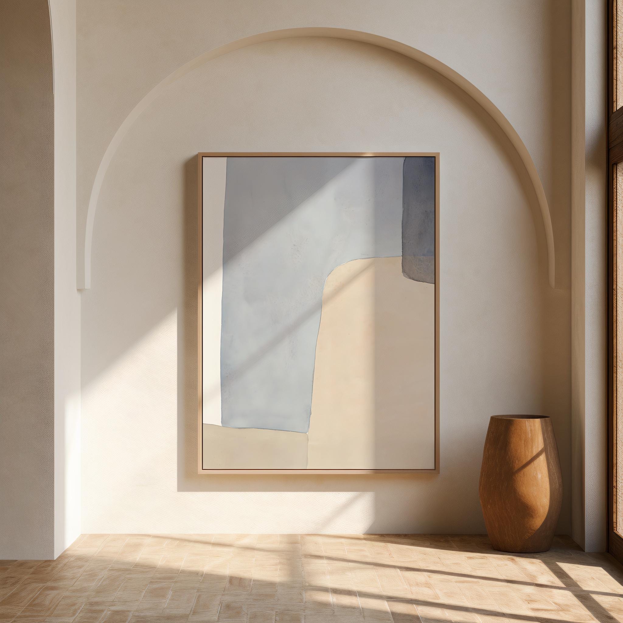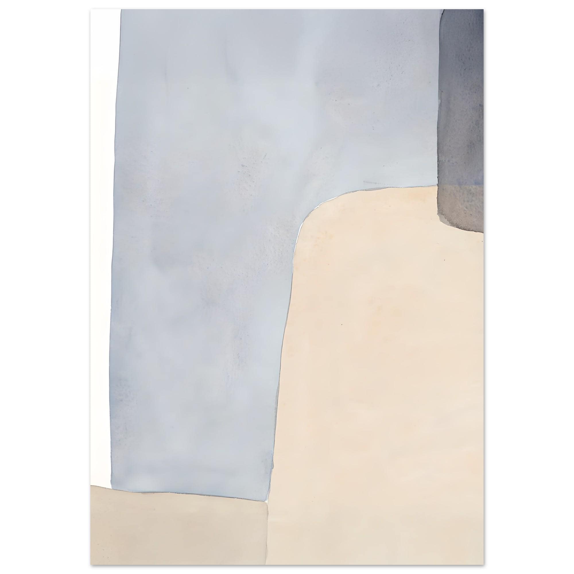 A calming minimalist abstract artwork featuring soft blue and warm beige forms, painted with gentle texture and watercolor-style gradients. The composition is clean, modern, and airy — perfect for neutral interiors, Scandinavian decor, and serene bedroom or living room spaces.