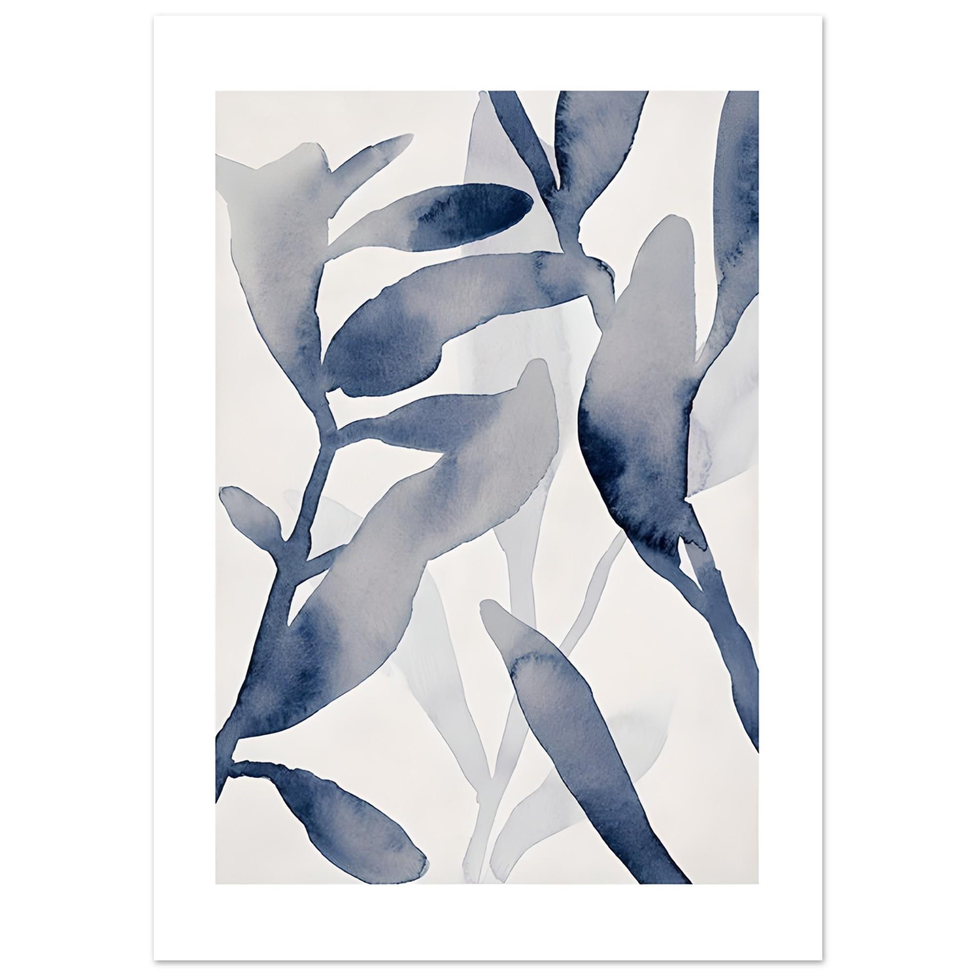 This artwork features elegant, flowing leaf-like forms painted in rich shades of indigo and dusty blue. The beautiful transparency and layering effect of the watercolor medium create depth and an organic feel against a soft, neutral background. Its minimalist and sophisticated design embodies a sense of calm and natural beauty.