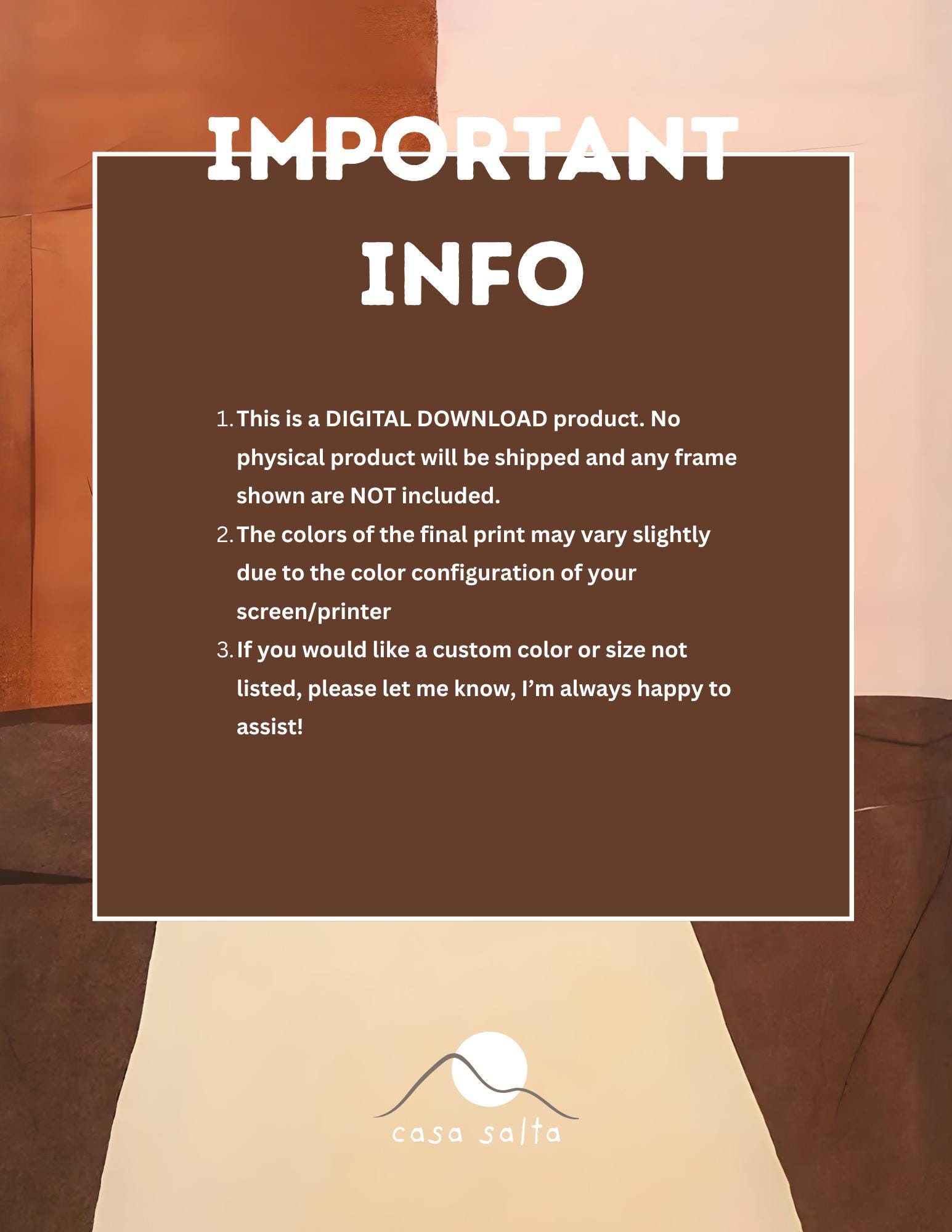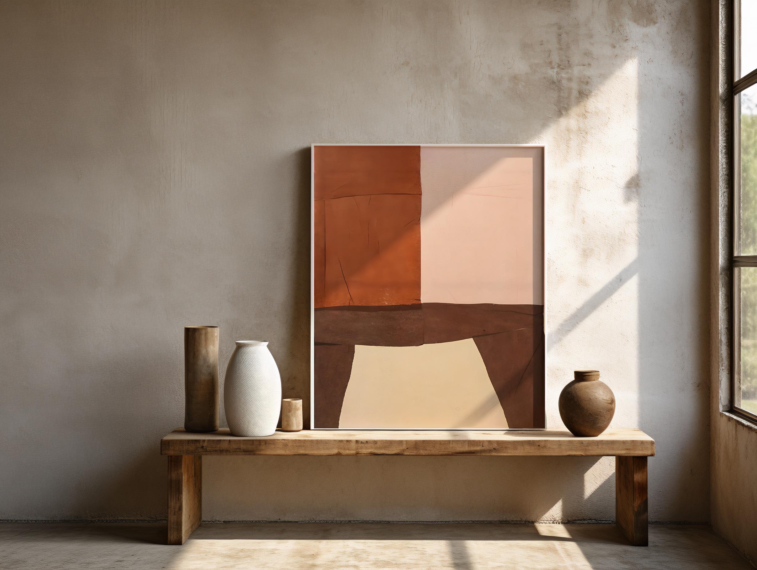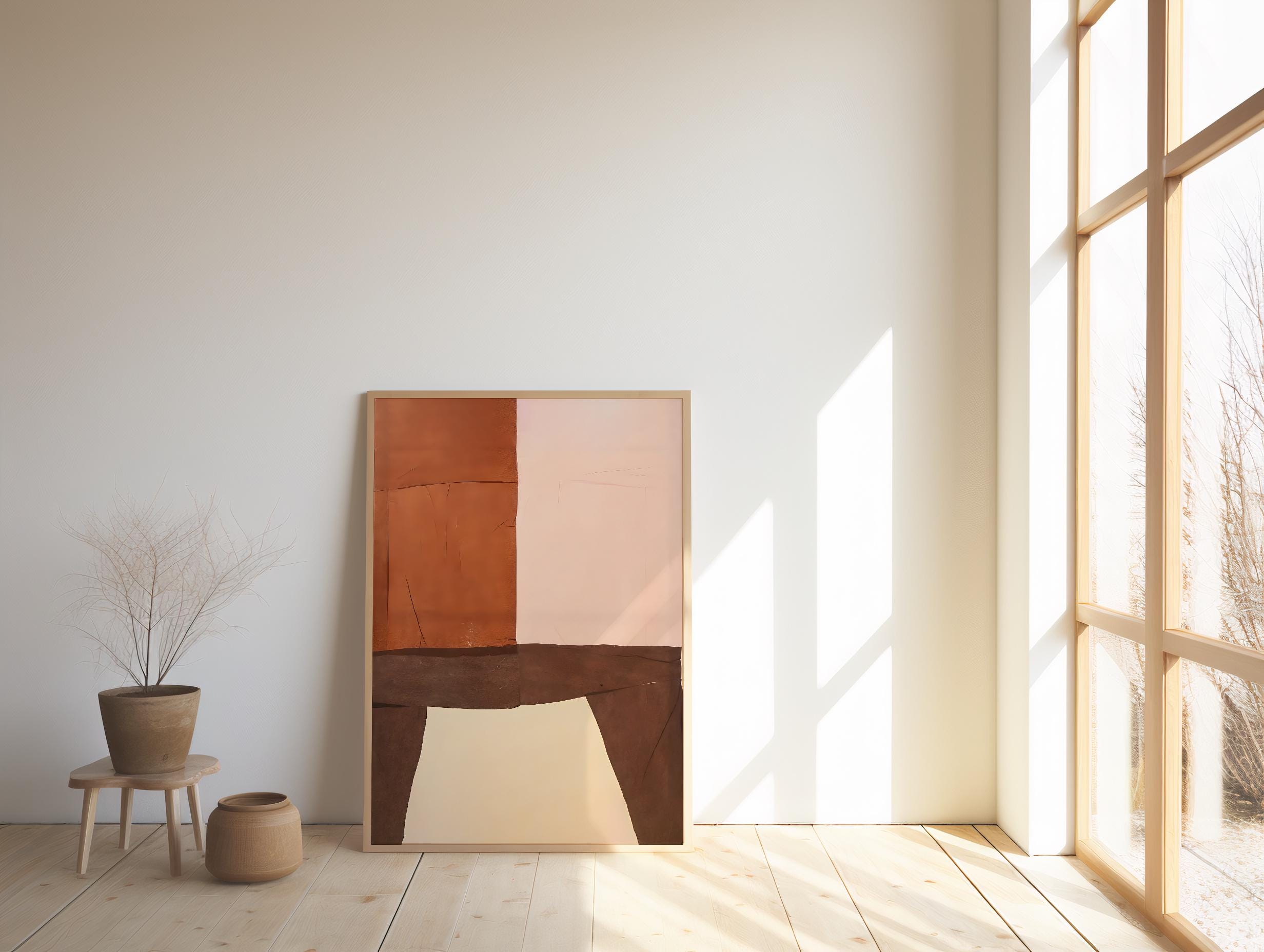 This warm, earth-tone abstract artwork features layered terracotta, clay, rust brown, and soft neutral beige shapes. The textured, minimal composition adds depth and warmth, perfect for modern interiors, boho homes, earthy neutrals, and contemporary décor. As a digital download, you can print it instantly at home, through a local print shop, or online.