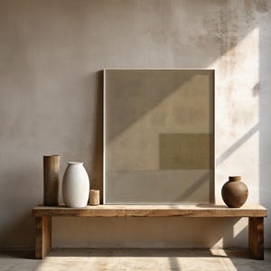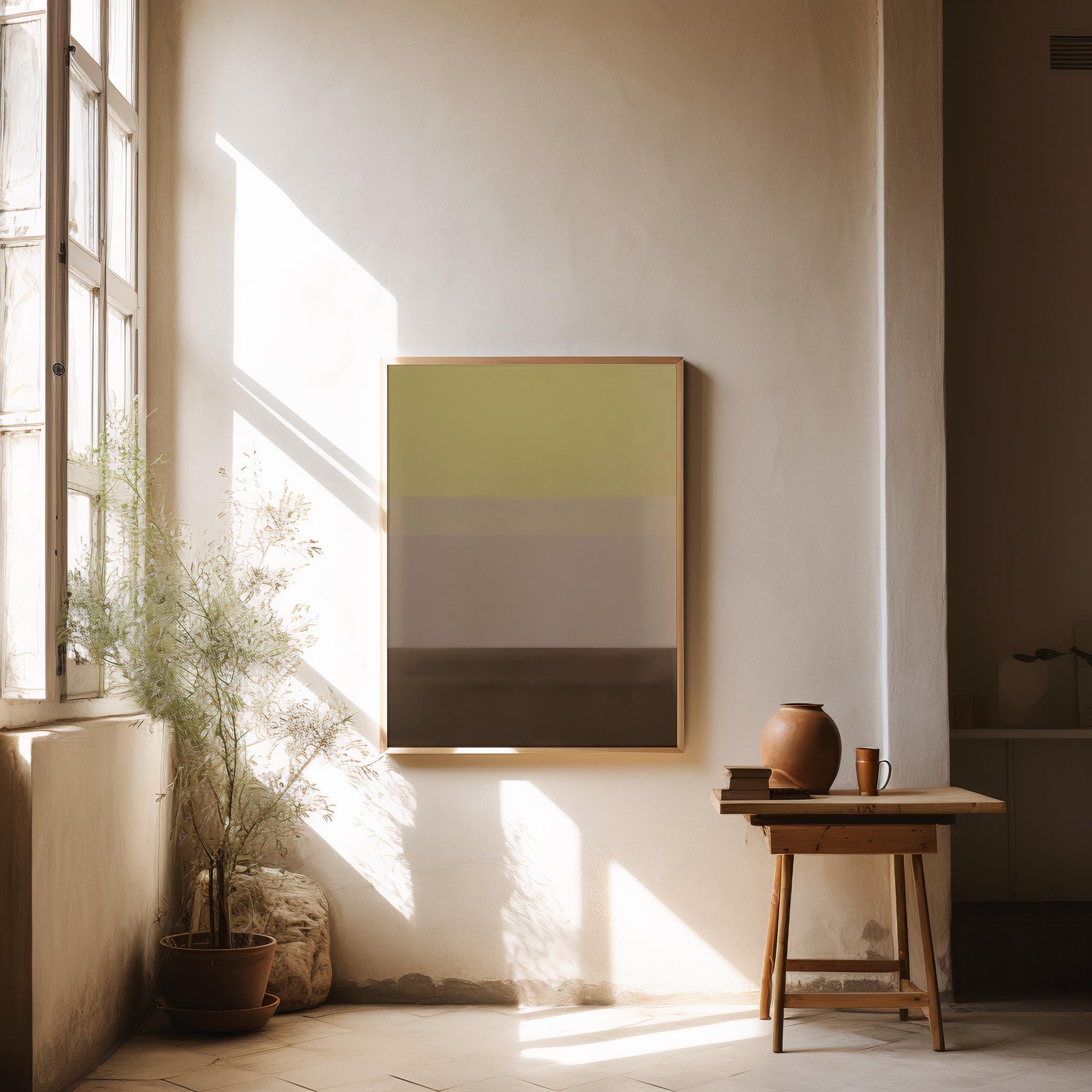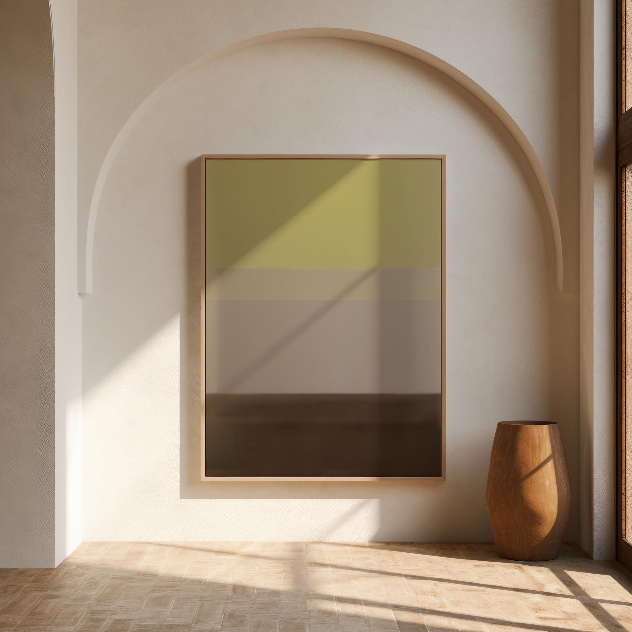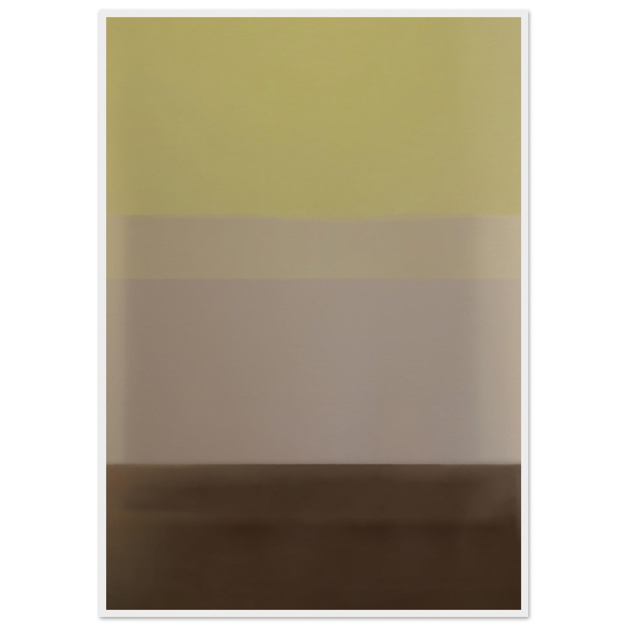 This framed poster features a soft color-block abstract design with a gentle yellow upper field, warm neutral mid-tones, and a deep brown grounding base. The smooth transitions and calming palette create a modern, minimalist aesthetic perfect for contemporary, Japandi, warm-neutral, and clean interior spaces. Professionally printed and framed, it arrives ready to hang—an effortless way to elevate any room.