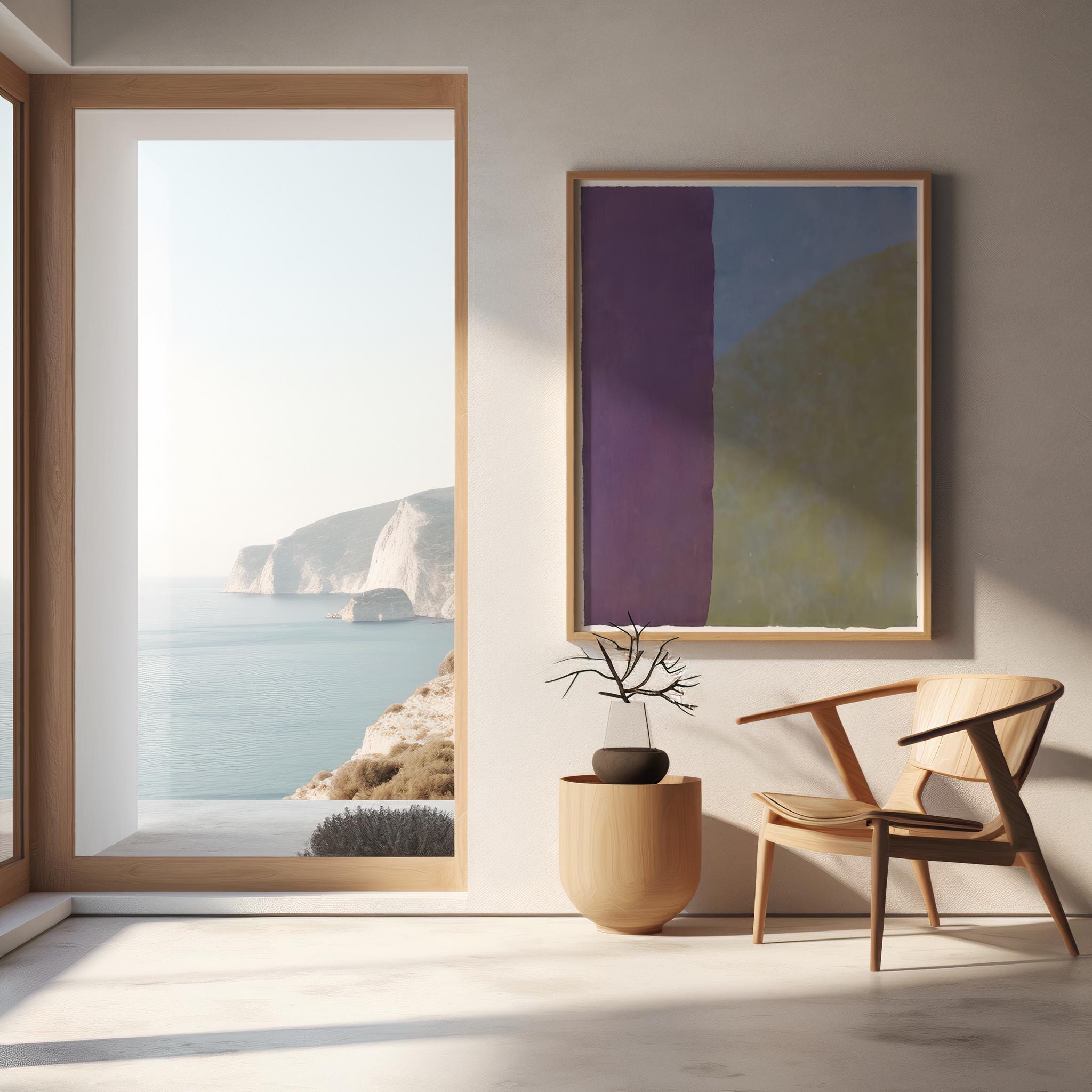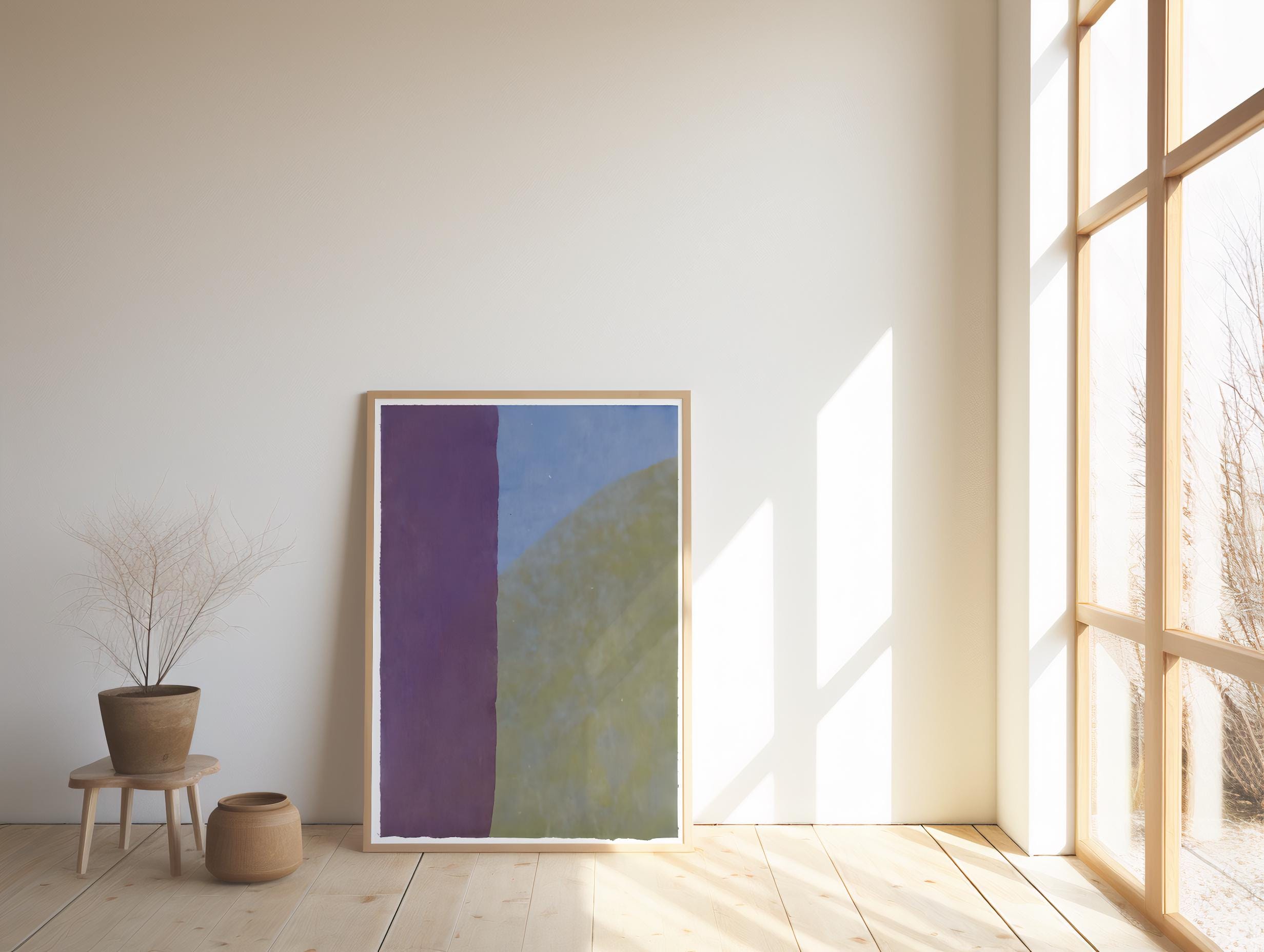 A soft, minimalist abstract artwork featuring a vertical band of rich purple blending into cool blue and muted green tones. Gentle texture and subtle gradients give this piece a calm, modern feel—perfect for bedrooms, living rooms, offices, or gallery walls. Designed for easy printing in multiple sizes.