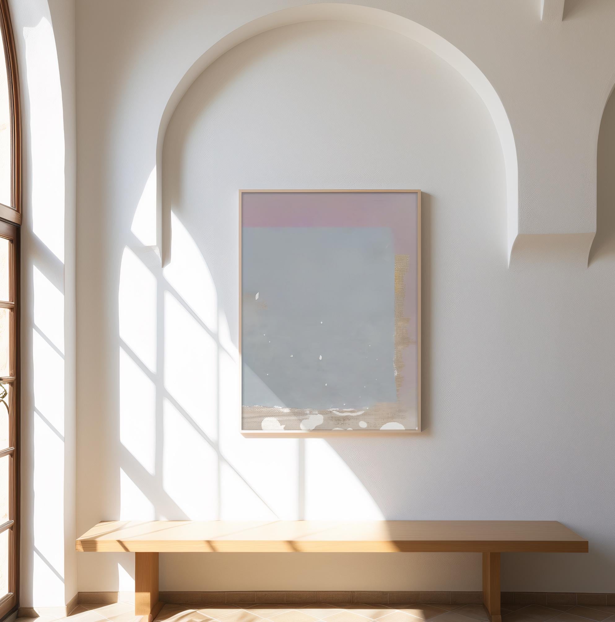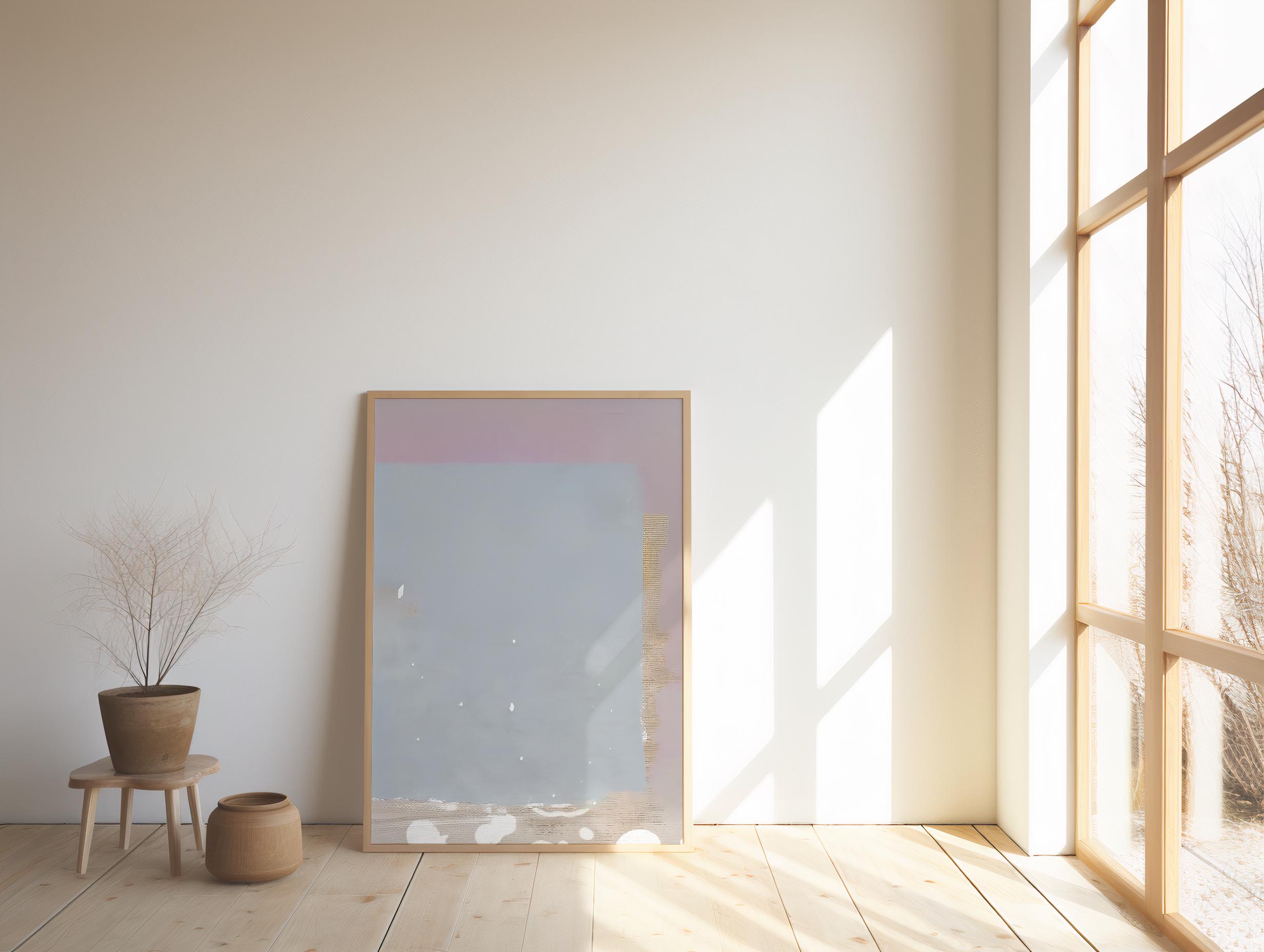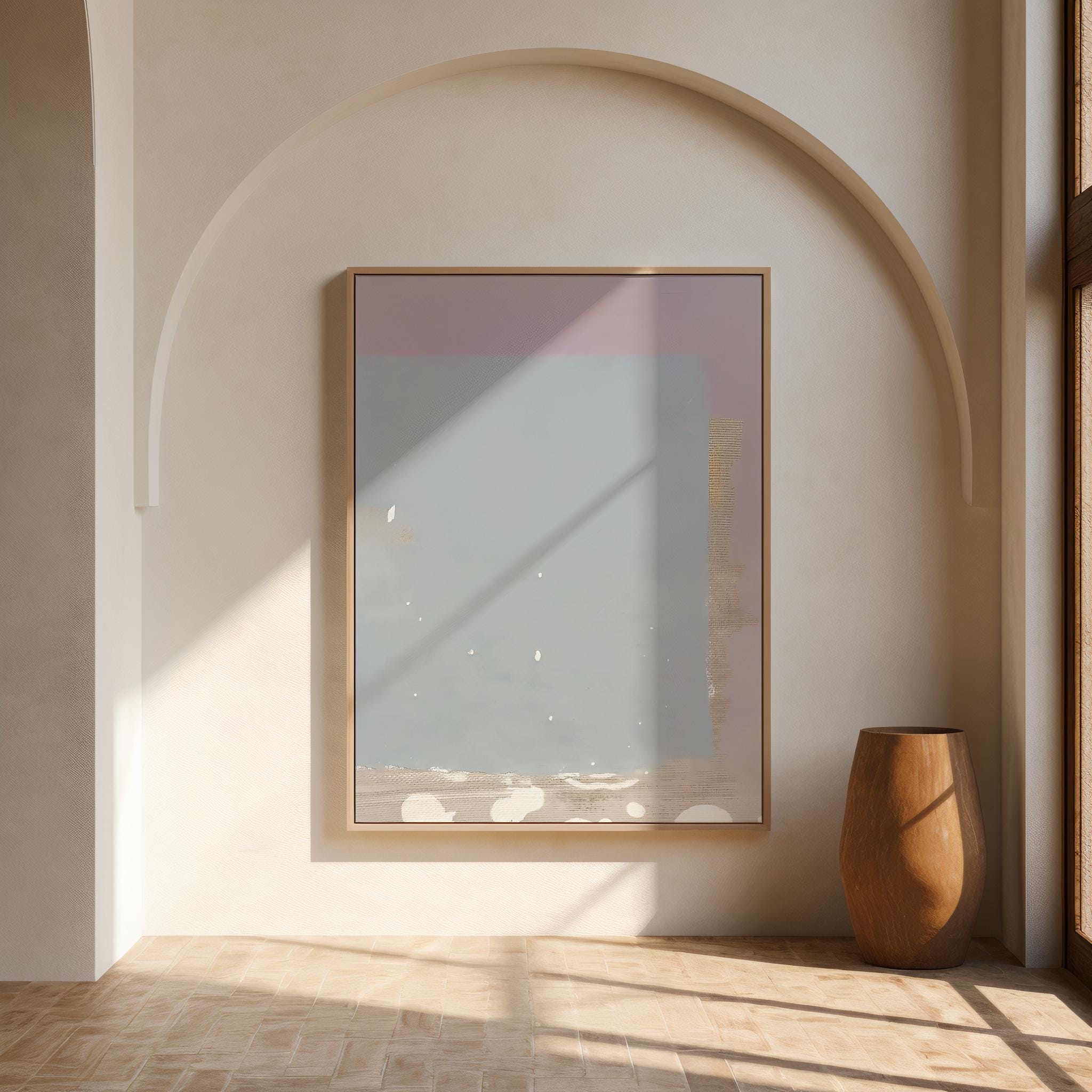 Abstract minimalist artwork featuring soft pastel tones of lavender, blush, and cool grey with subtle grain textures and organic paint details. Great for modern interiors, nurseries, neutral spaces, and serene wall décor.
