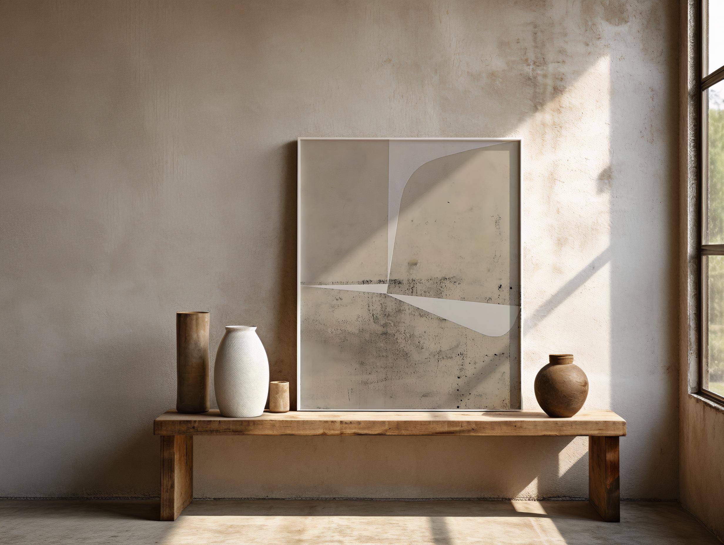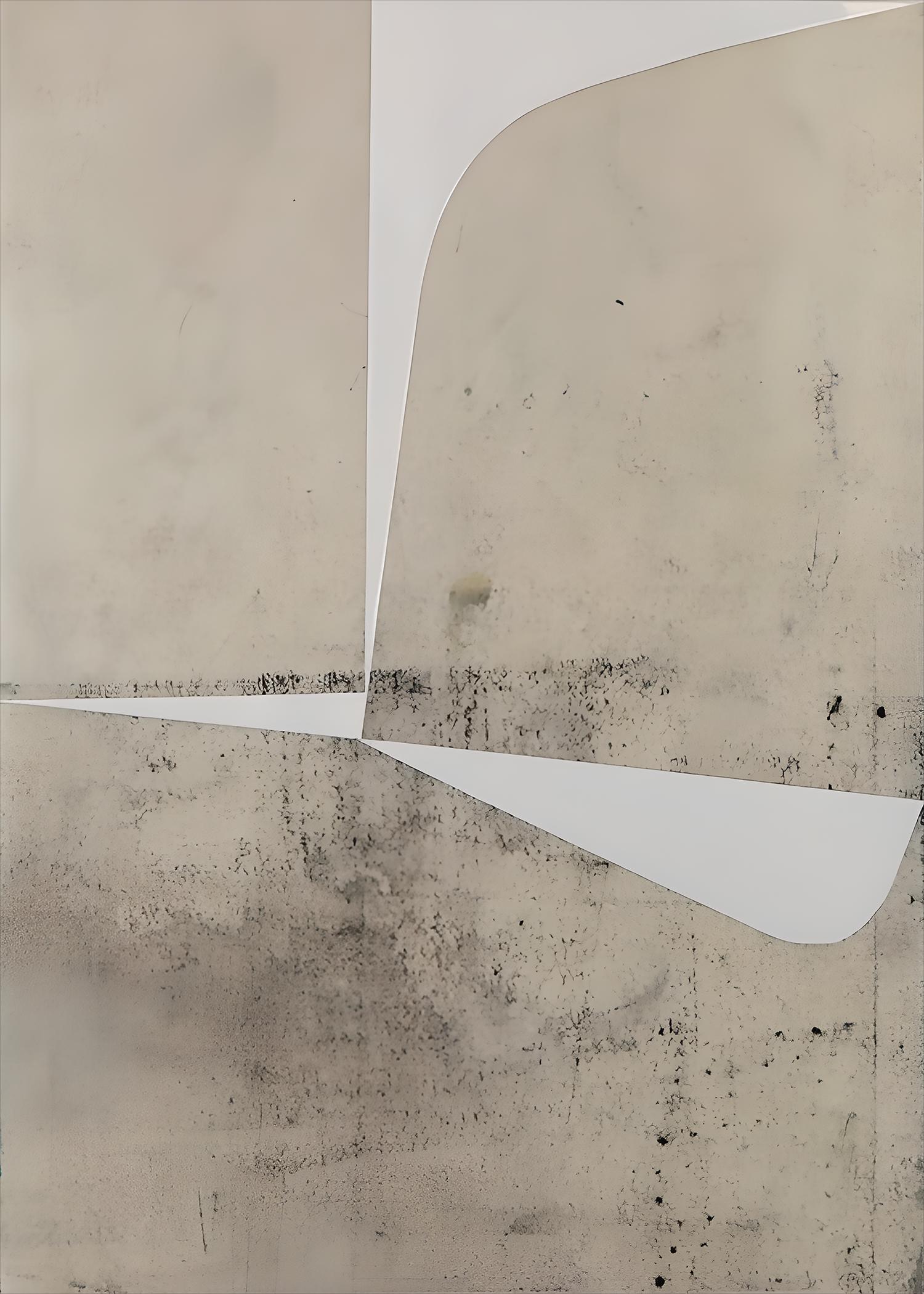 Modern neutral abstract artwork featuring layered stone-like textures and clean geometric white shapes. This minimalist design works well in high-end interiors, hotels, living rooms, dining spaces, offices, and contemporary neutral décor. Warm taupe and beige tones create a subtle architectural look without distracting color.