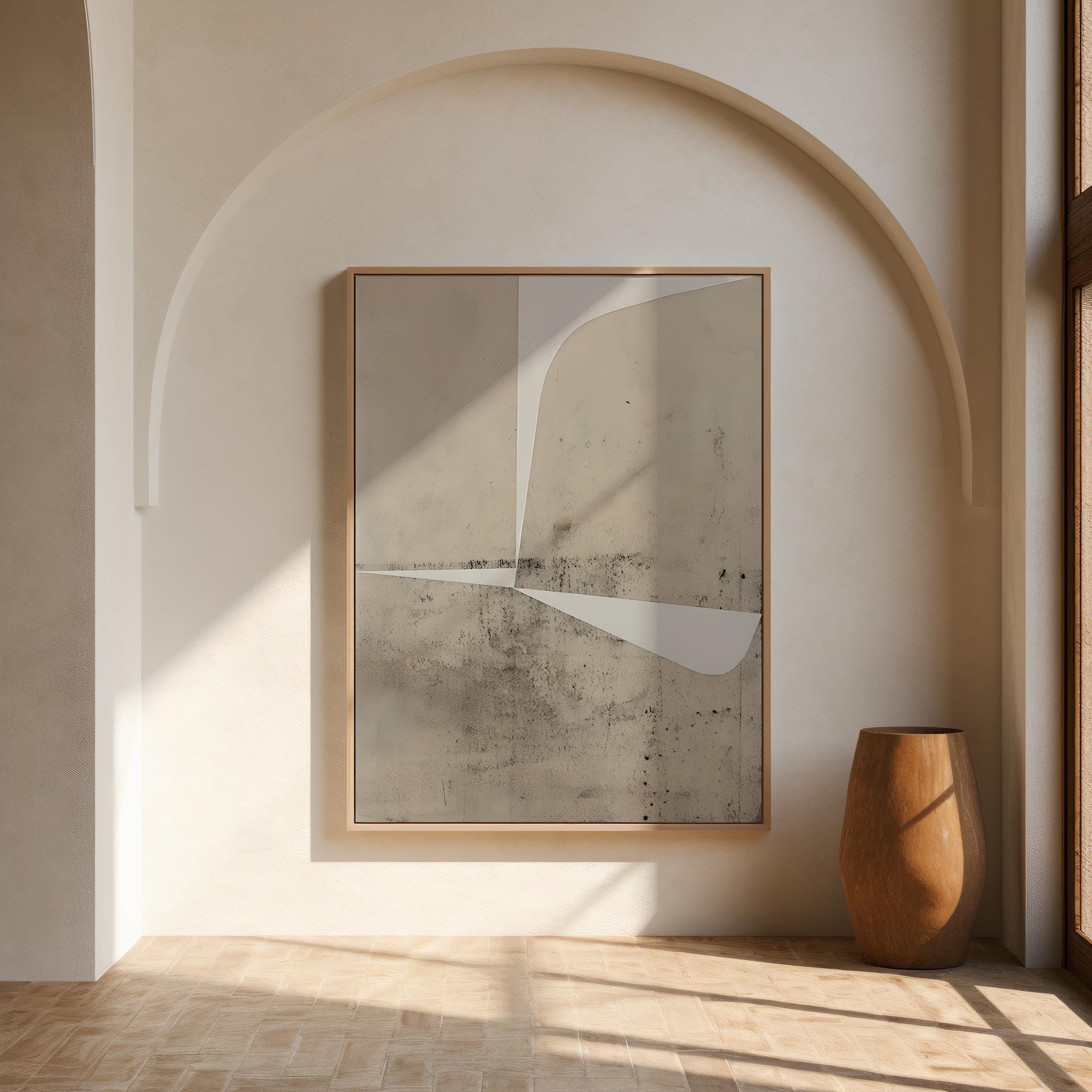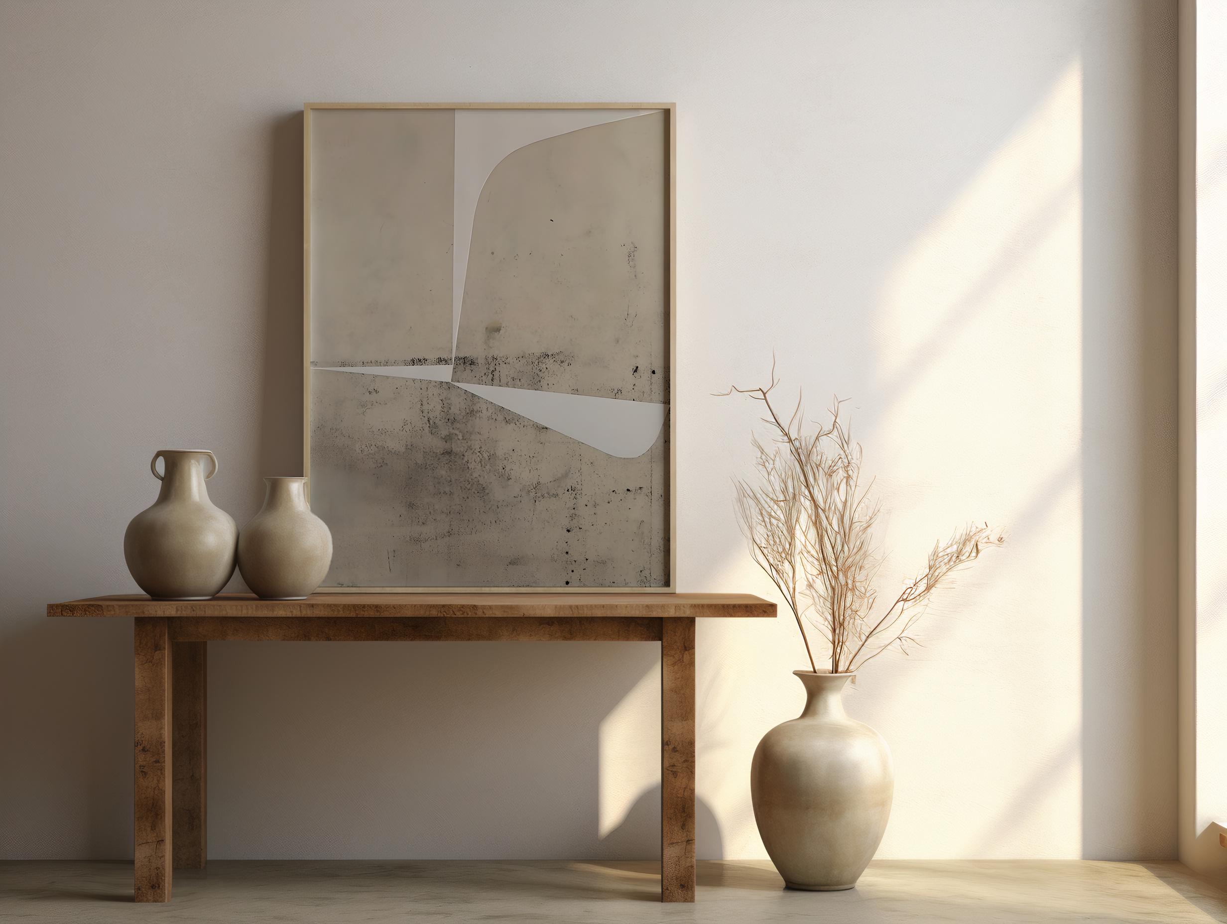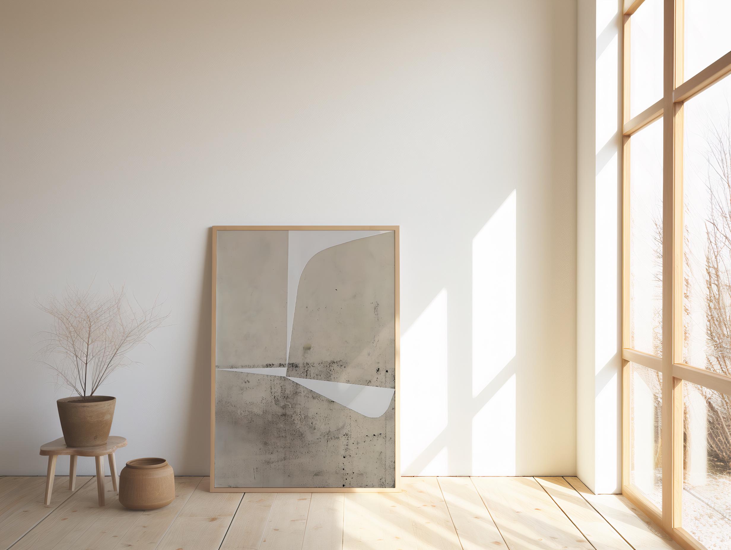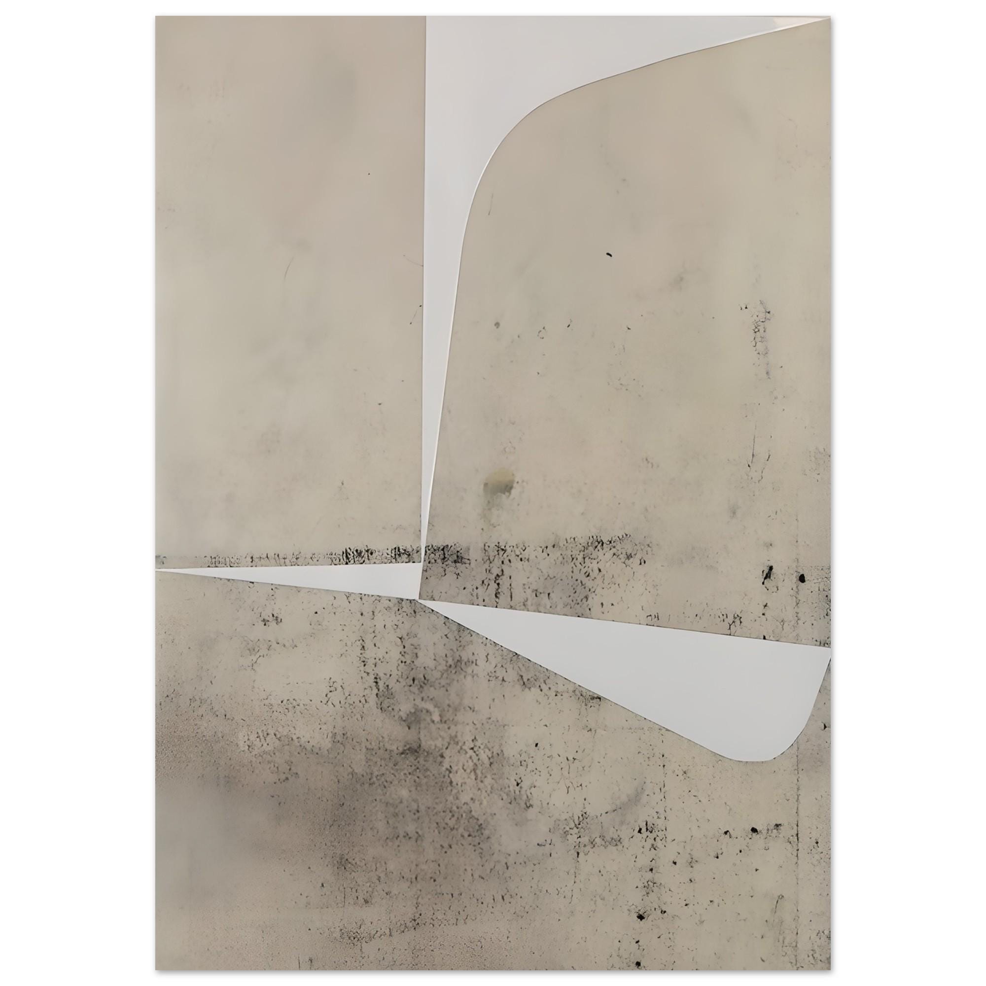 Modern neutral abstract print with layered stone-like textures and clean geometric white shapes. Warm beige and taupe tones create a subtle architectural look, designed for contemporary interiors, living rooms, offices, dining rooms, and minimalist neutral spaces.