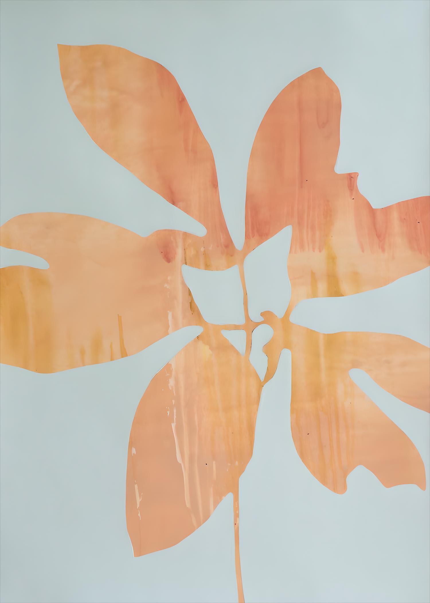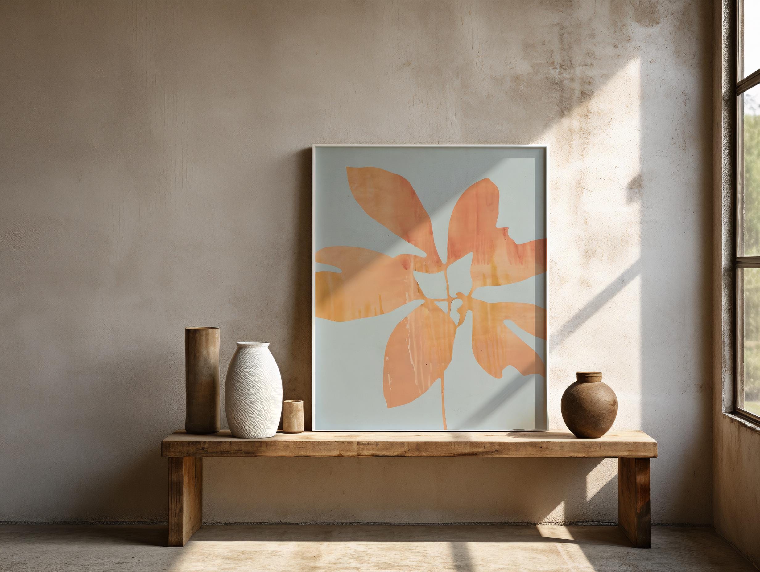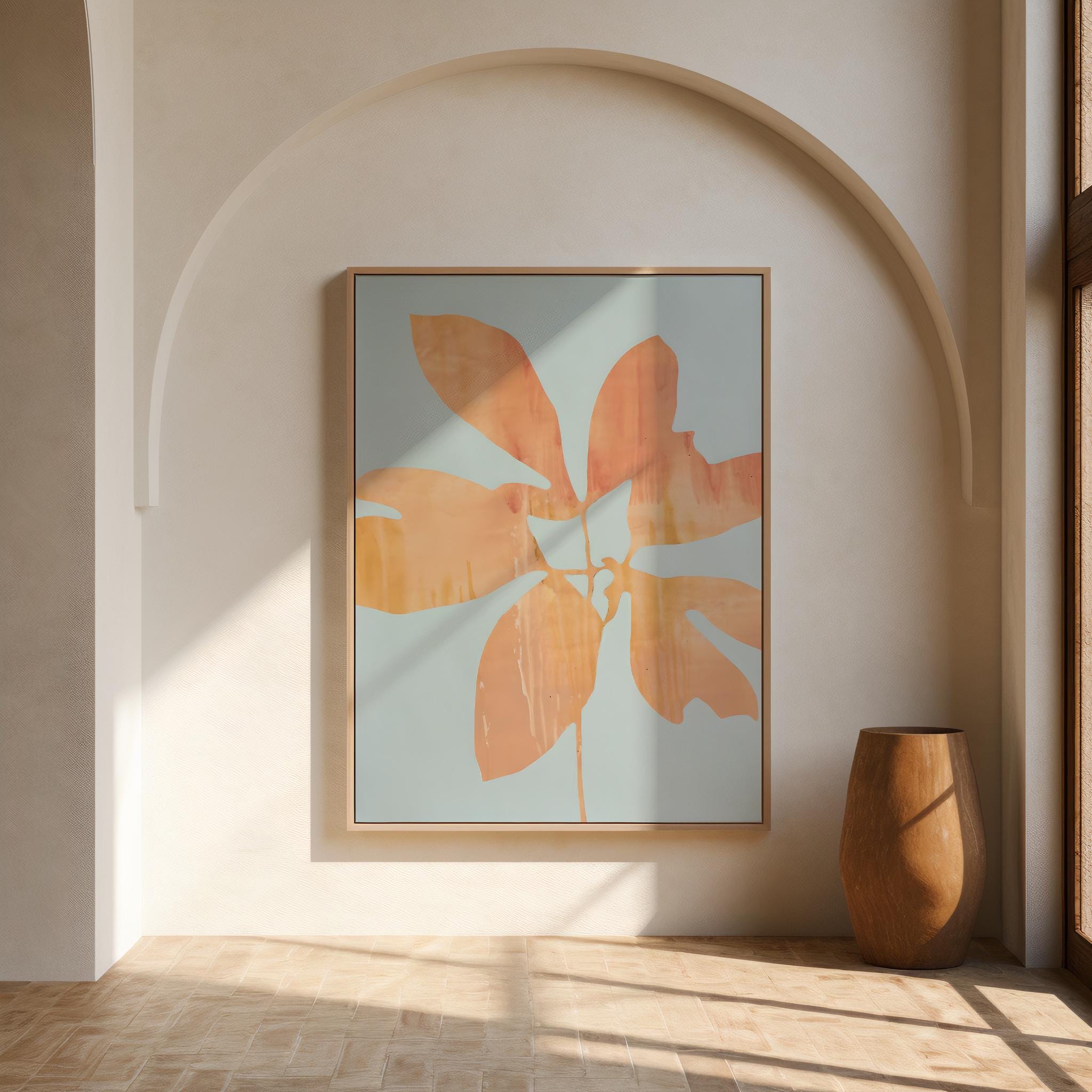 Soft abstract botanical artwork featuring a large flowing leaf silhouette in warm terracotta and apricot tones over a pale, cool background. Designed for modern, coastal, boho, and minimalist interiors. Adds warmth and organic form without heavy detail or bold contrast.