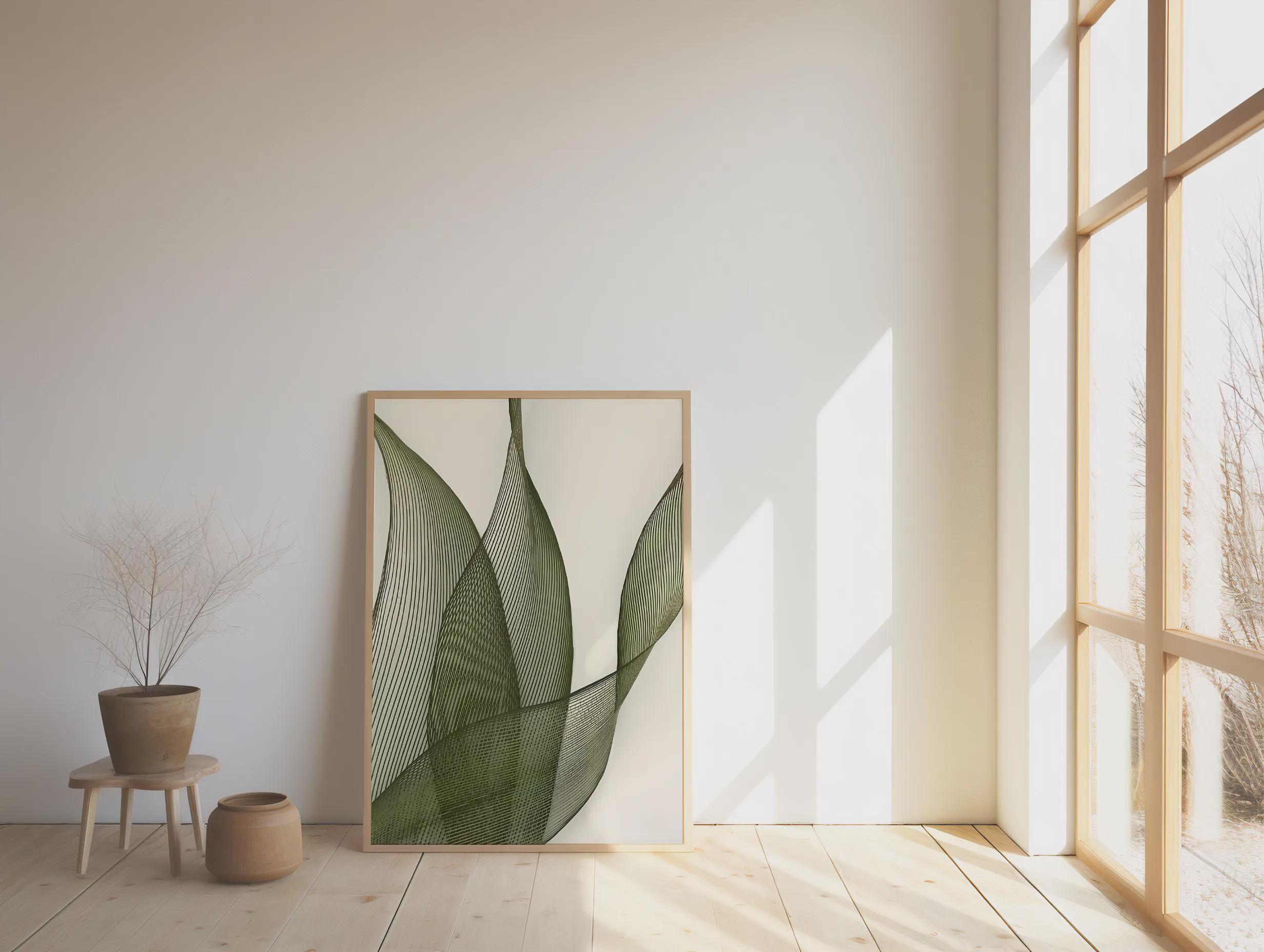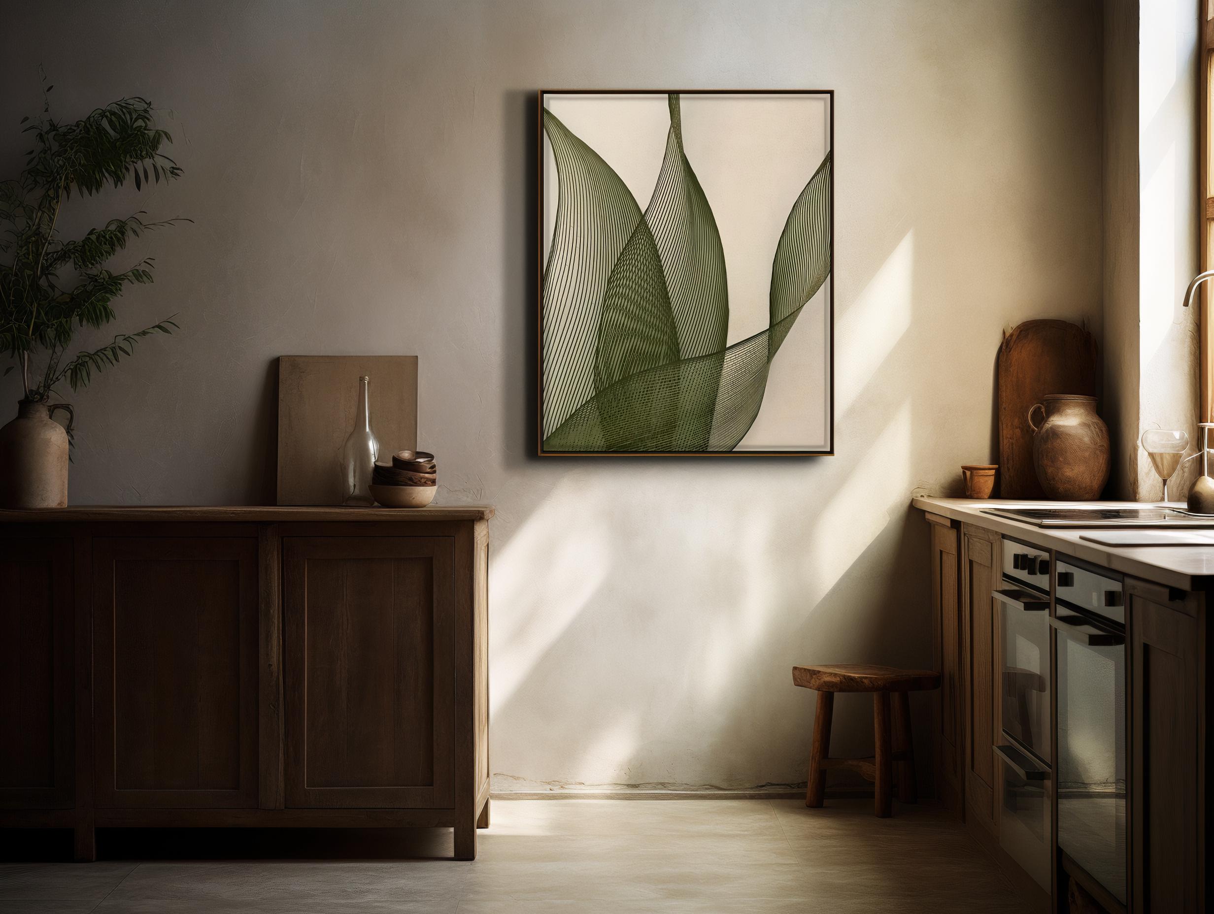 A refined modern botanical artwork featuring layered green linear shapes that create movement and texture. The natural tones pair seamlessly with organic modern, Japandi, earthy neutral, and contemporary spaces.