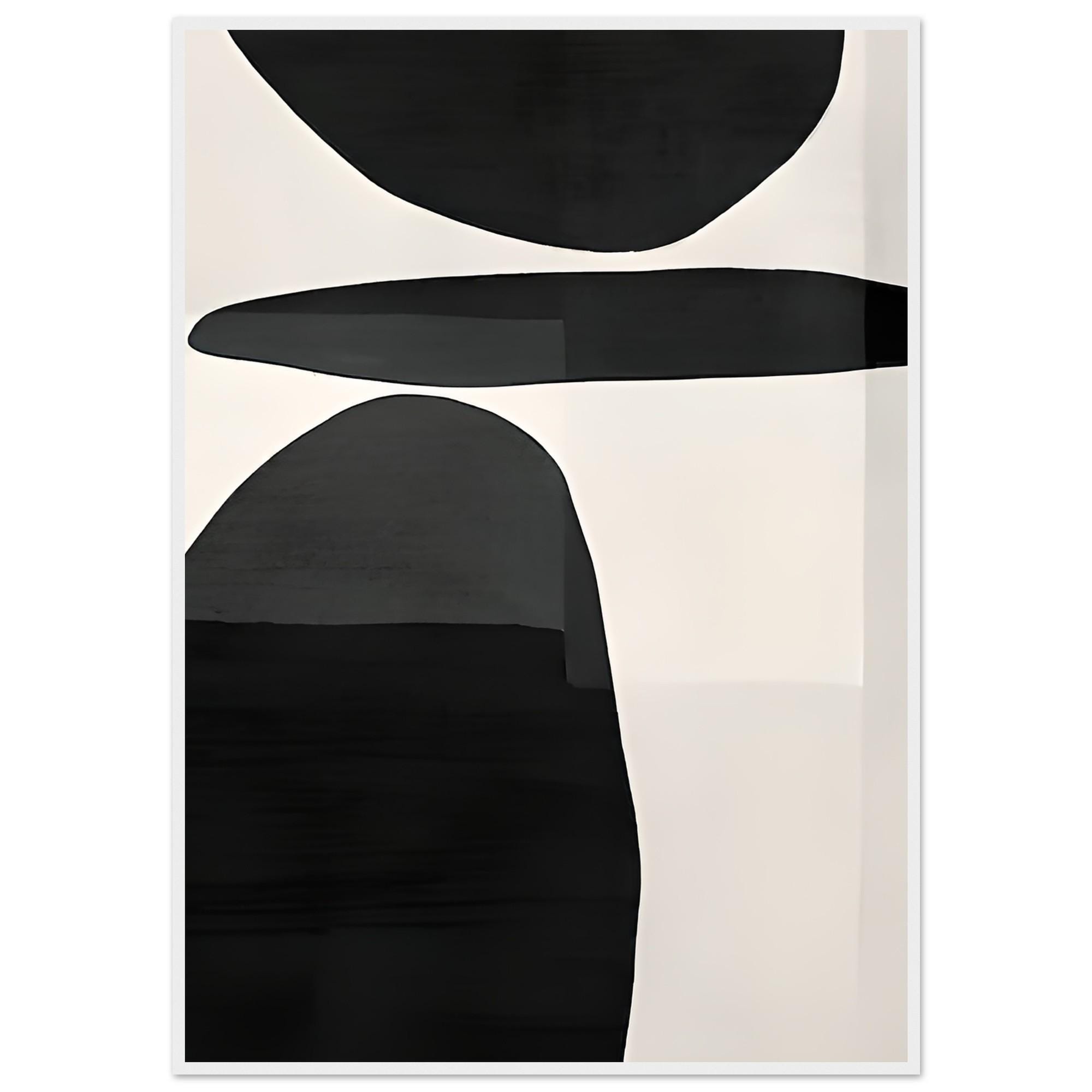 A bold and modern abstract composition in deep black shapes balanced over soft neutral tones. This framed poster adds a striking, architectural presence to contemporary, minimalist, and monochrome interiors.
