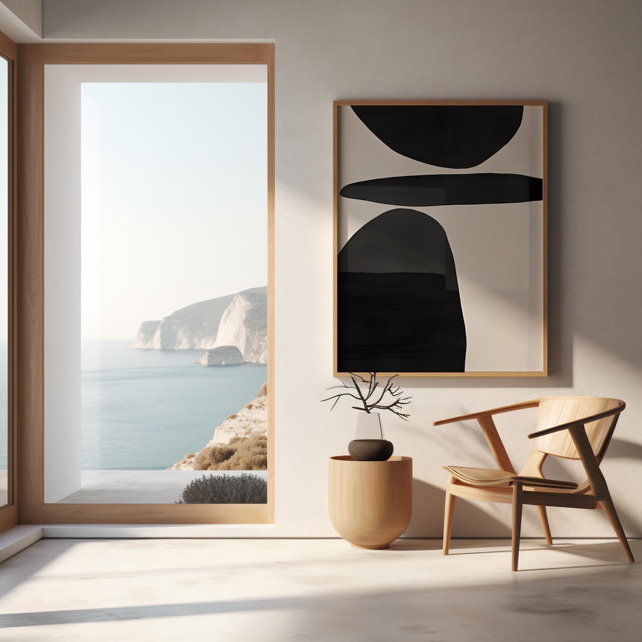 STYLE & AESTHETIC -Minimalist black abstract shapes -Modern, bold, gallery-style composition -Perfect for monochrome, neutral, and contemporary interiors -Pairs beautifully with oak, natural wood, or black frames