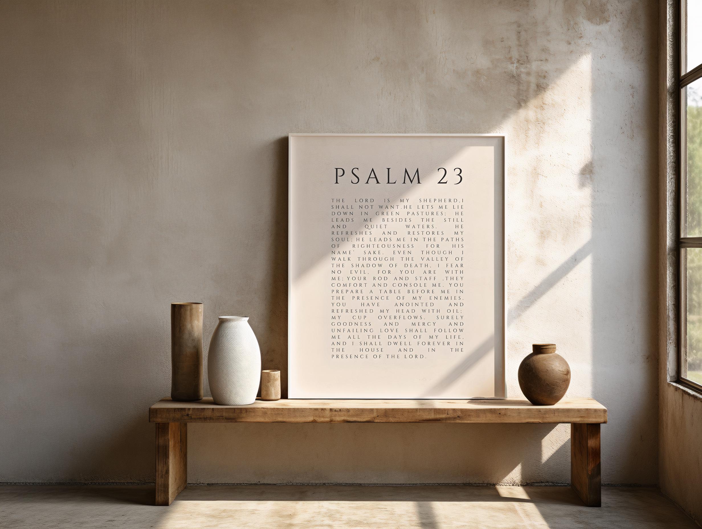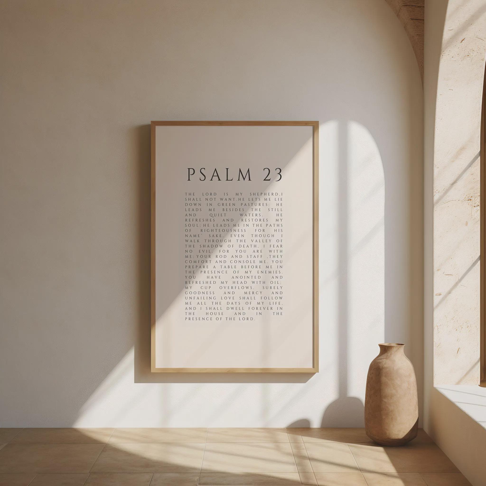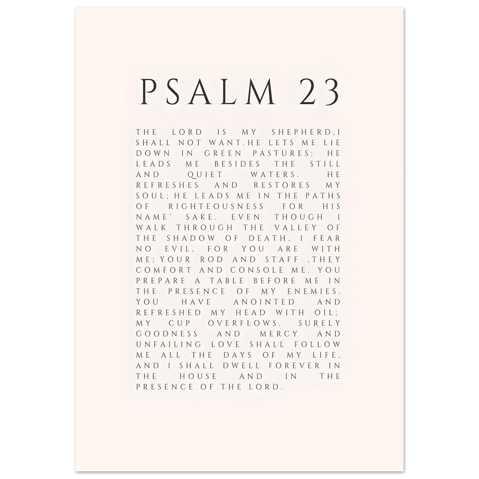 A beautifully typeset, minimalist Scripture print featuring Psalm 23. Designed with soft neutral tones and elegant serif typography for a clean, elevated look. Perfect for bedrooms, living rooms, entryways, prayer rooms, church offices, and spiritual spaces. This is a physical fine art poster printed on premium museum-quality paper.