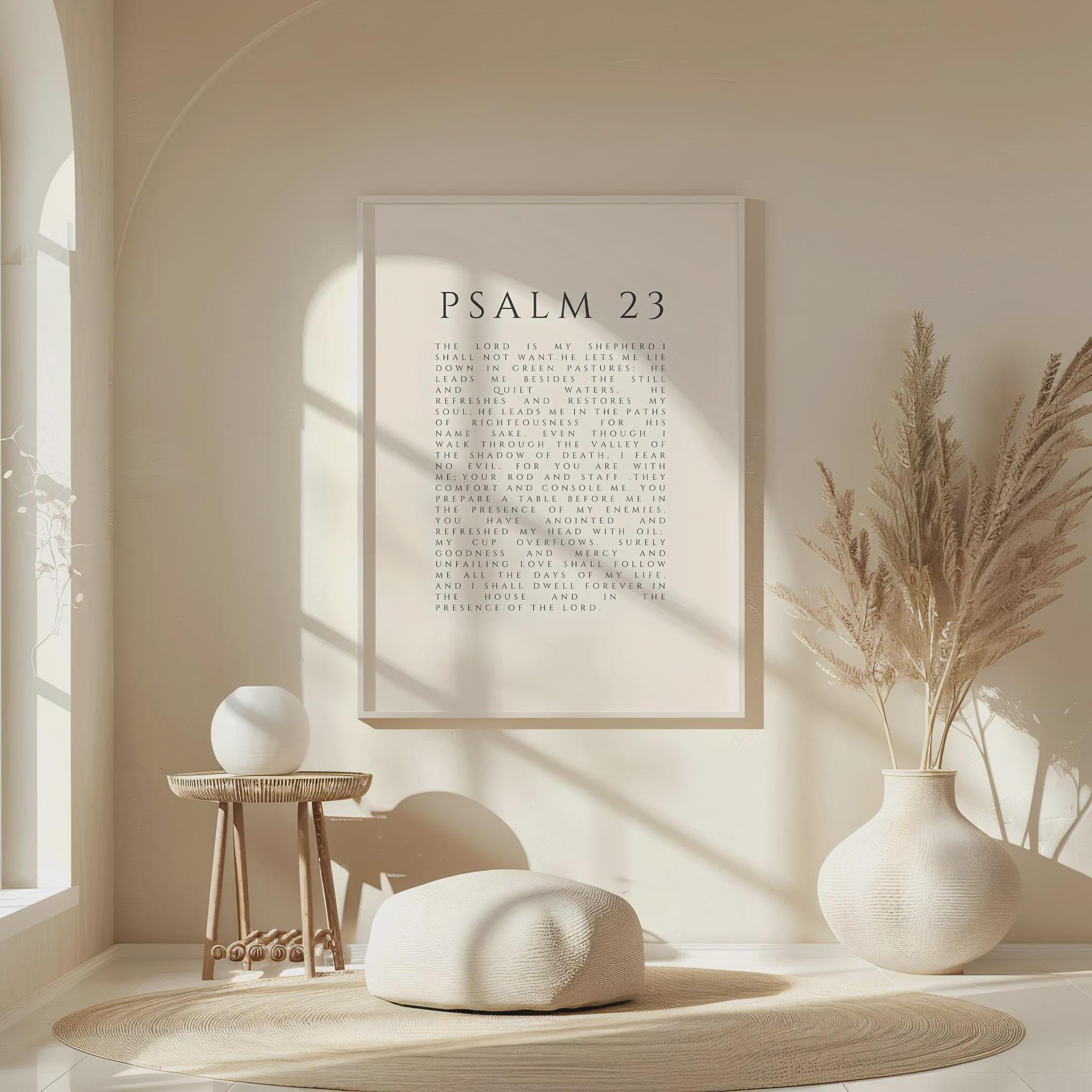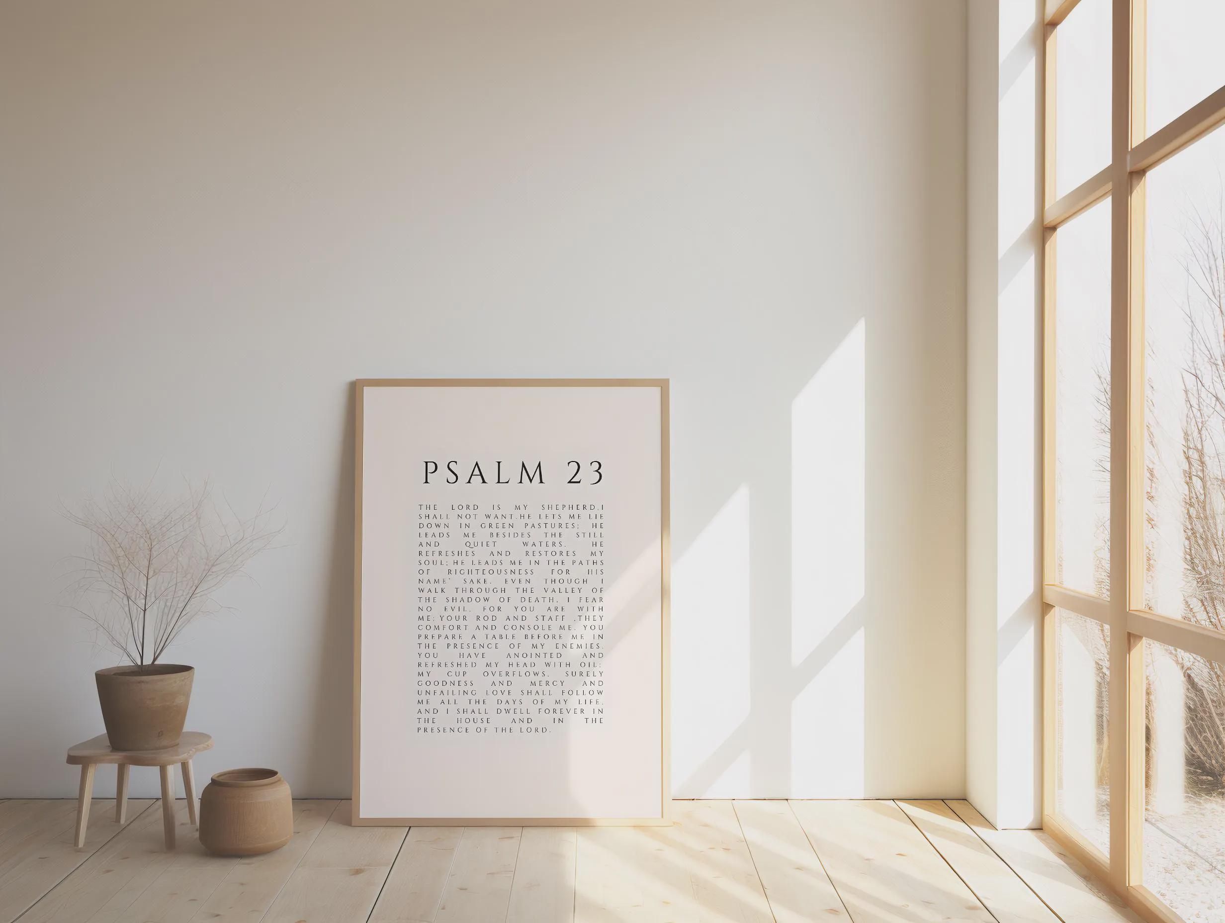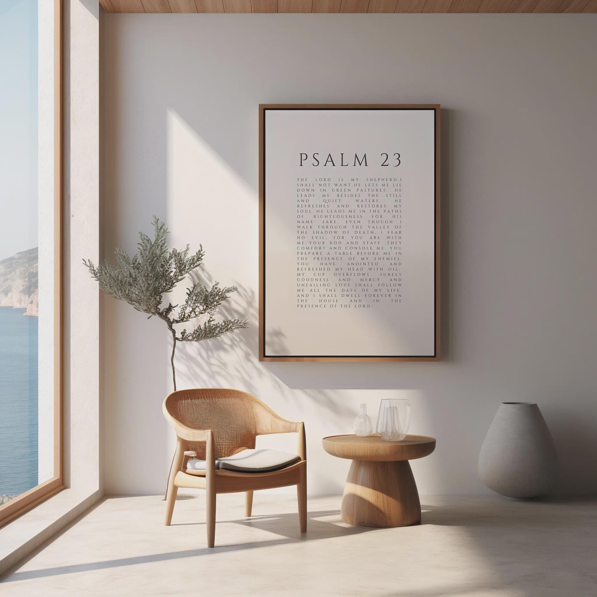 A beautifully typeset, minimalist Scripture print featuring Psalm 23. Designed with soft neutral tones and elegant serif typography for a clean, elevated look. Perfect for bedrooms, living rooms, entryways, prayer rooms, church offices, and spiritual spaces. This is a physical fine art poster printed on premium museum-quality paper.