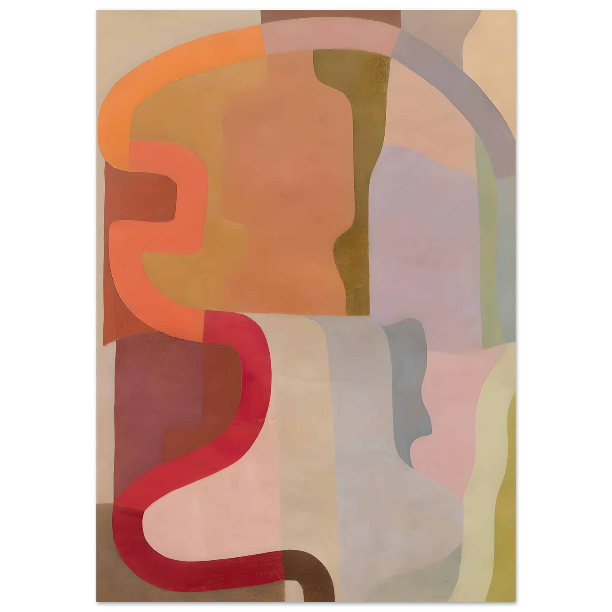 Bold curving forms weave and overlap in a warm palette of terracotta, orange, red, lavender, olive and blush — playful, energetic and full of retro-modern charm. The fluid shapes and rich color story make this piece a natural fit for eclectic, mid-century modern, boho, and maximalist interiors.