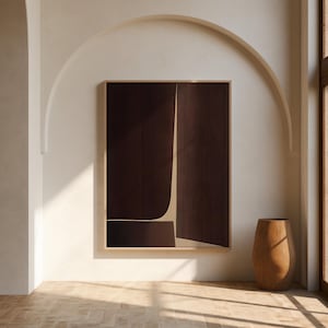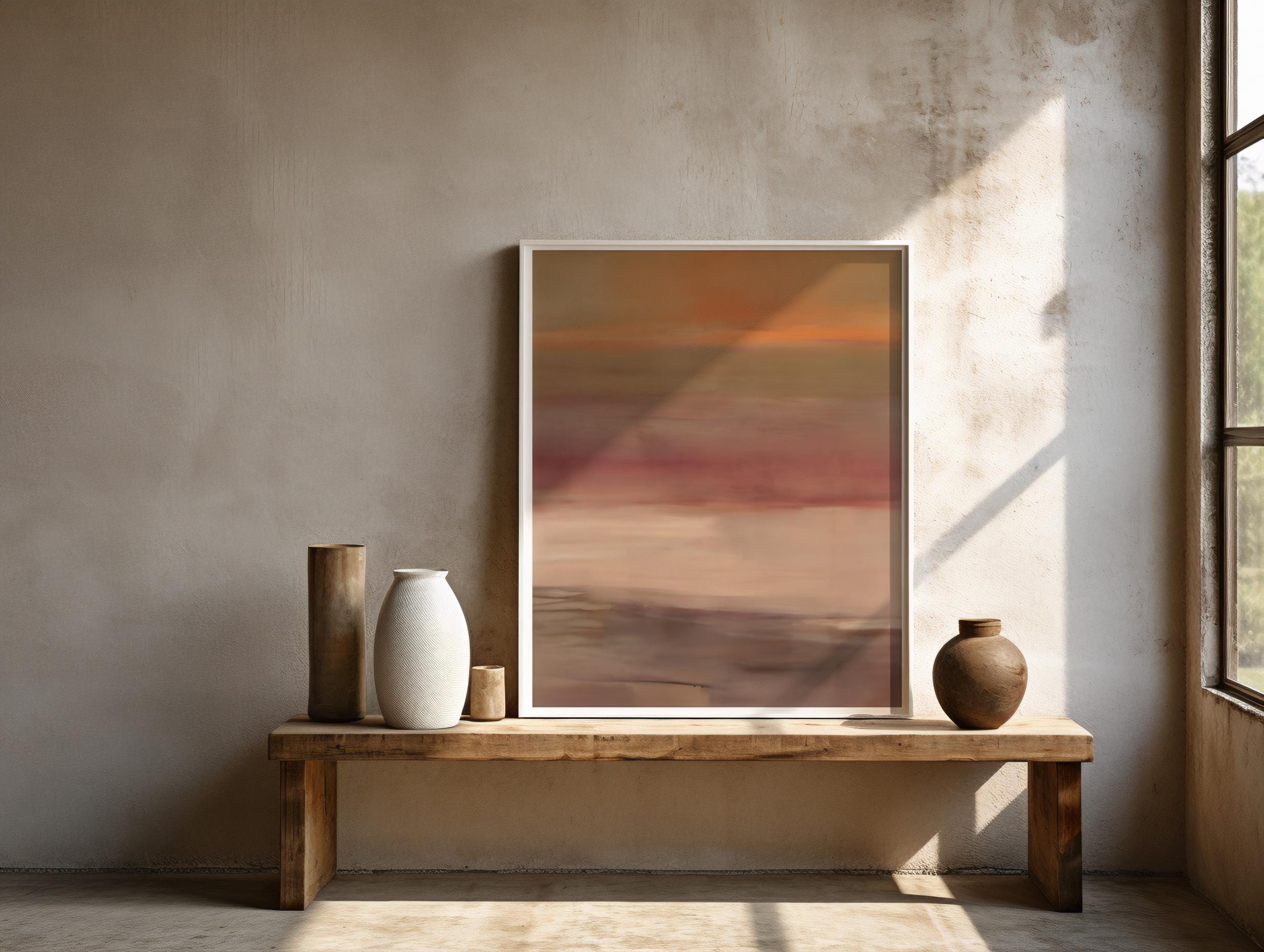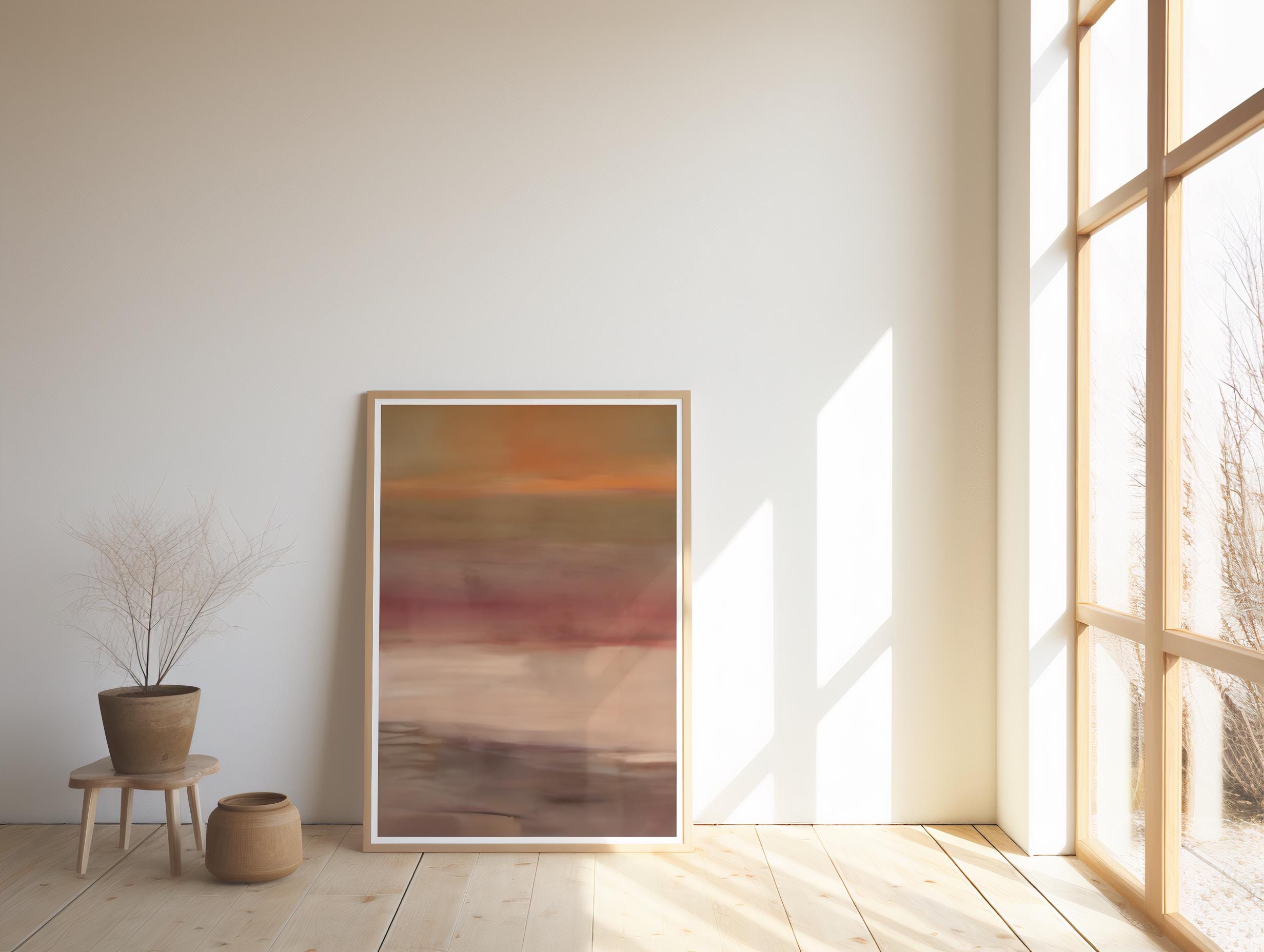 A soft, warm abstract inspired by sunset tones—peach, terracotta, blush, sand, and muted plum blend into a smooth, dreamy landscape. Minimal, calming, and perfect for modern, neutral, coastal, boho, and serene interior styles.