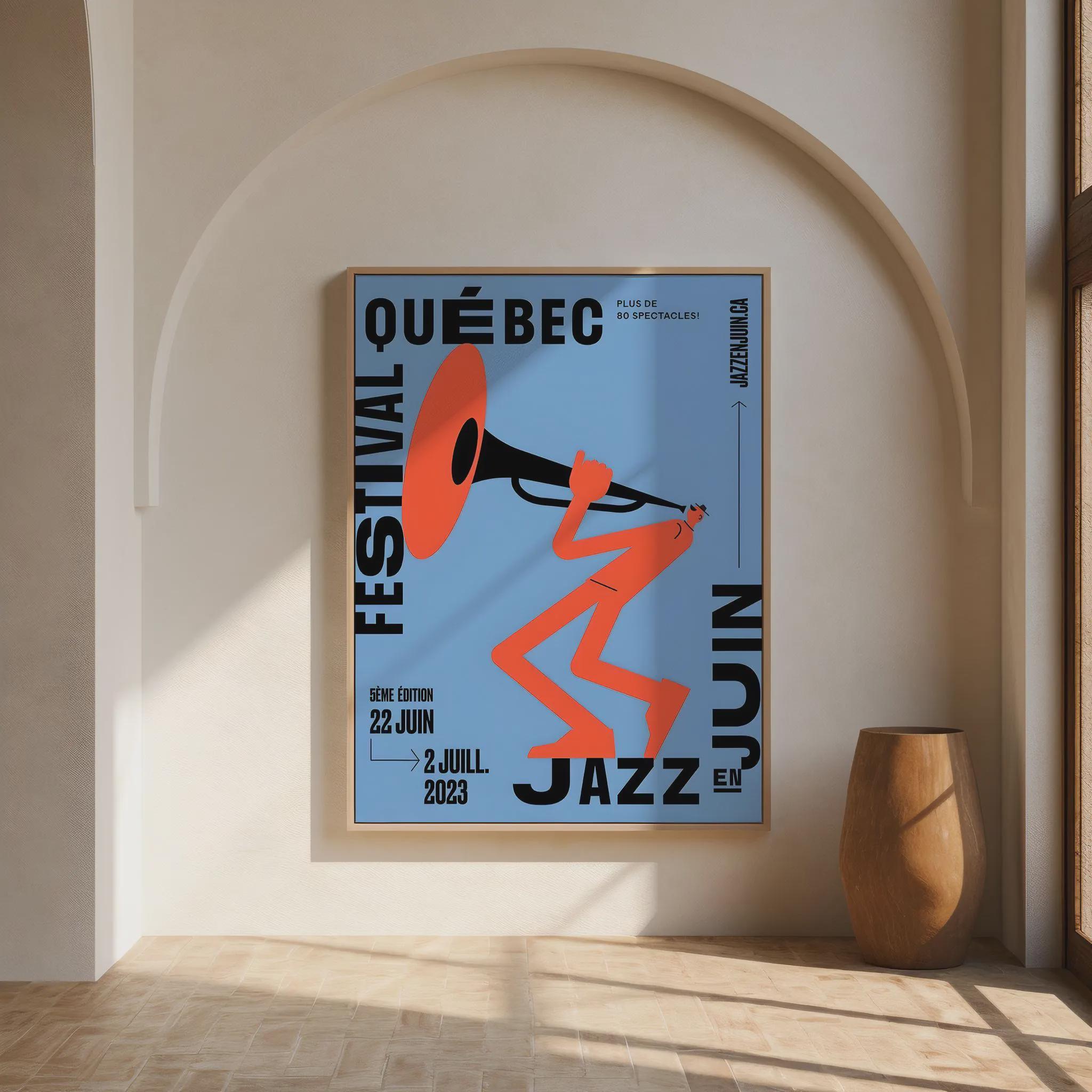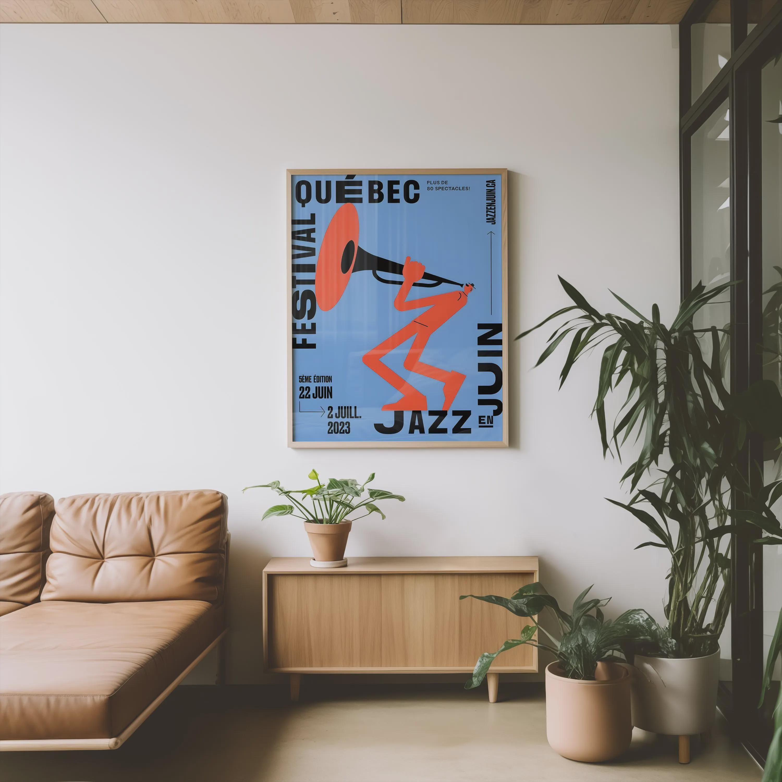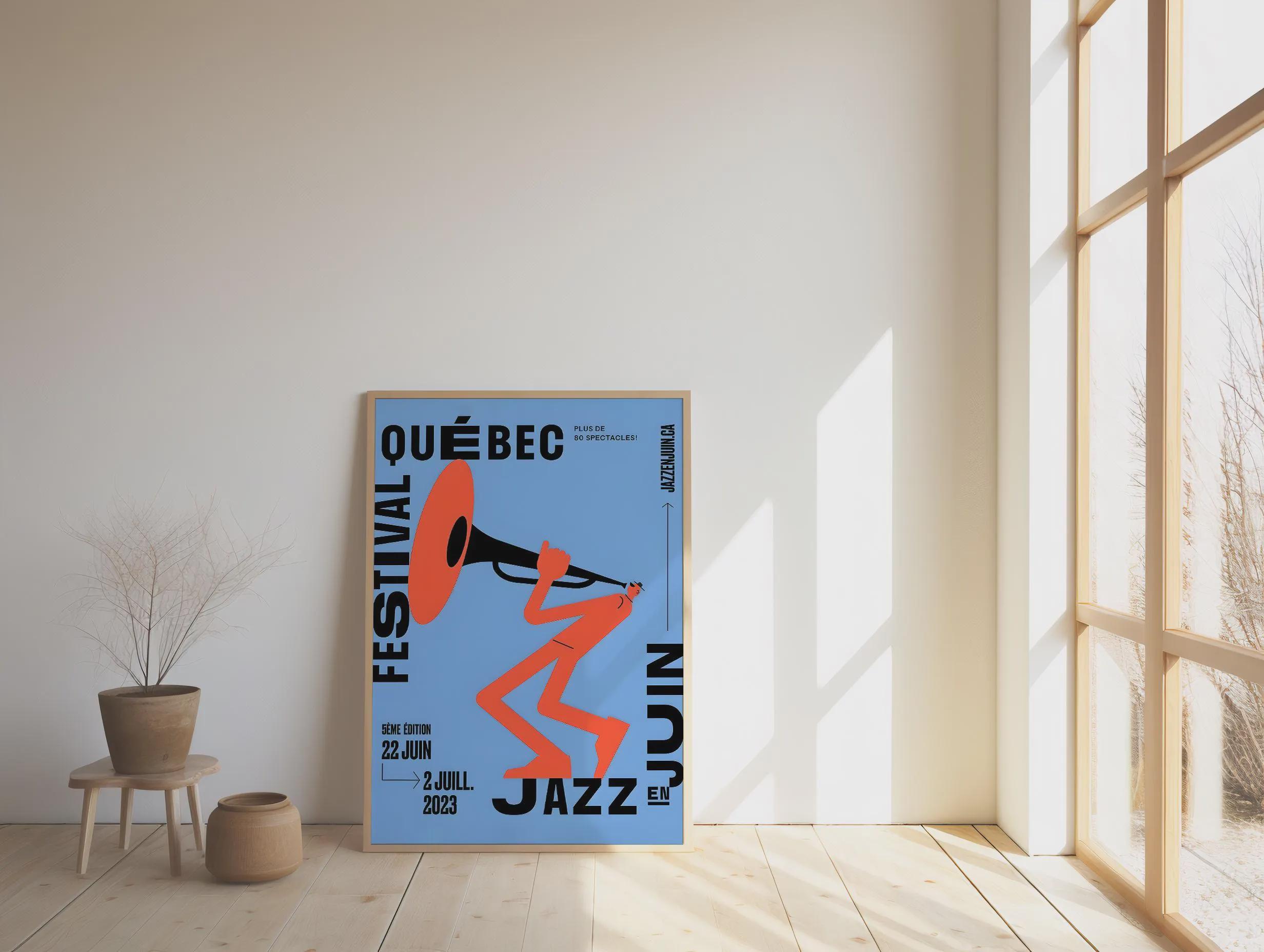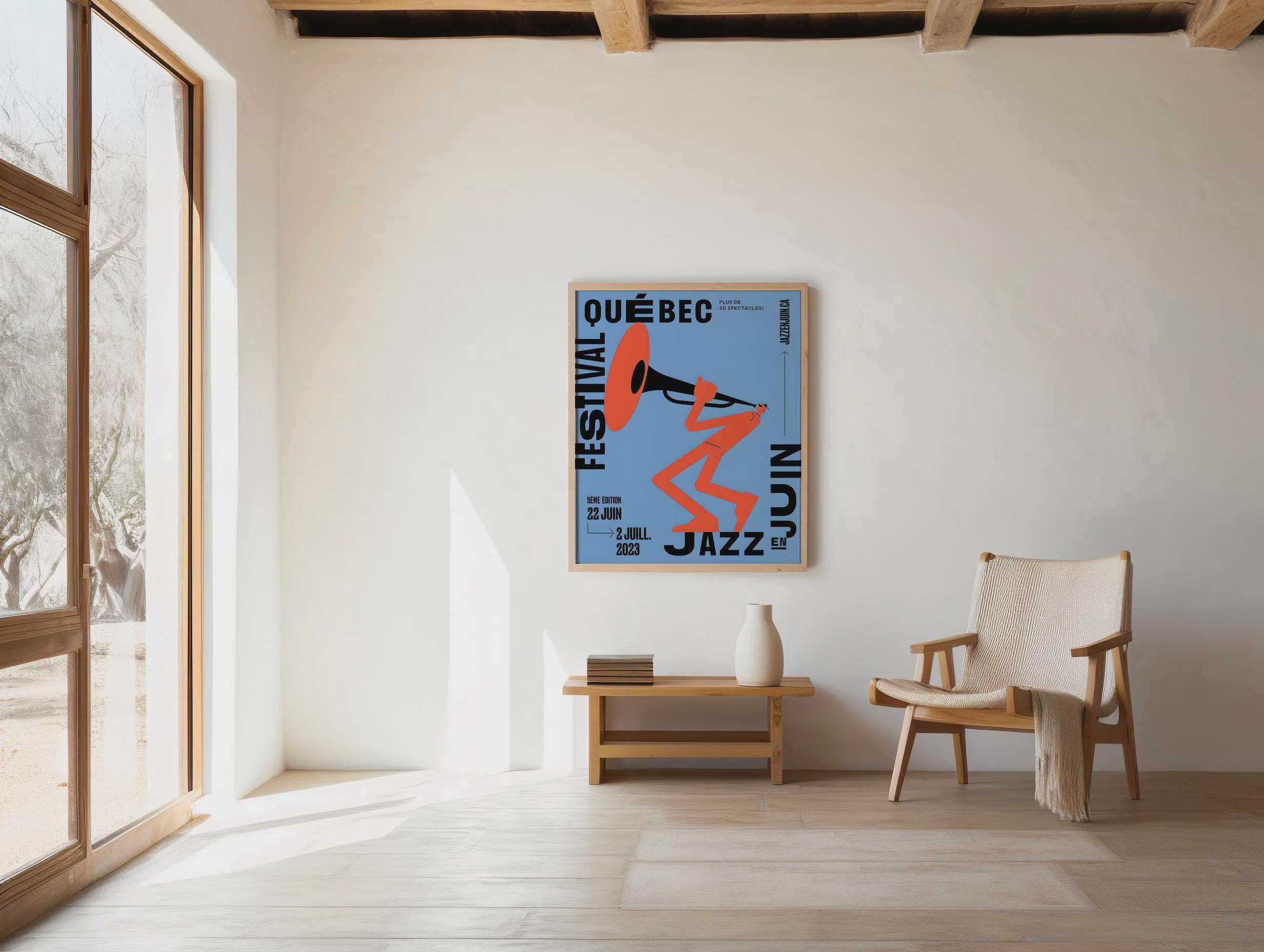 Our sturdy wooden framed posters come ready to hang and are printed on heavyweight white matte paper with a smooth, luxurious finish—crafted for long-lasting color and gallery-grade presentation. This bold Jazz Festival artwork combines vintage poster aesthetics with modern illustration: a stylized musician, dynamic typography, and a vibrant blue-orange palette that brings movement, rhythm, and personality to any room.