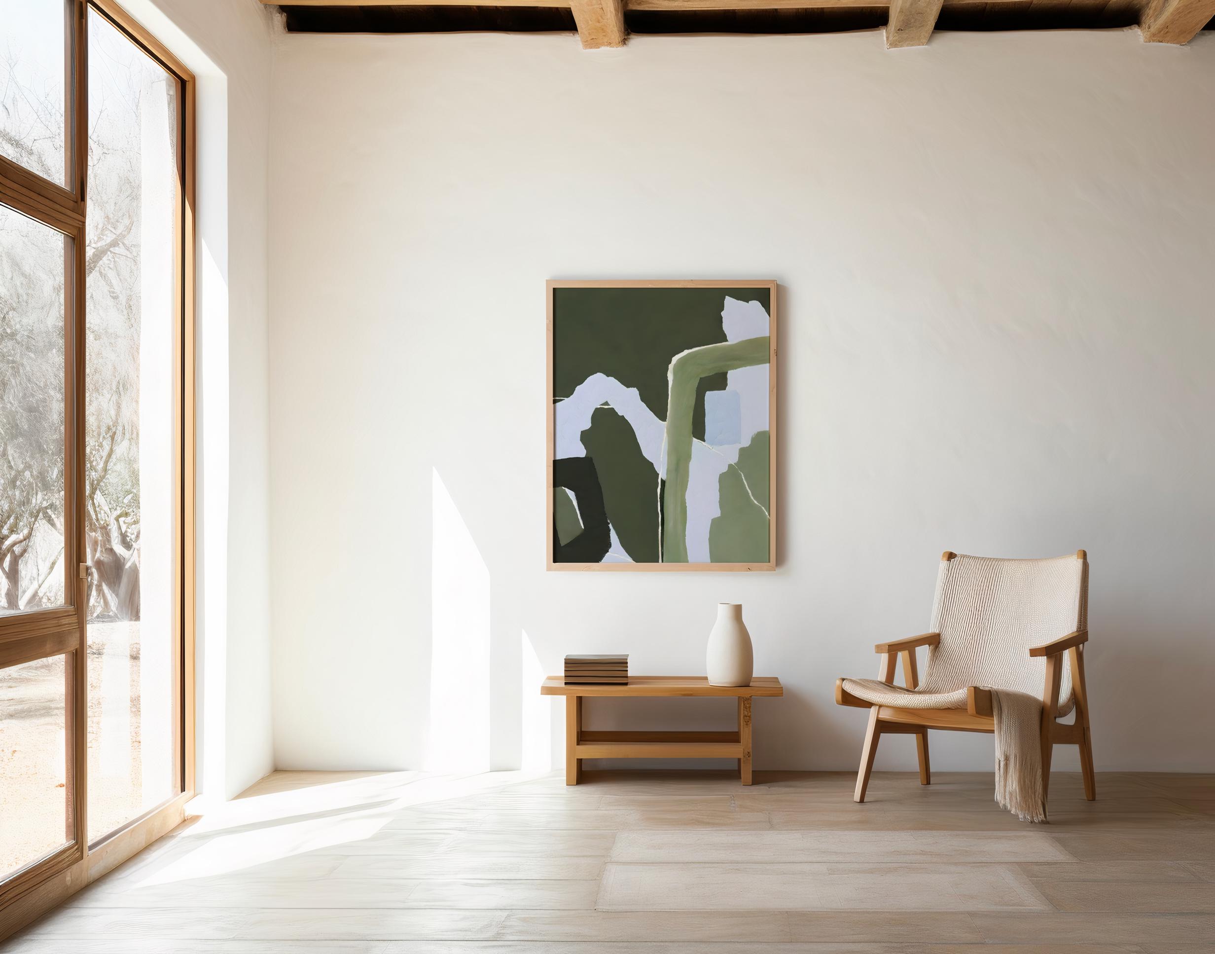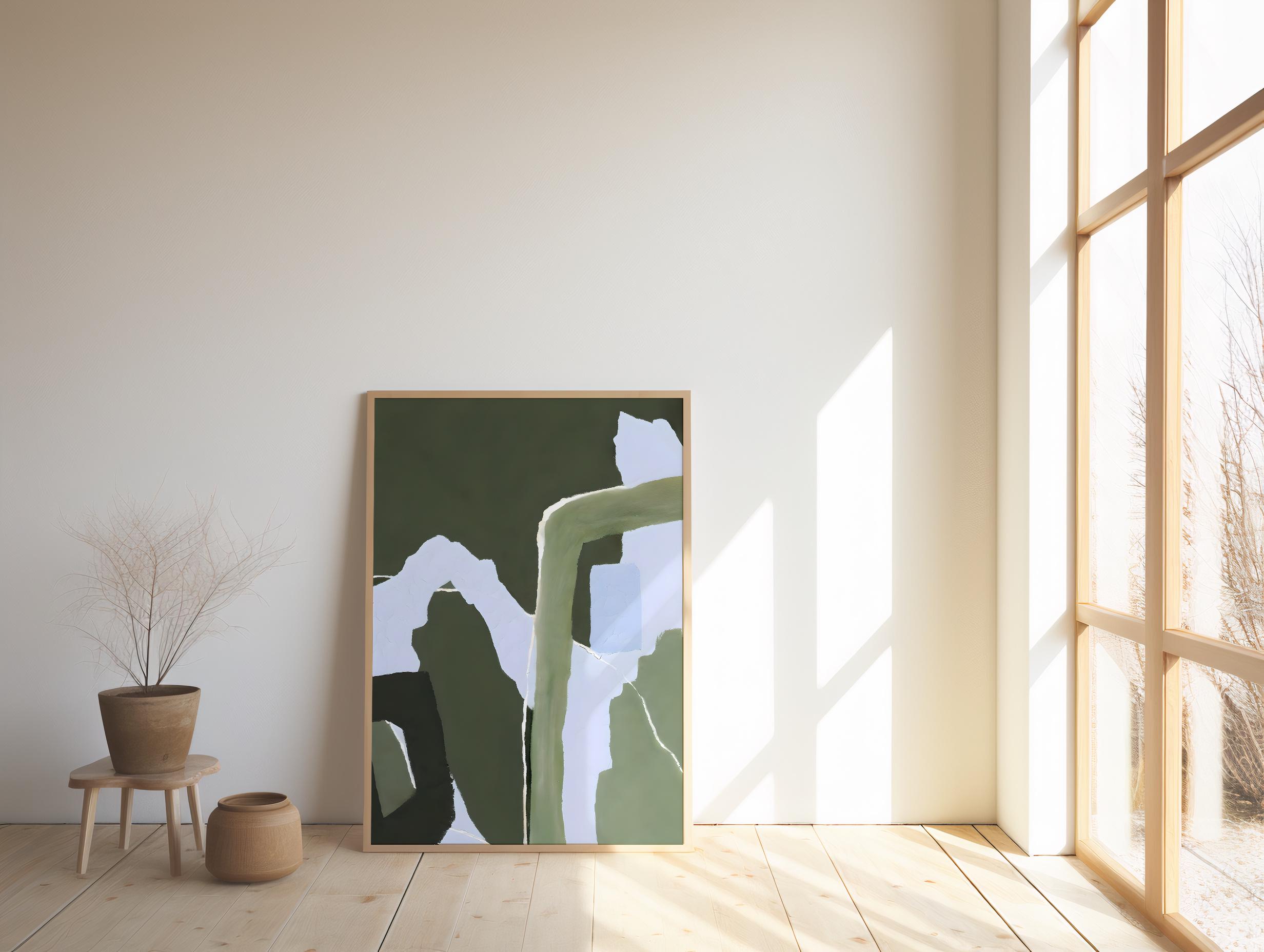 Bold organic forms carved in deep olive and sage green float against soft periwinkle blue. This striking color-block abstract brings a fresh, grounded vitality to any space. The palette of deep olive, sage, and cool periwinkle makes it a natural fit for organic modern, botanical, Japandi, and nature-inspired interiors. A powerful statement piece on its own or a bold anchor for a gallery wall.