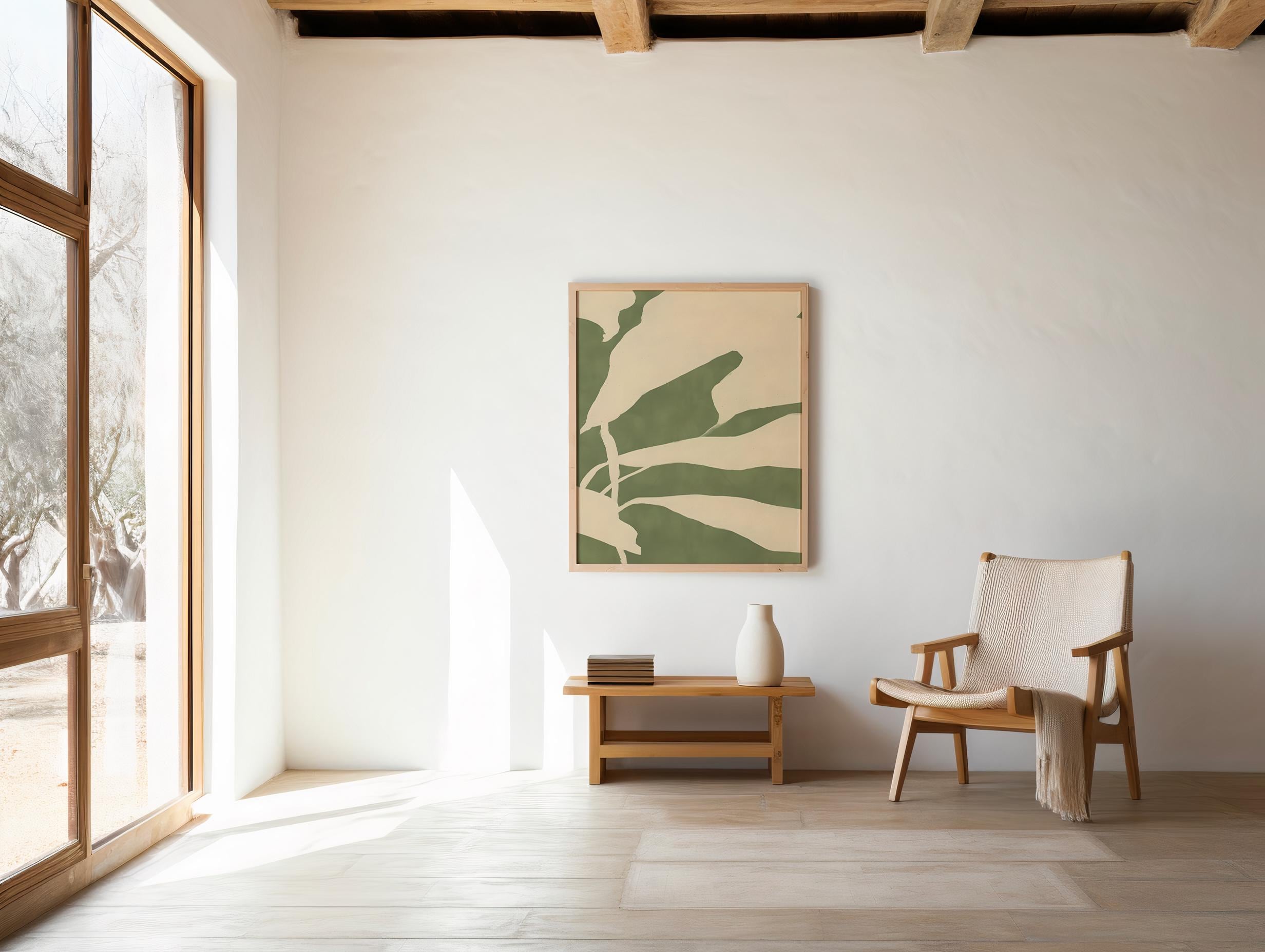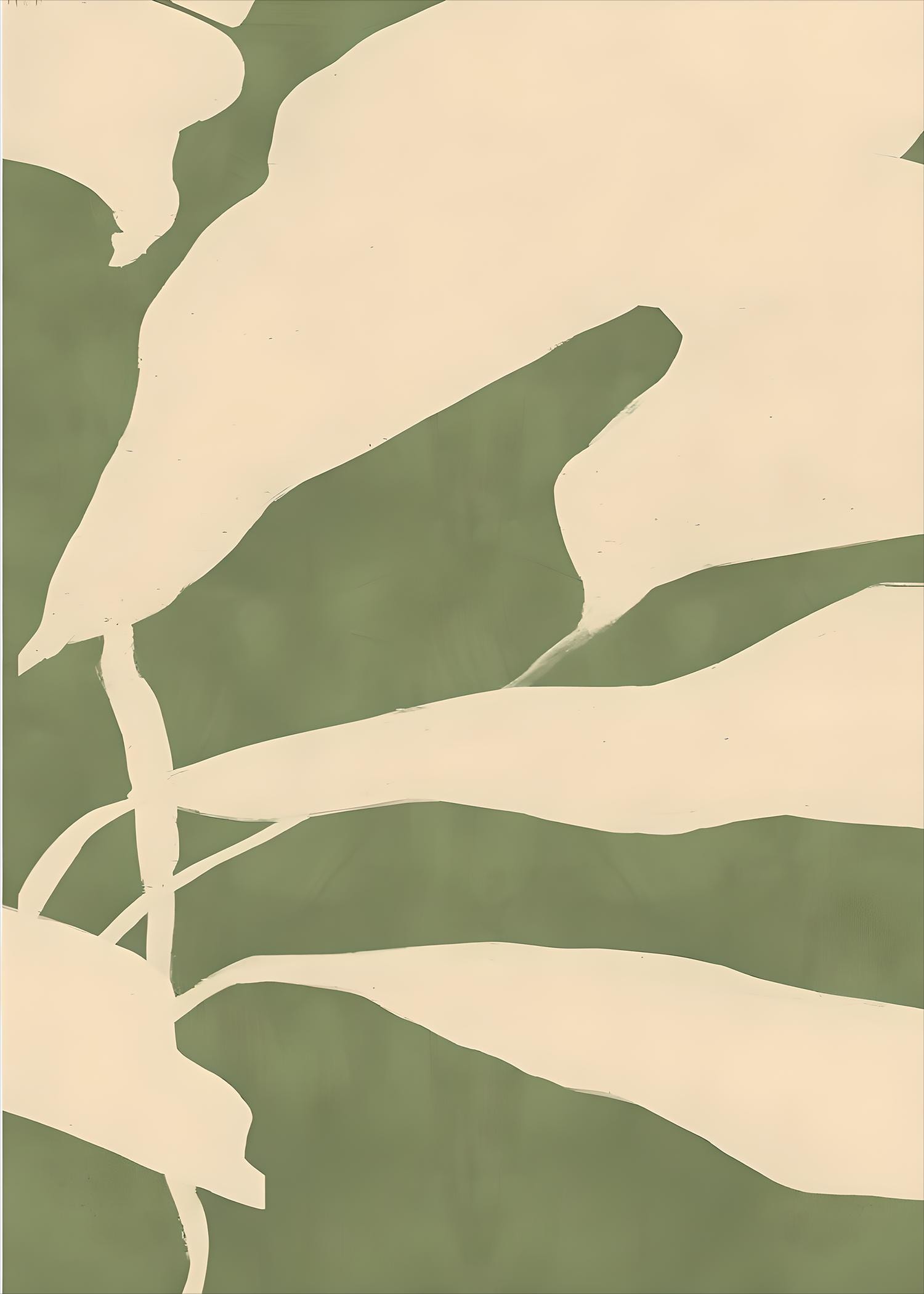 Instant digital download. A soft, modern botanical abstract featuring flowing leaf-like shapes in muted sage green and warm cream tones. Minimal, calming, and perfect for neutral, earthy, and contemporary interiors.