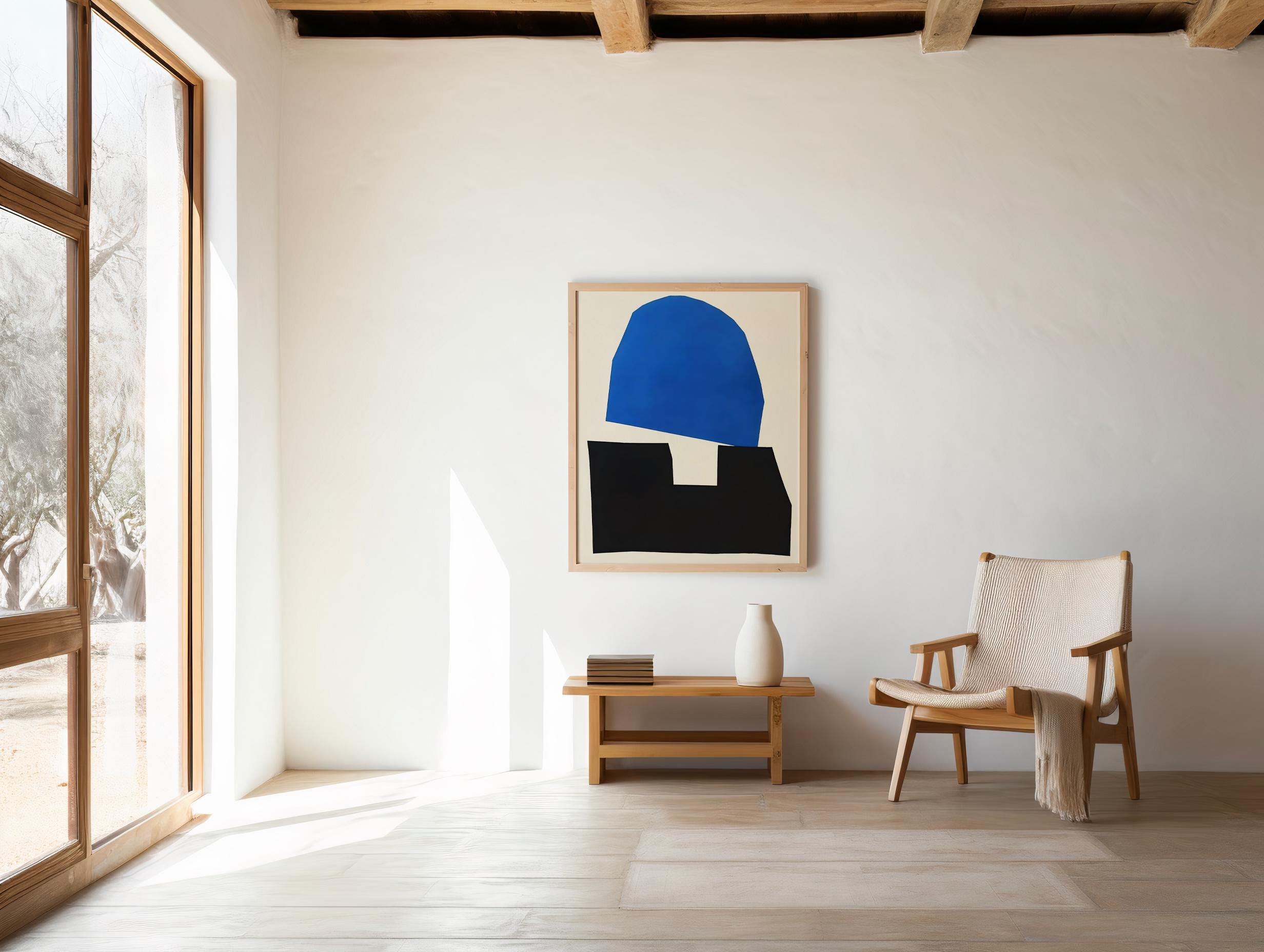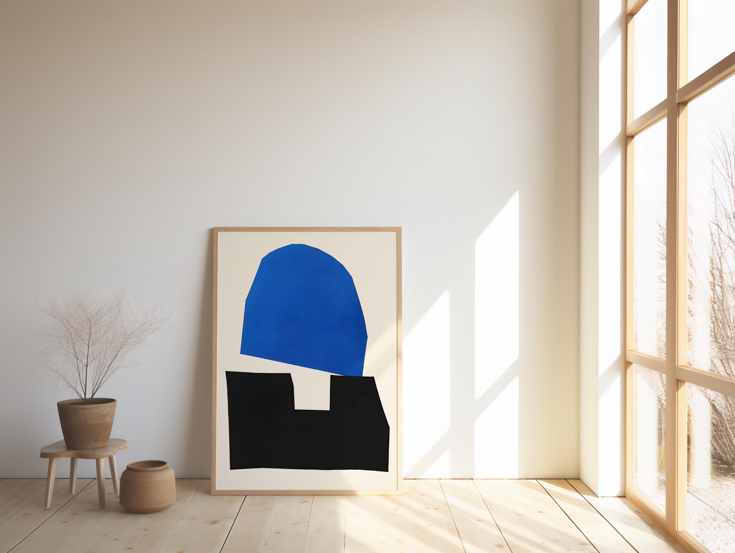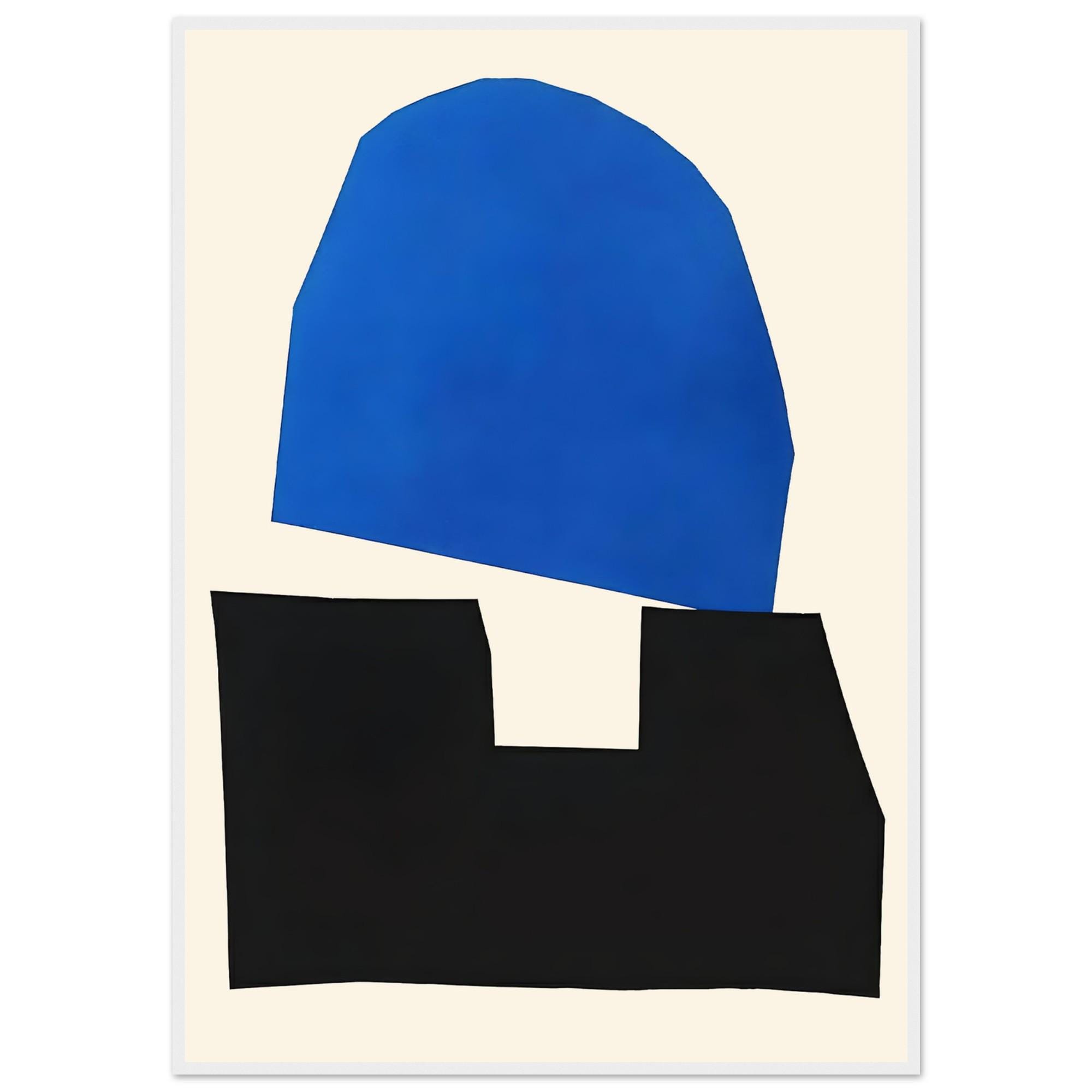 This framed poster has a bold modern abstract composition featuring vivid electric blue and deep black geometric forms set against a warm neutral background. Clean, minimal, and striking — designed to bring structure and visual impact to contemporary interiors, bedrooms, living areas, and curated gallery walls.