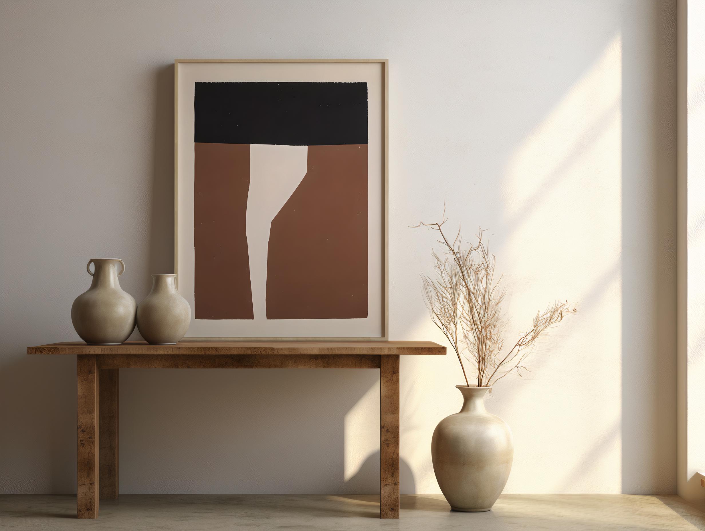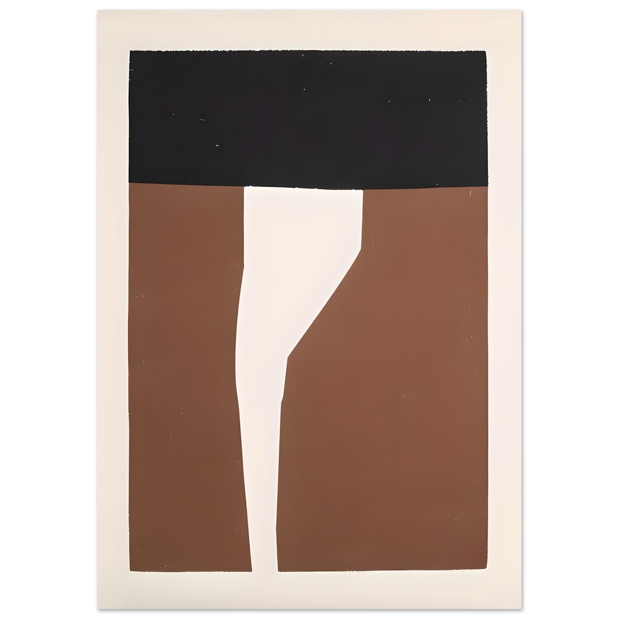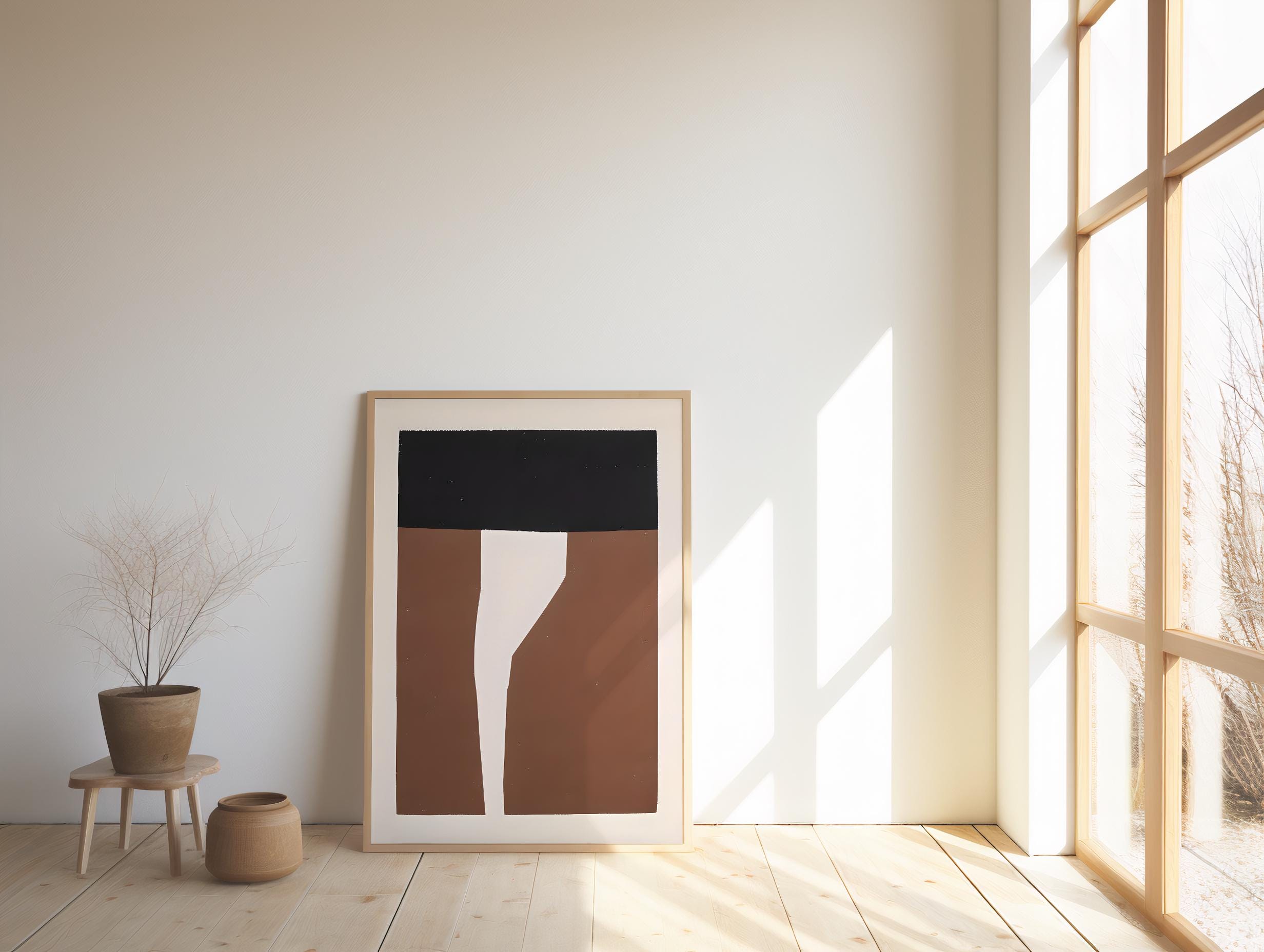 A warm modern abstract composition featuring deep brown geometric blocks and a bold black upper band, contrasted with a clean sculptural center cutout. Earthy, minimal, and architectural — perfect for contemporary interiors, studio spaces, and curated gallery walls.