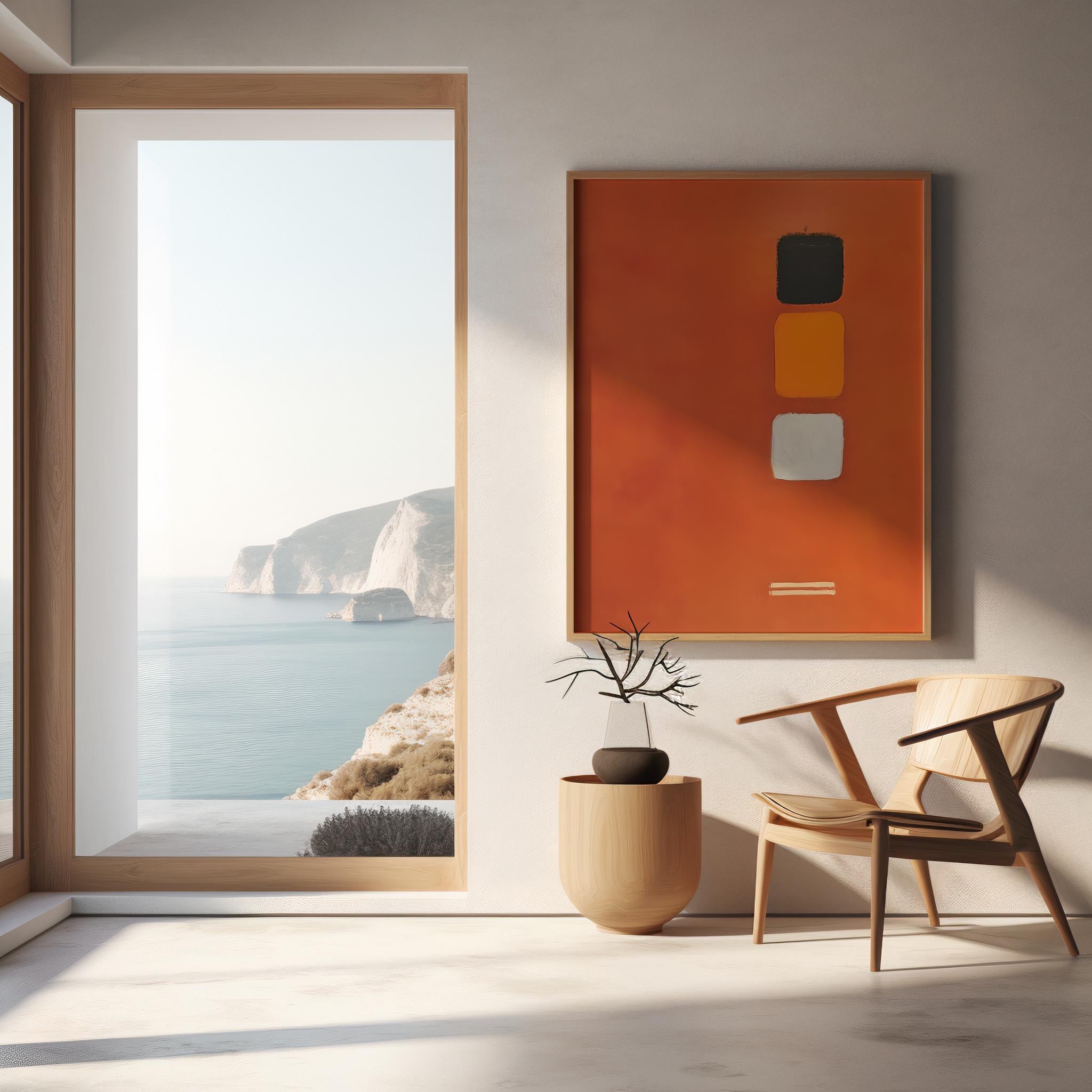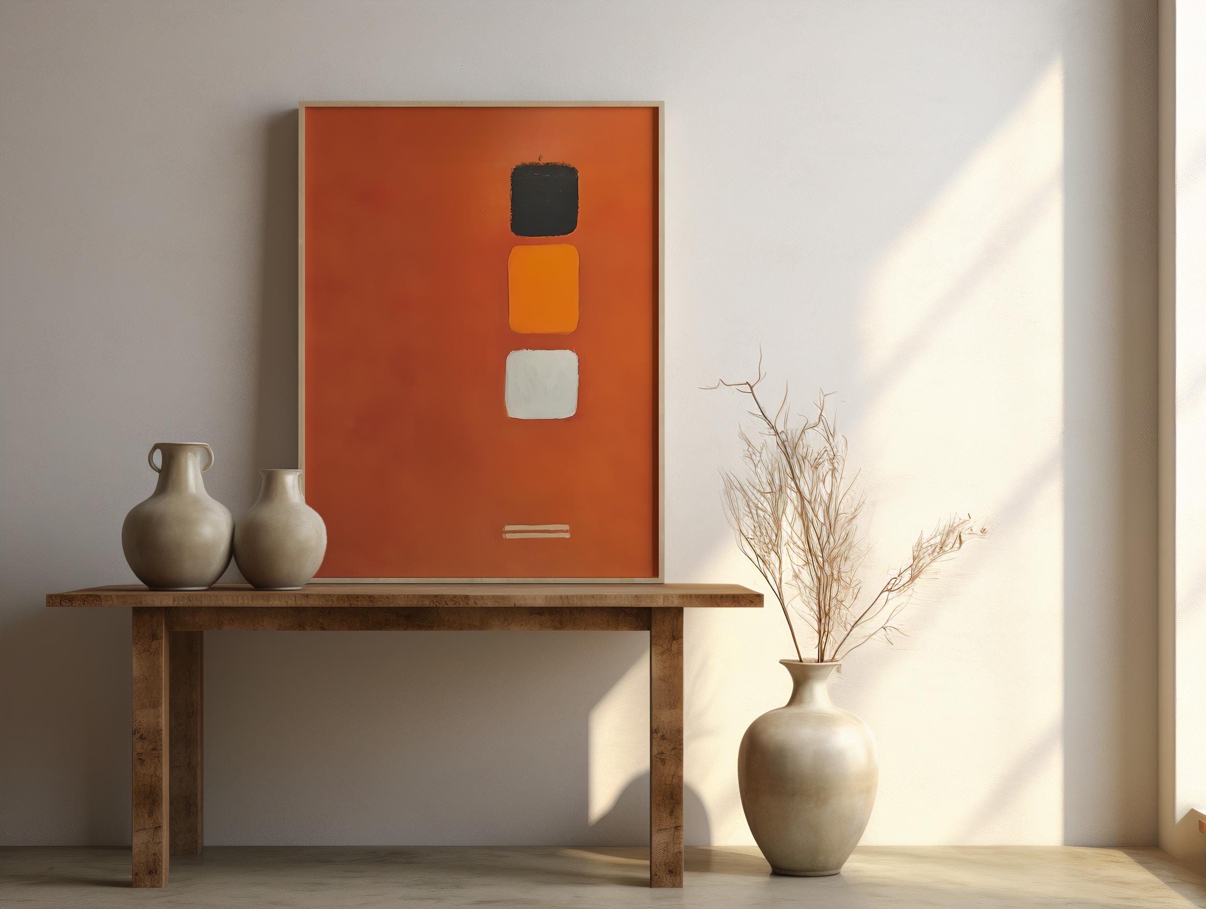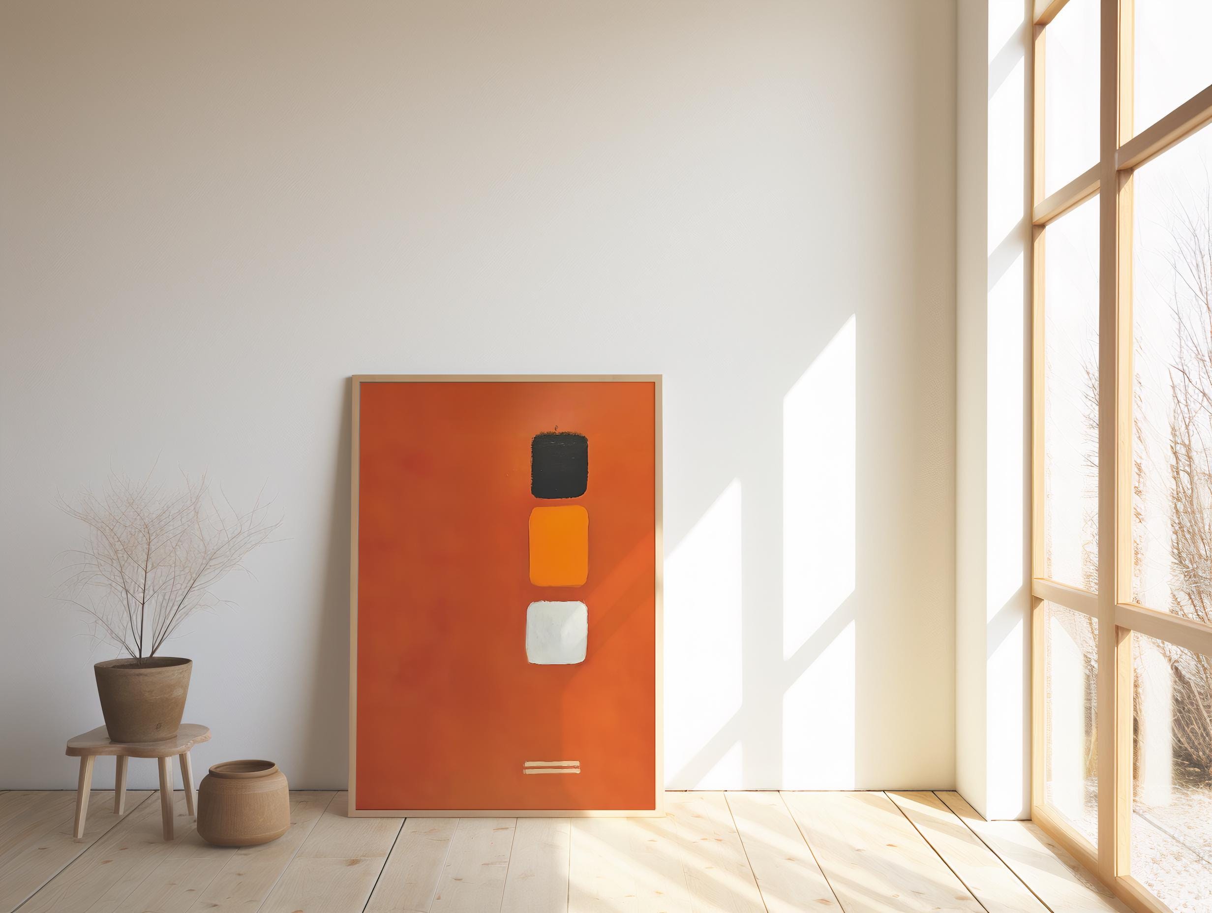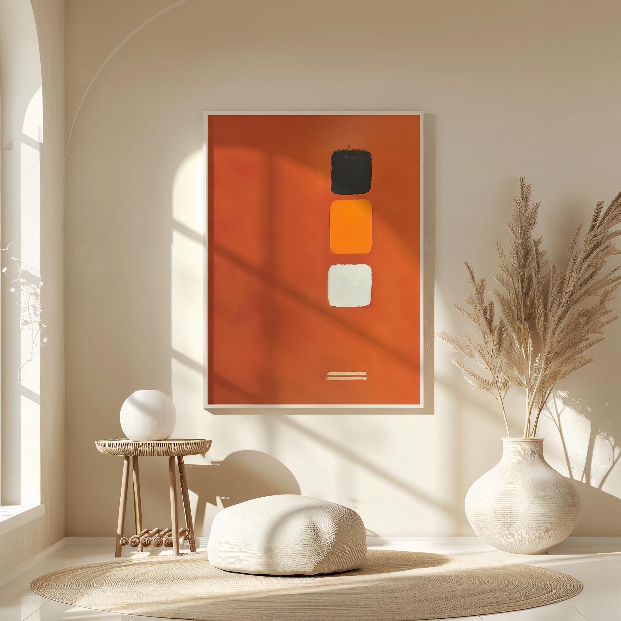 This modern abstract orange framed poster features bold geometric forms and rich warm tones, creating a striking mid-century inspired centerpiece for any room. Designed for clean, elevated interiors, this artwork brings depth, balance, and modern warmth to bedrooms, living rooms, hallways, and offices.