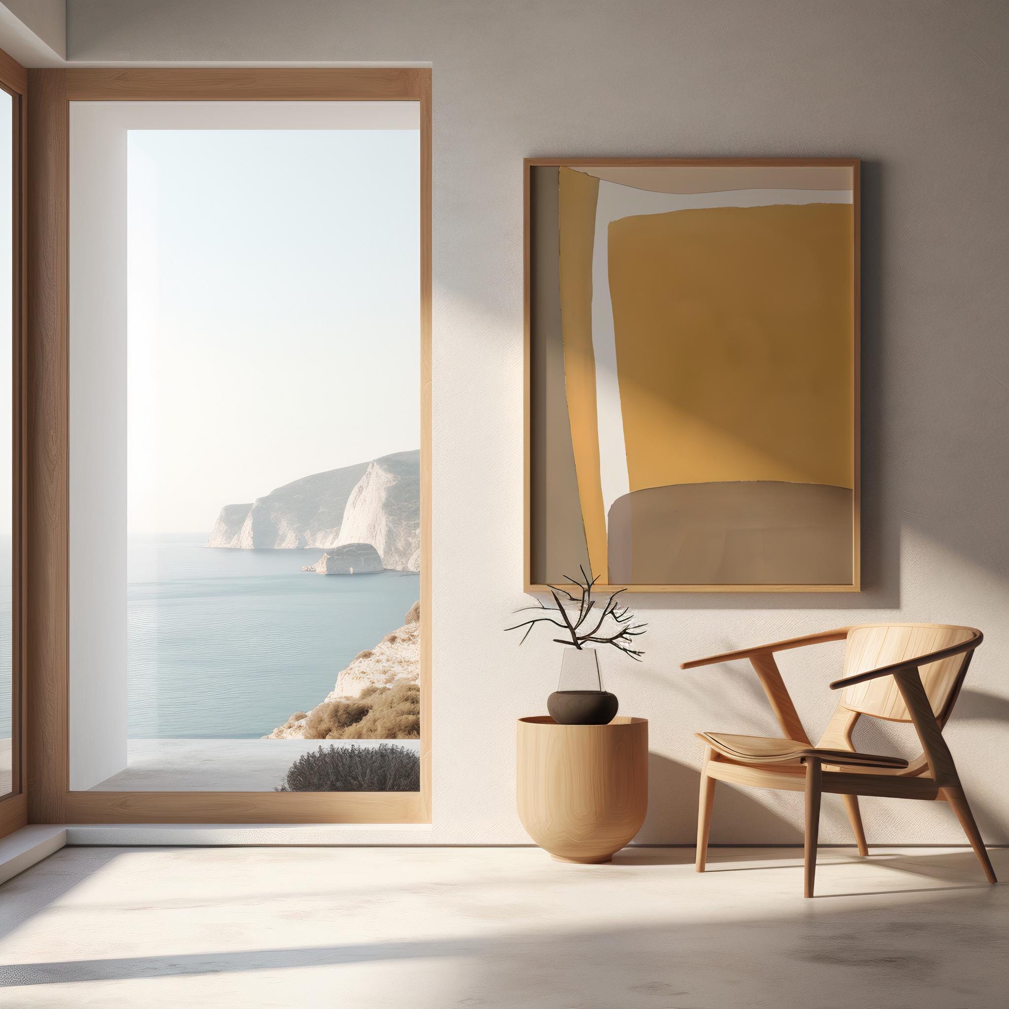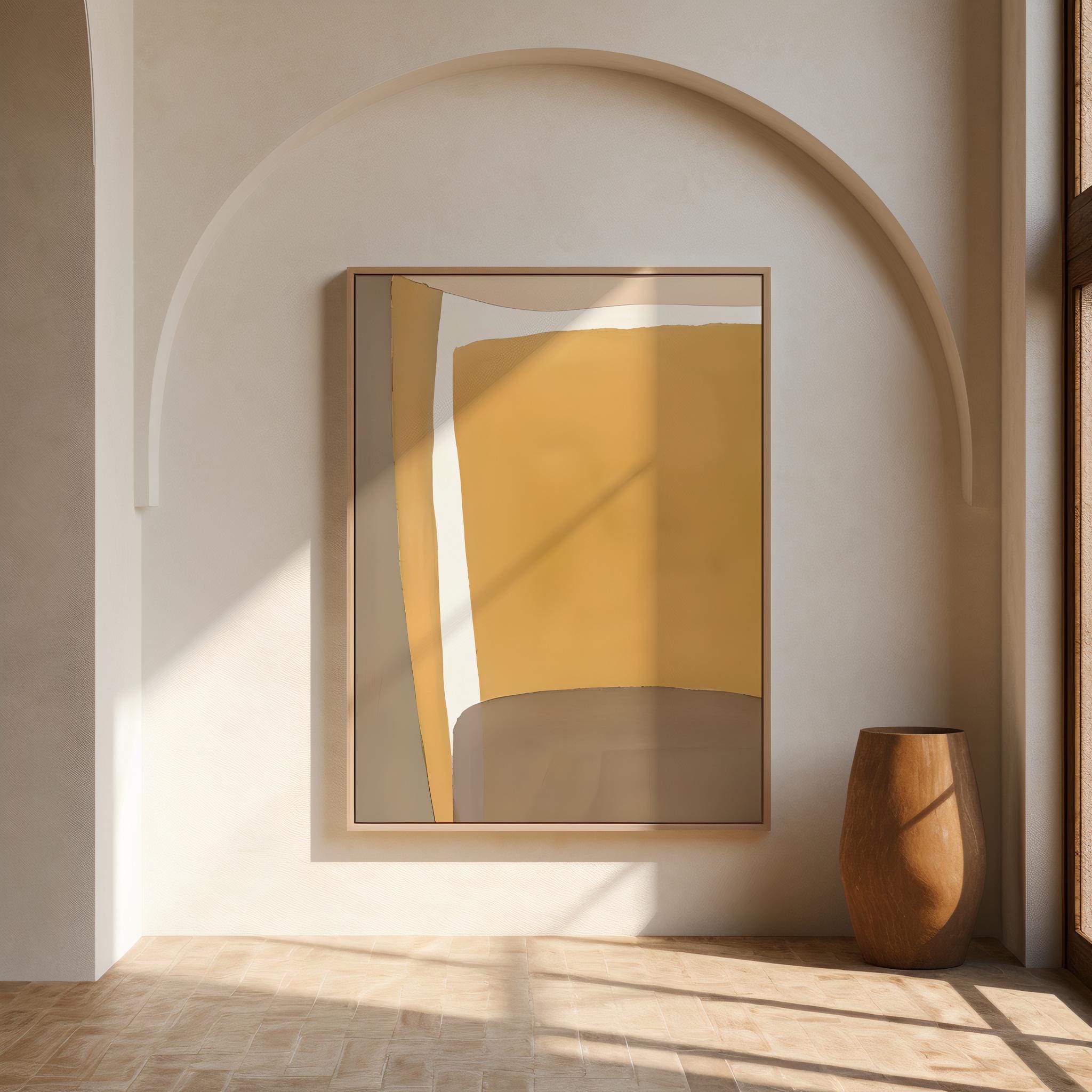 This modern neutral fine art poster features a warm ochre center framed by soft, organic curves and clean minimalist lines. The palette blends earthy neutrals with gentle contrast, creating a calm, refined, contemporary aesthetic ideal for warm modern interiors.
