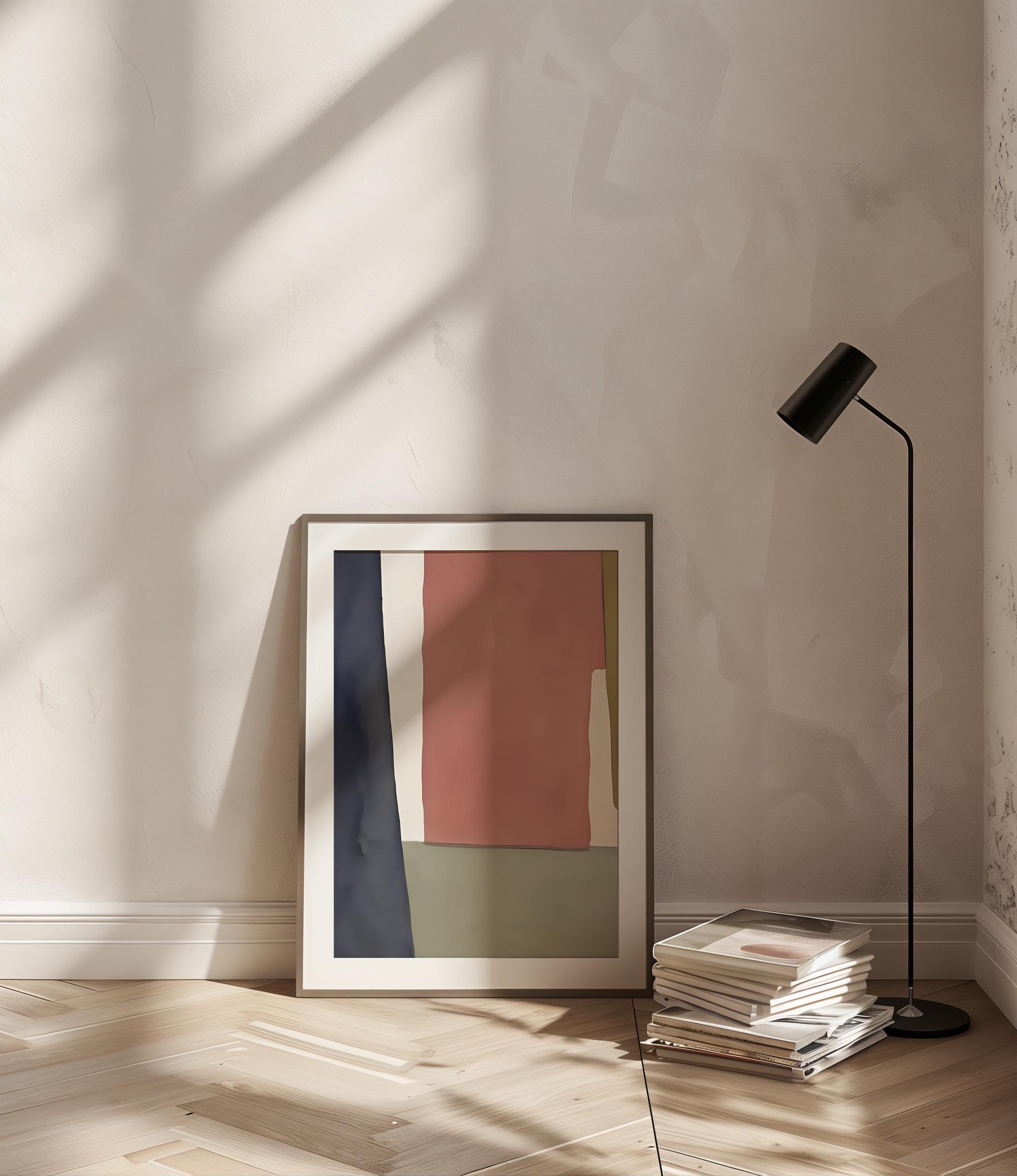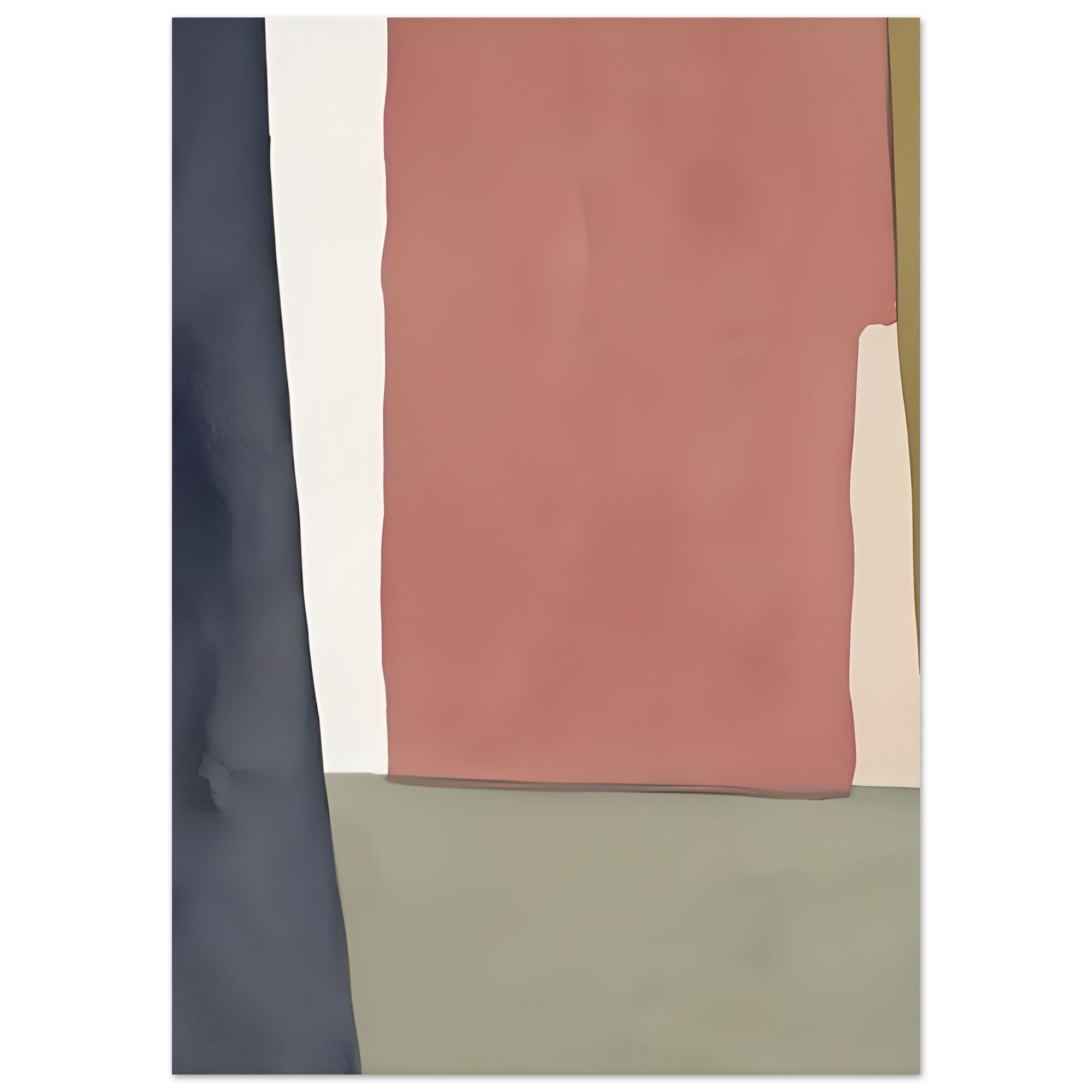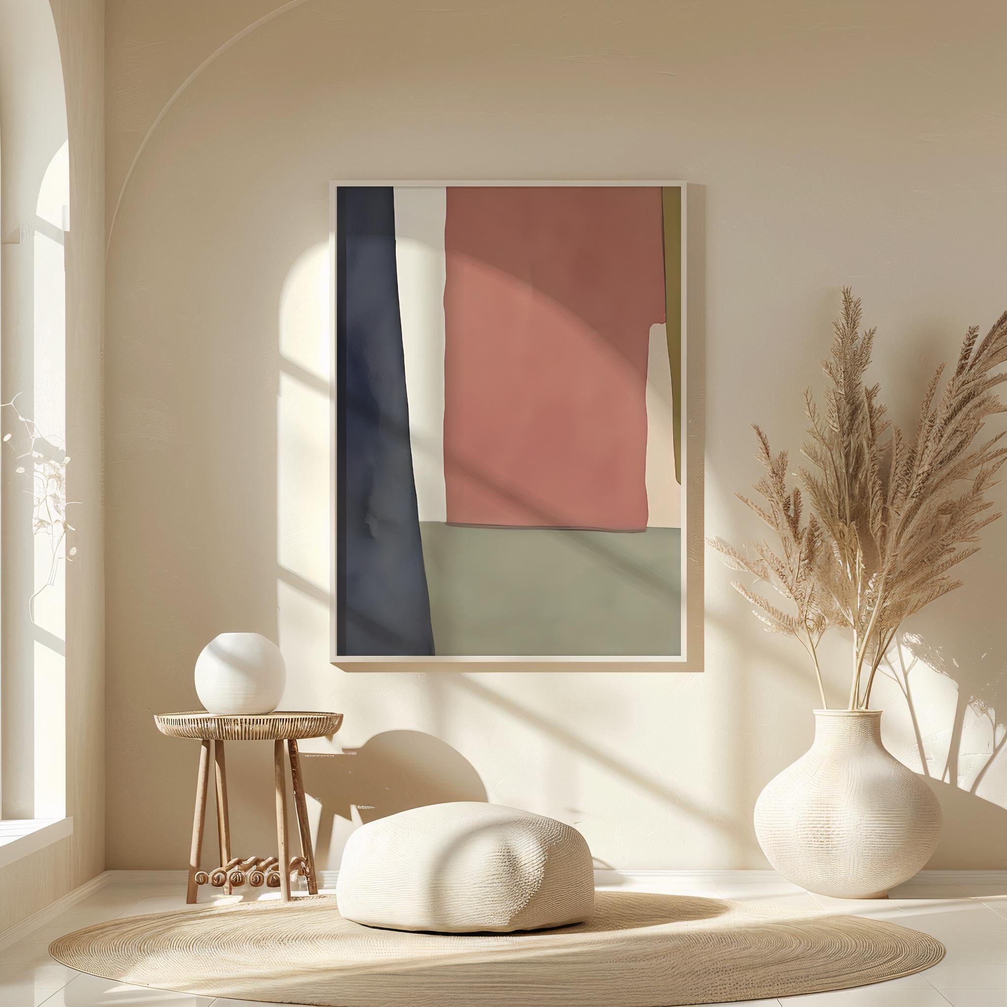 This modern geometric fine art poster features warm clay pink, deep navy, soft cream, and muted olive shapes arranged into a clean, balanced abstract composition. The muted palette and minimal design make this piece perfect for warm neutral interiors, Japandi spaces, Scandinavian homes, and modern organic décor.