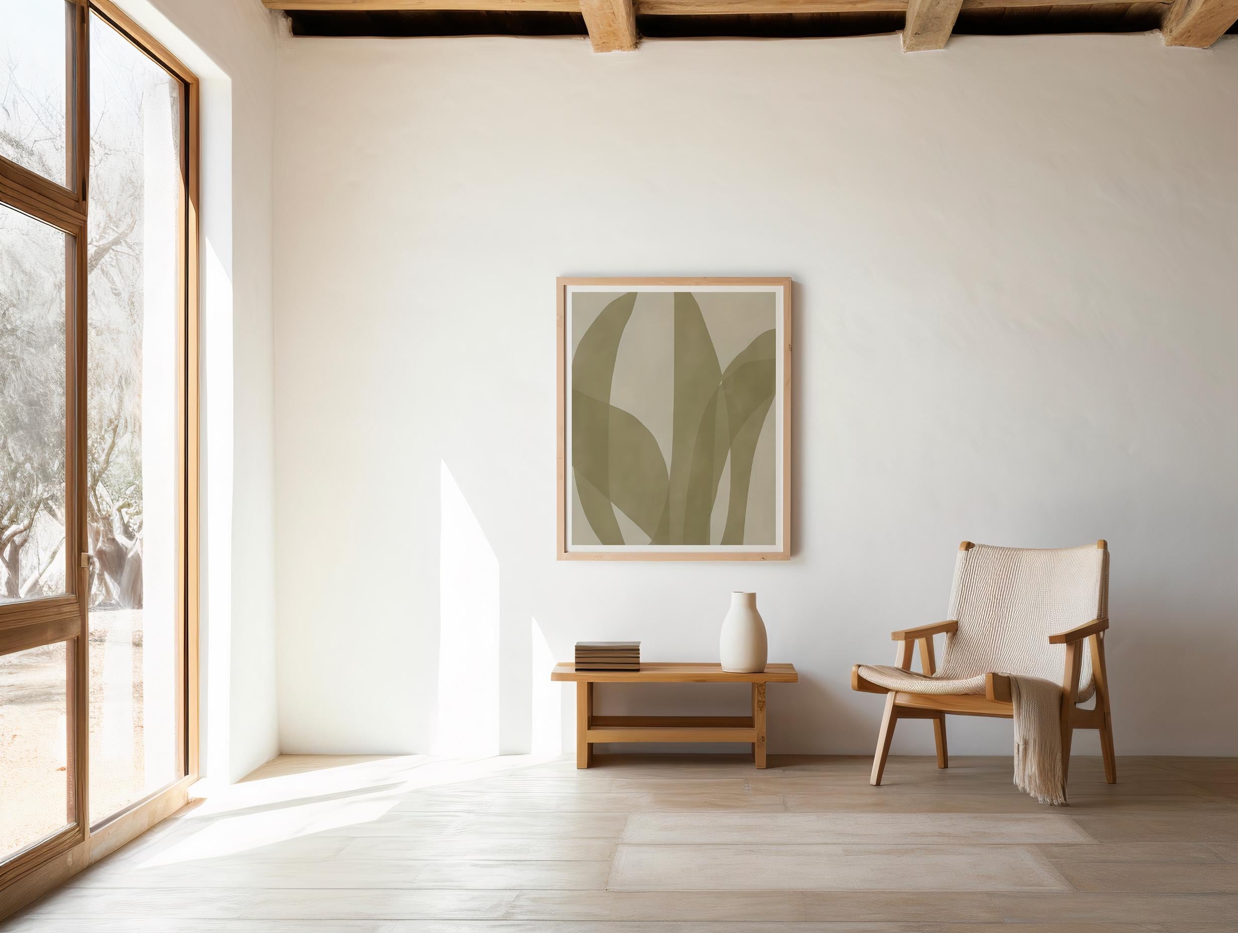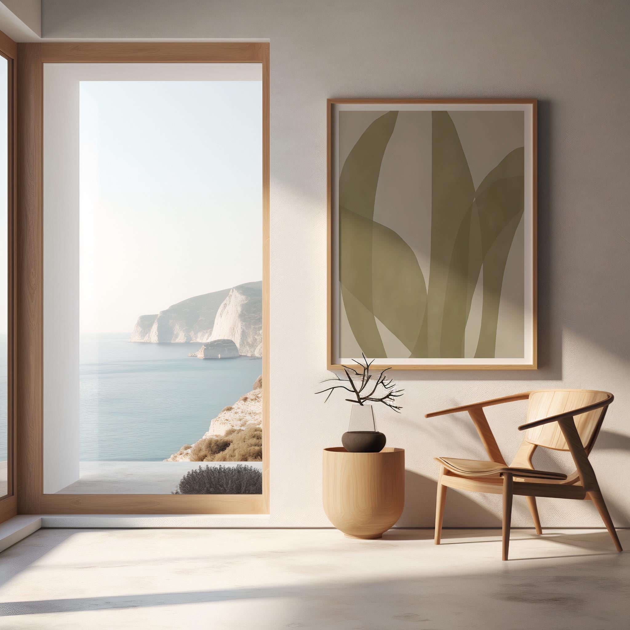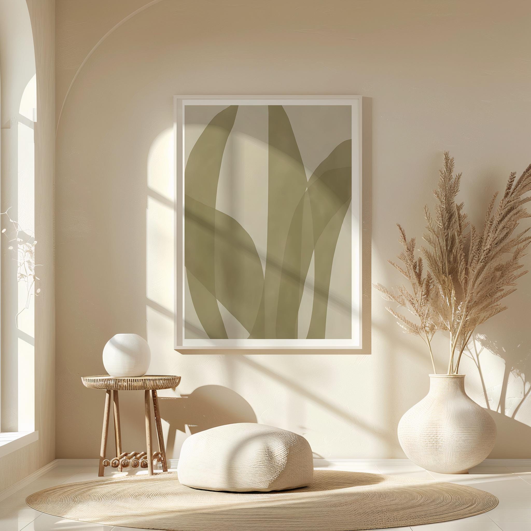 This modern olive organic fine art poster features soft, overlapping leaf-like shapes in a muted, natural palette. The translucent layers create calm movement and warmth, making this piece ideal for Japandi, Scandinavian, minimalist, or earthy-neutral interiors.