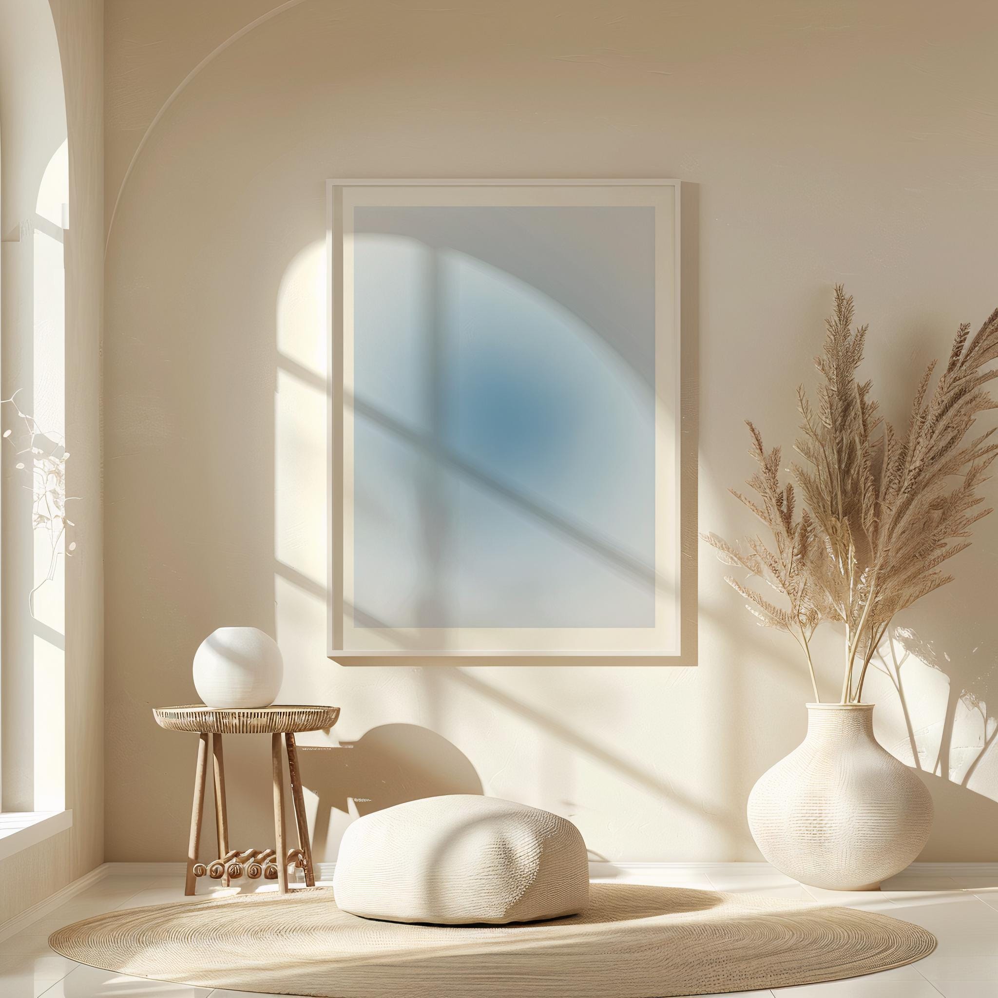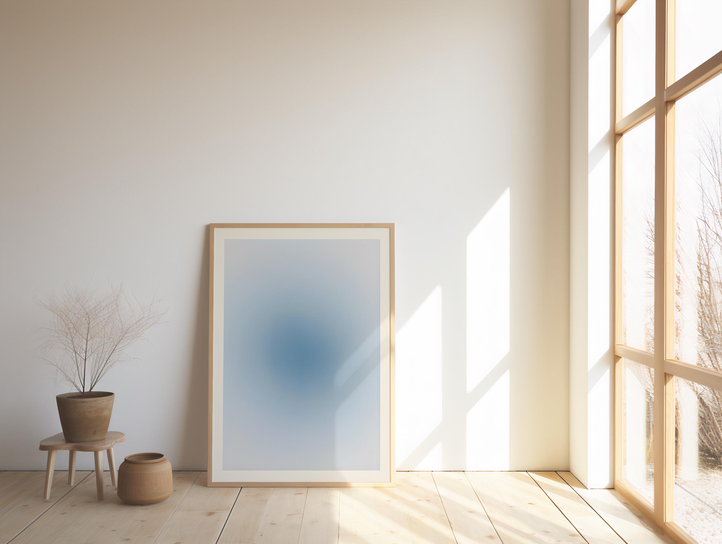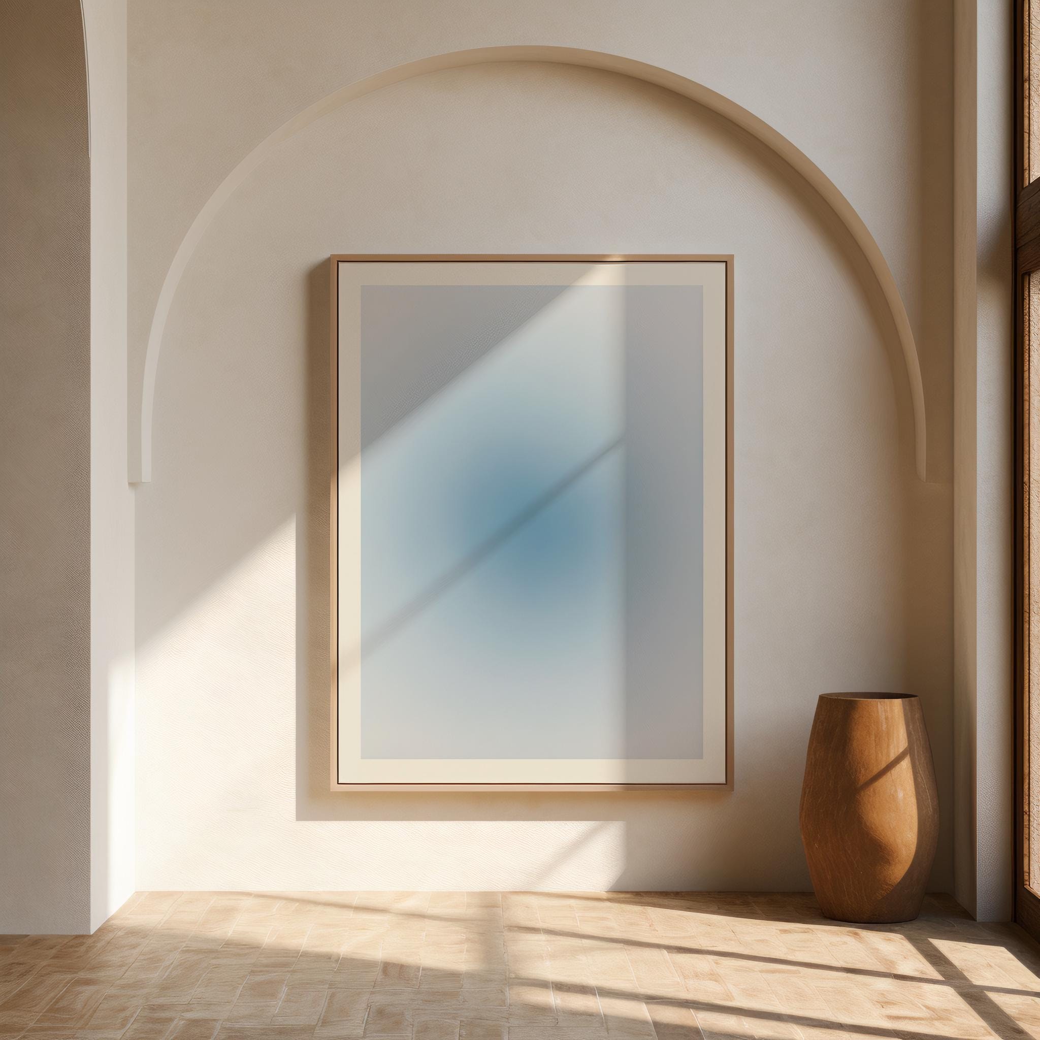 This fine art poster features a soft, atmospheric blue gradient that gently fades outward into pale neutrals, creating a soothing, cloud-like composition. Its minimal, airy design brings calm, clarity, and a sense of spaciousness to any interior. Perfect for bedrooms, living rooms, nurseries, and serene modern spaces.