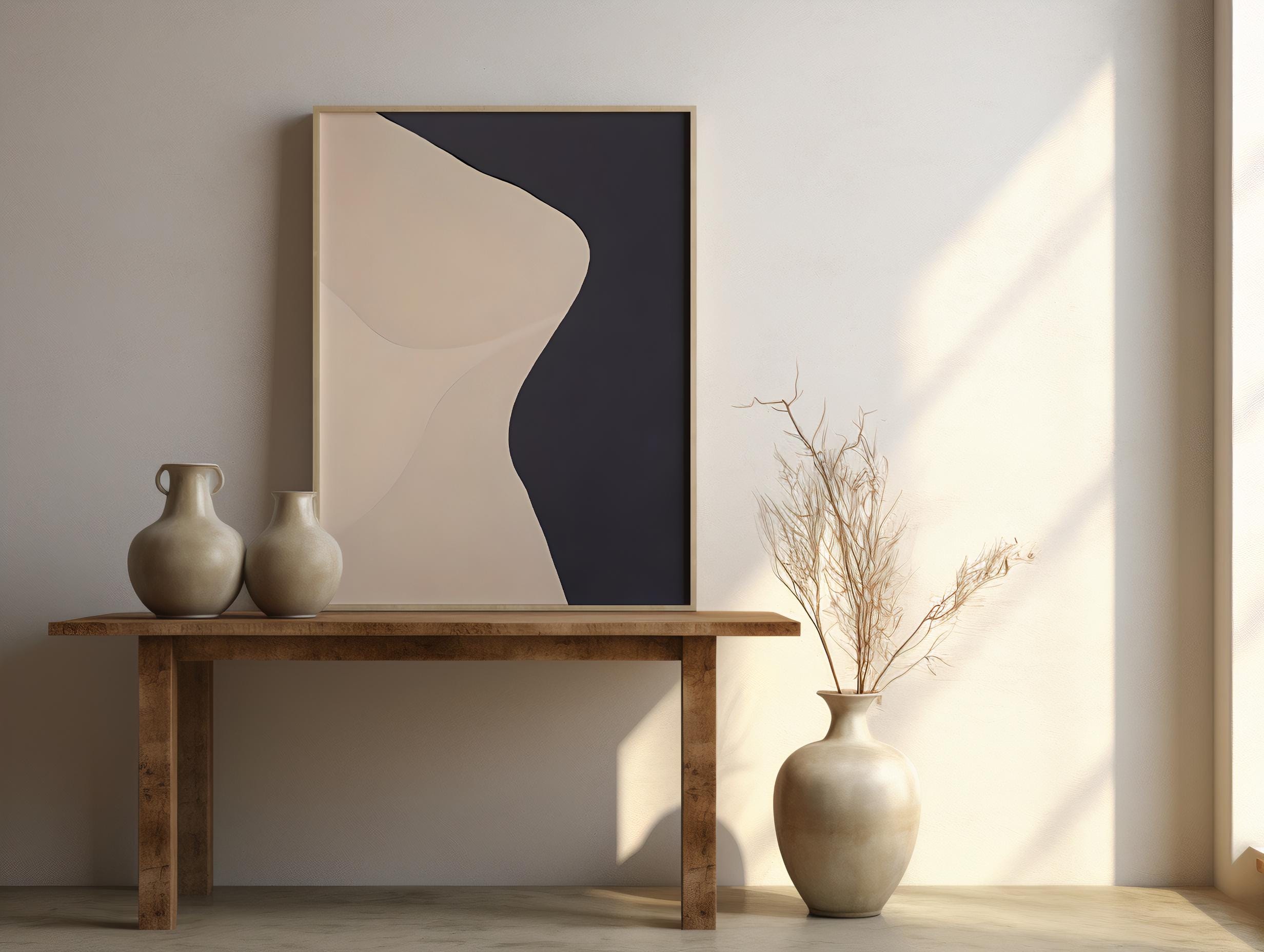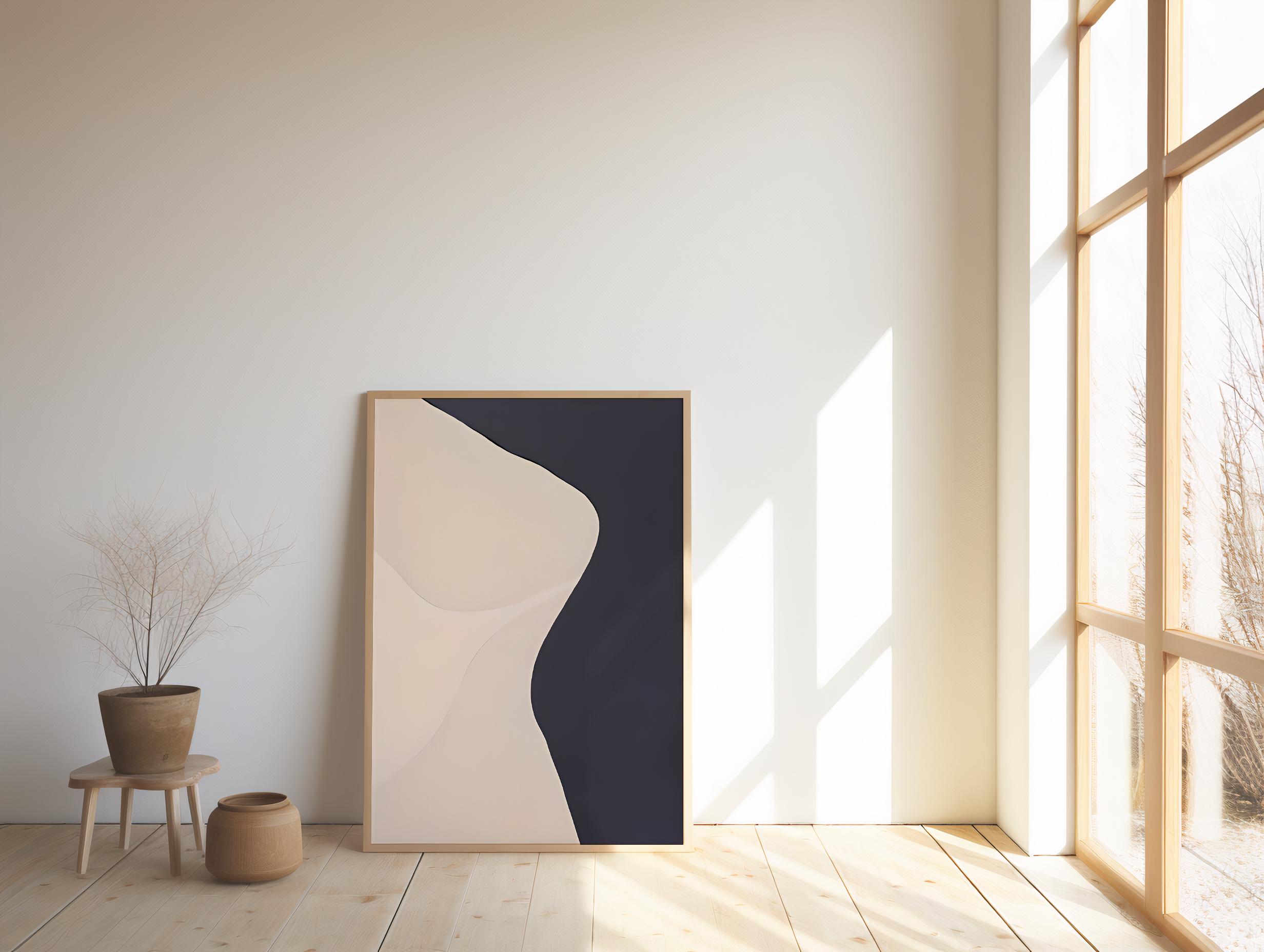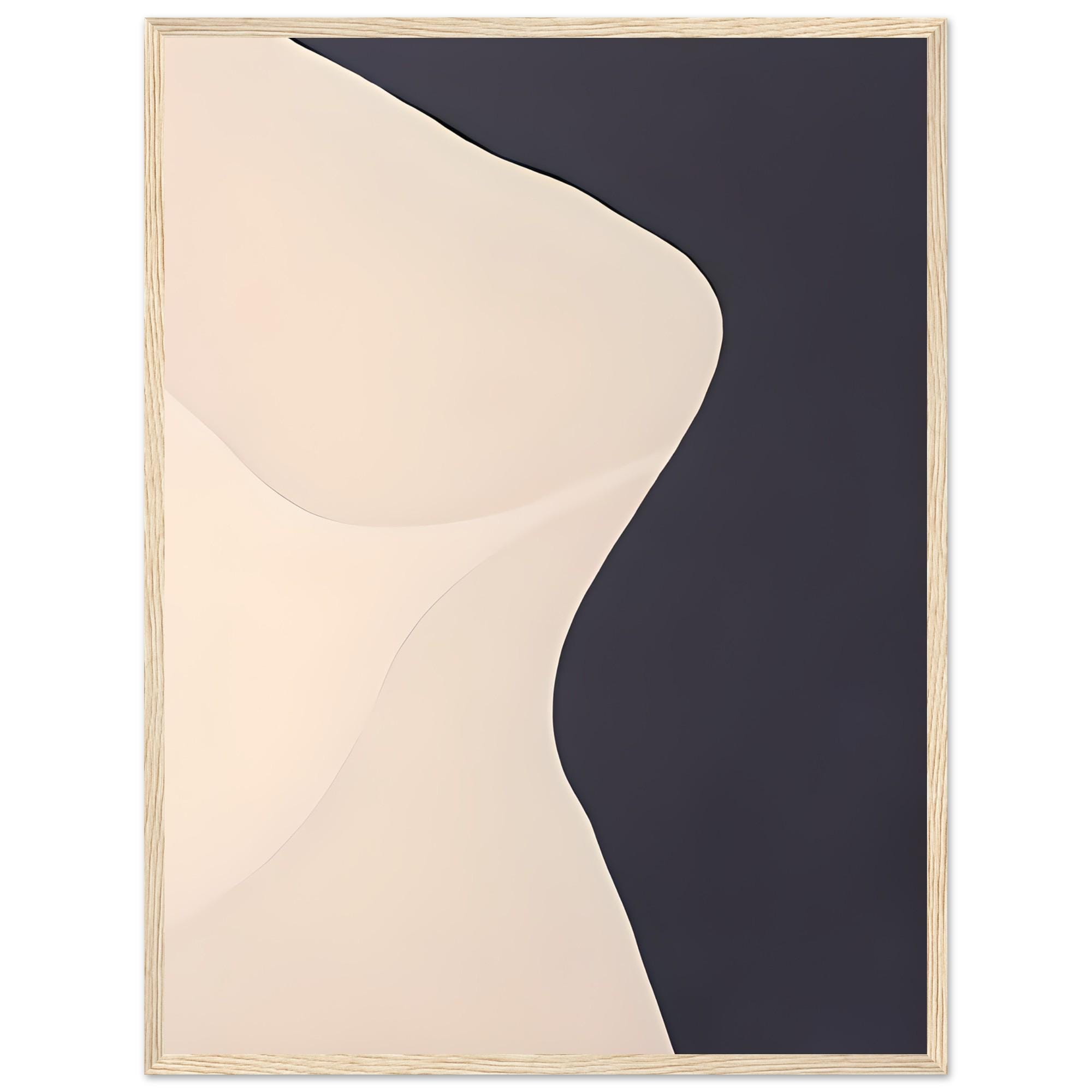 This minimalist neutral artwork features soft flowing beige shapes against an organic navy form, creating a calm, sculptural composition perfect for modern and contemporary interiors. The warm neutral palette and smooth organic curves add quiet sophistication to any space. Printed on museum-quality matte paper and framed in durable pine wood, this piece arrives ready to hang and elevate your home instantly.