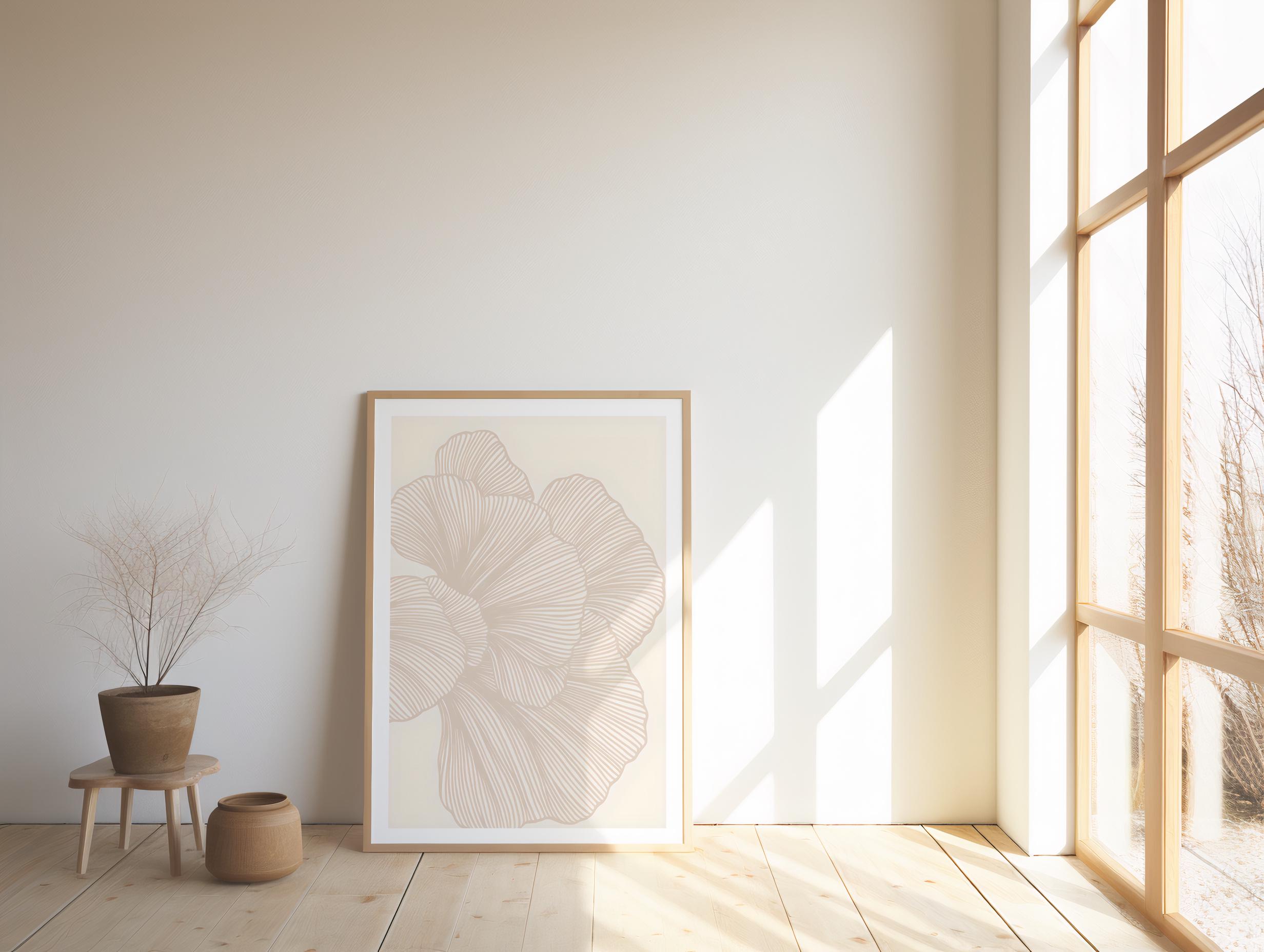 This elegant minimalist botanical line-art print features soft beige abstract floral forms created through delicate hand-drawn linework. The warm neutral tones and organic movement make it a timeless, calming piece designed to elevate any modern interior. This edition includes a clean white border, giving it a refined gallery-style finish.
