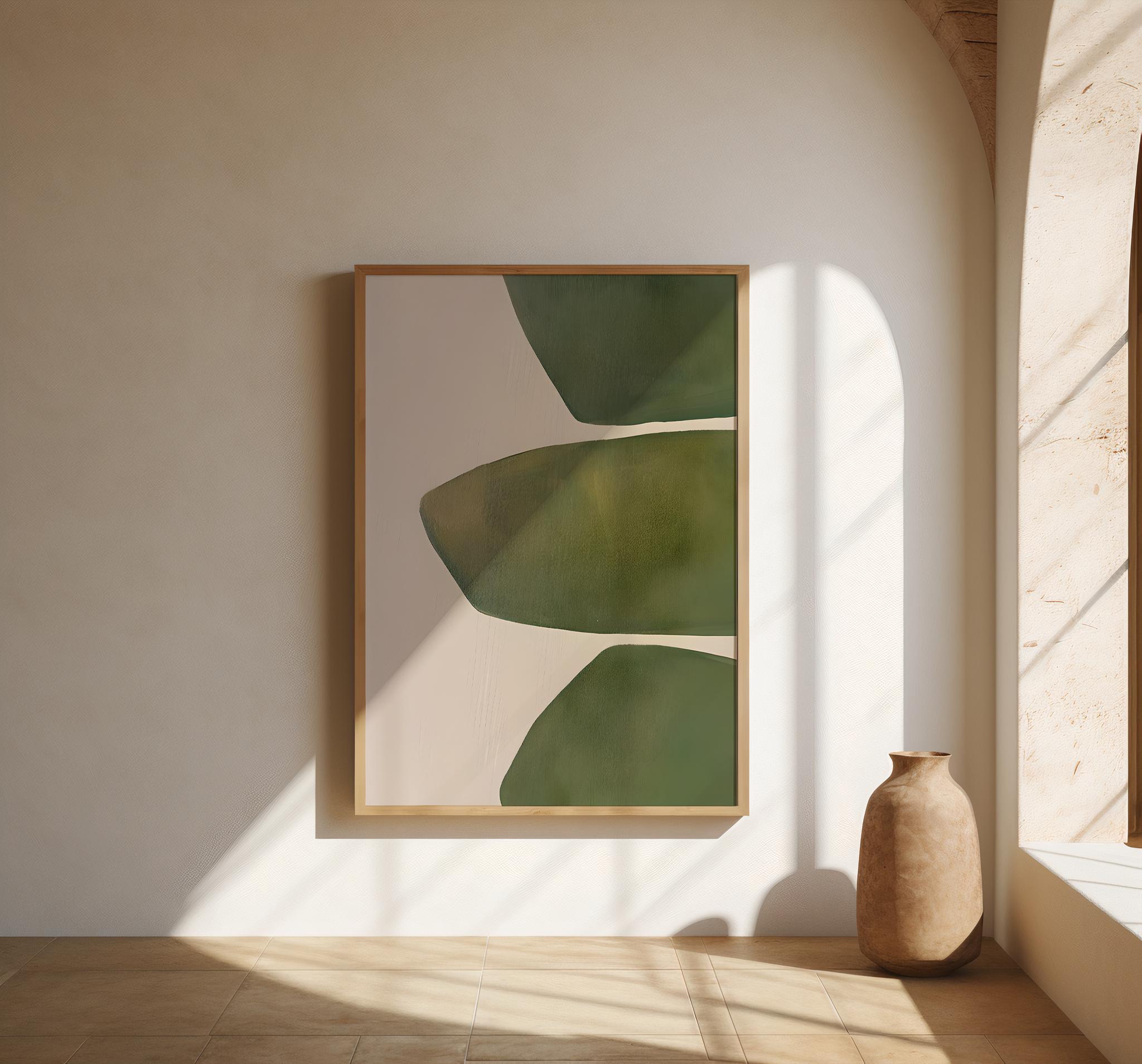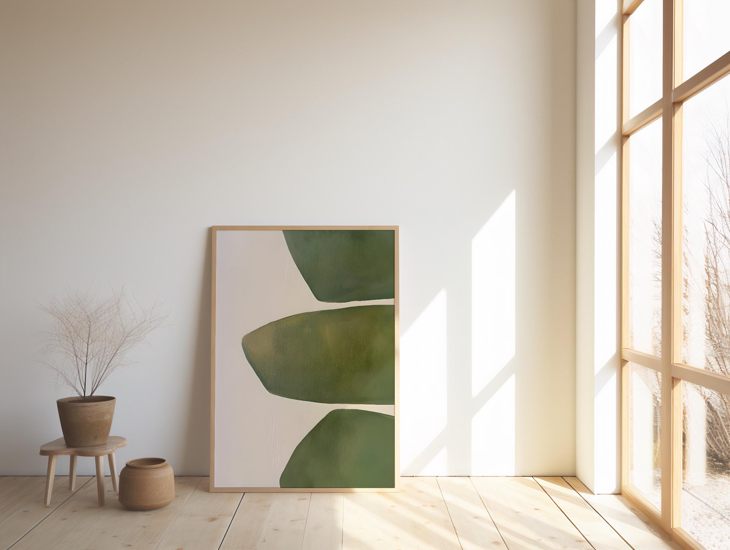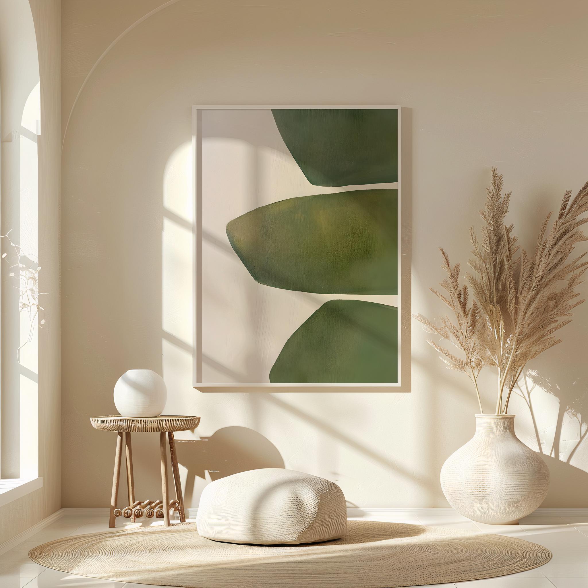 Transform your space instantly with this minimalist green abstract art print, featuring soft organic shapes and a serene botanical-inspired palette. Designed in a calming modern style, this artwork brings a clean, elevated feel to living rooms, bedrooms, offices, and Japandi-inspired interiors.