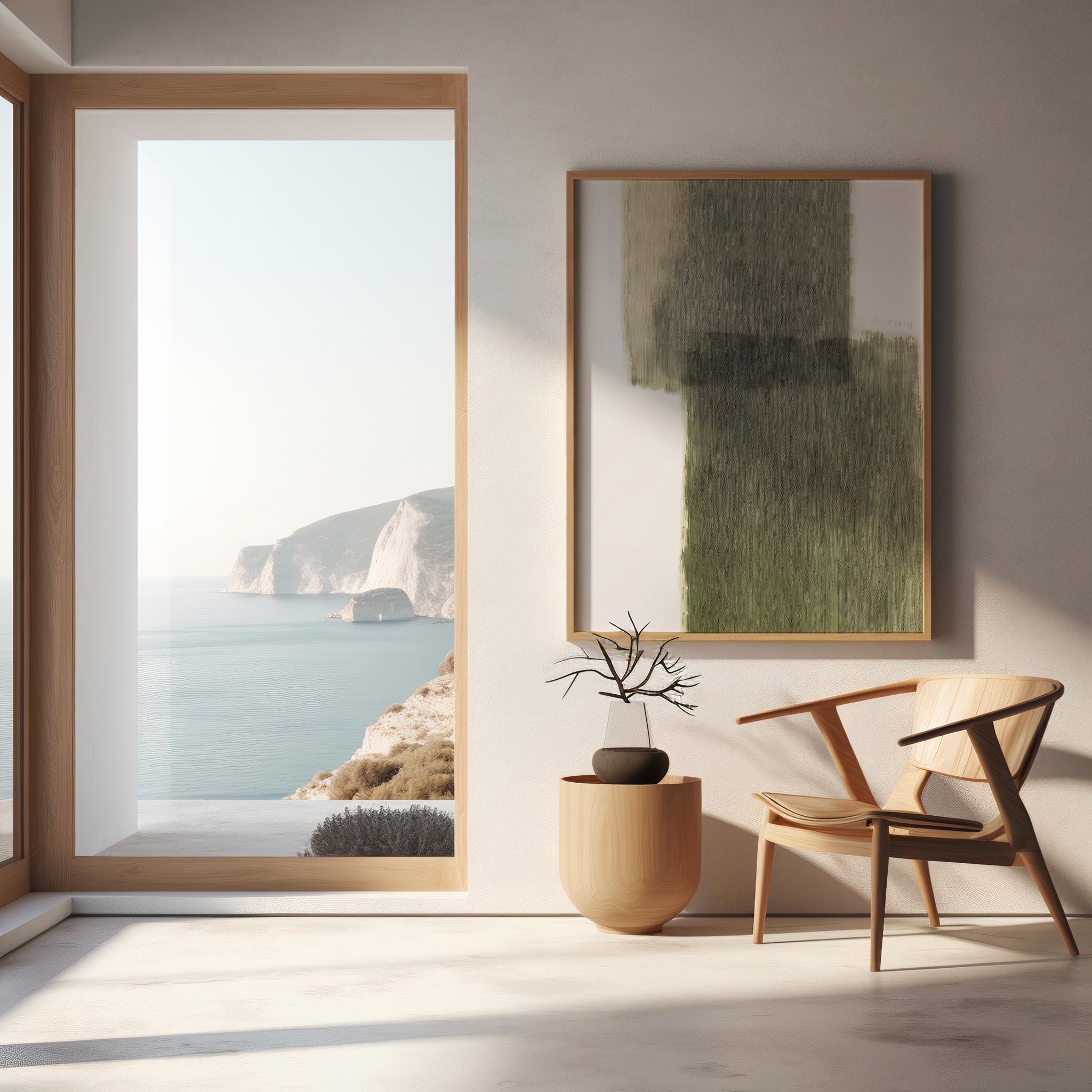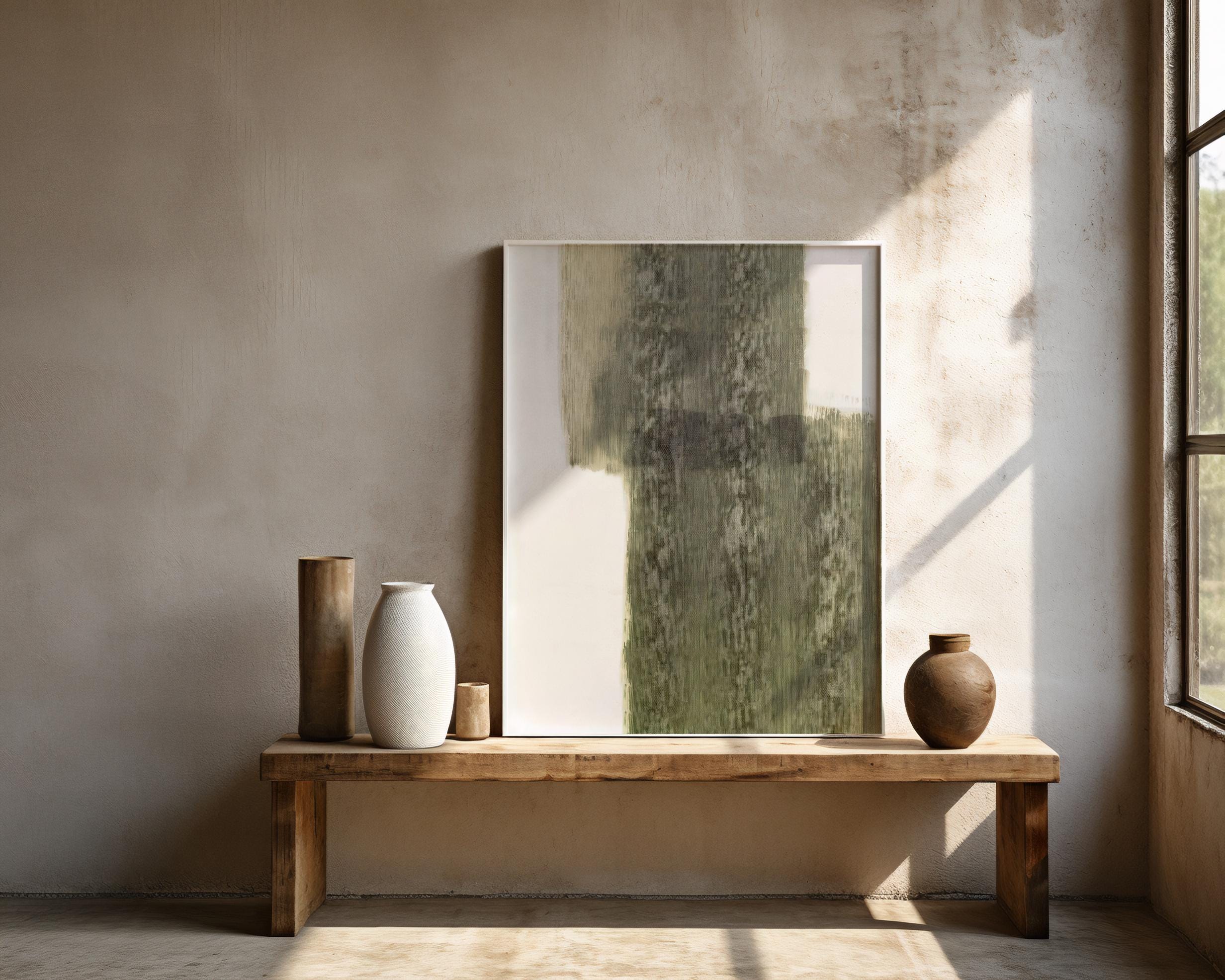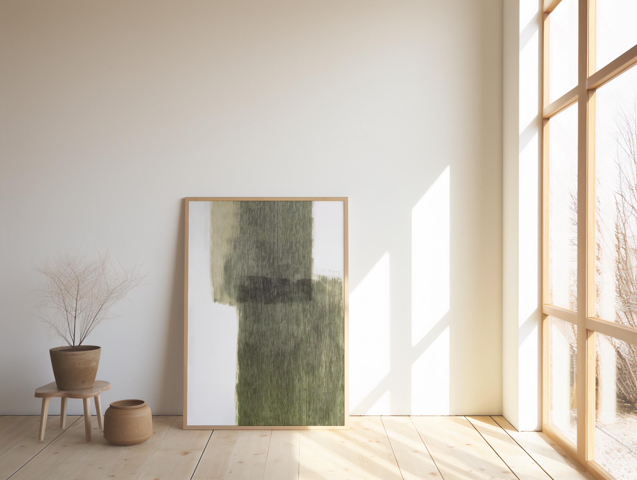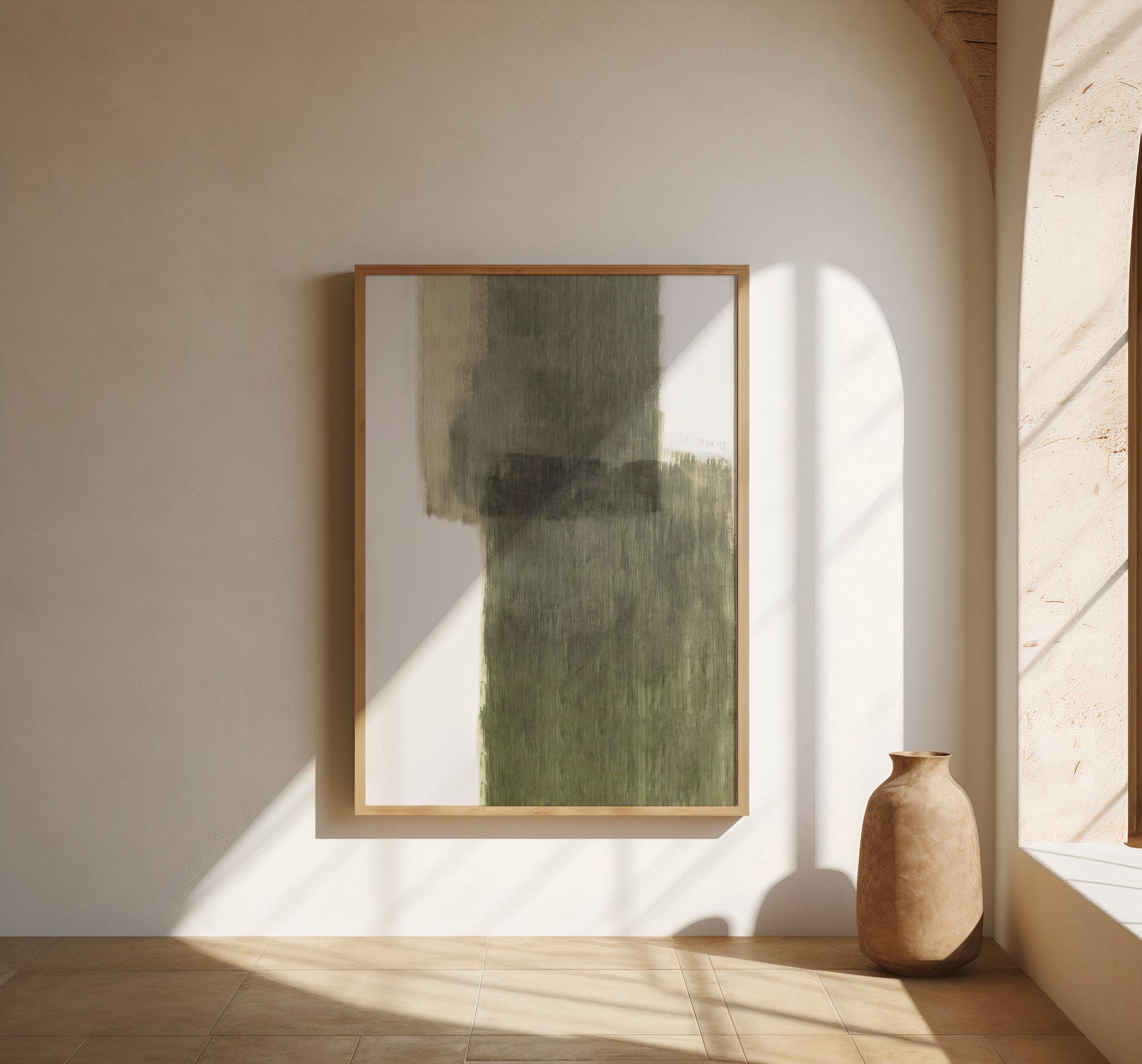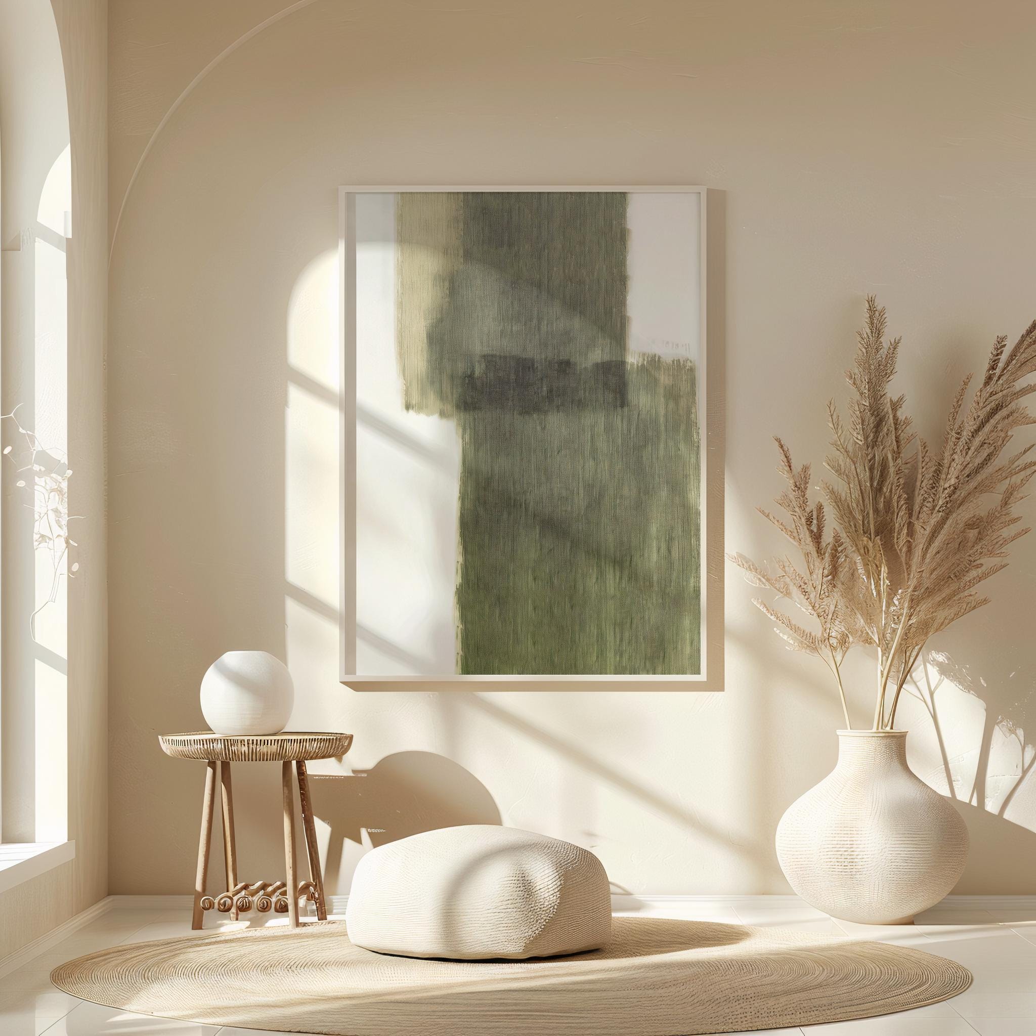This green abstract textured art print features layered brushstrokes, organic movement, and a soft neutral balance—perfect for Japandi, Scandinavian, minimalist, and modern interiors. Its earthy palette and subtle gradient give any room a grounded, elevated, design-forward feel.