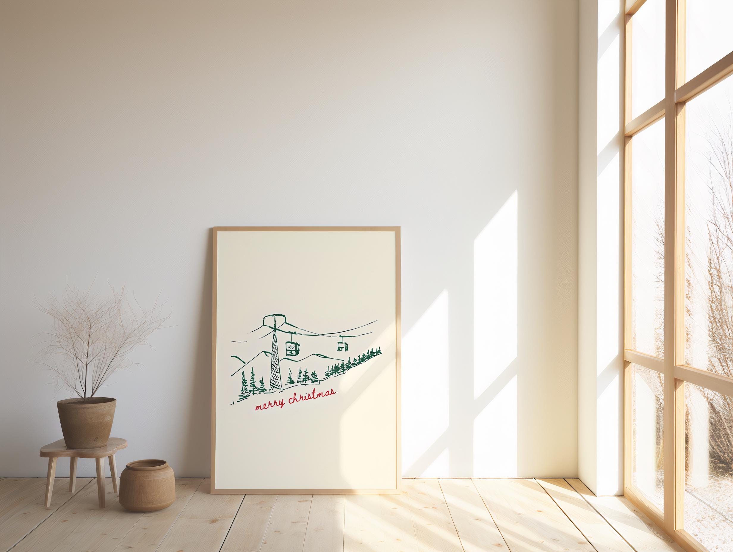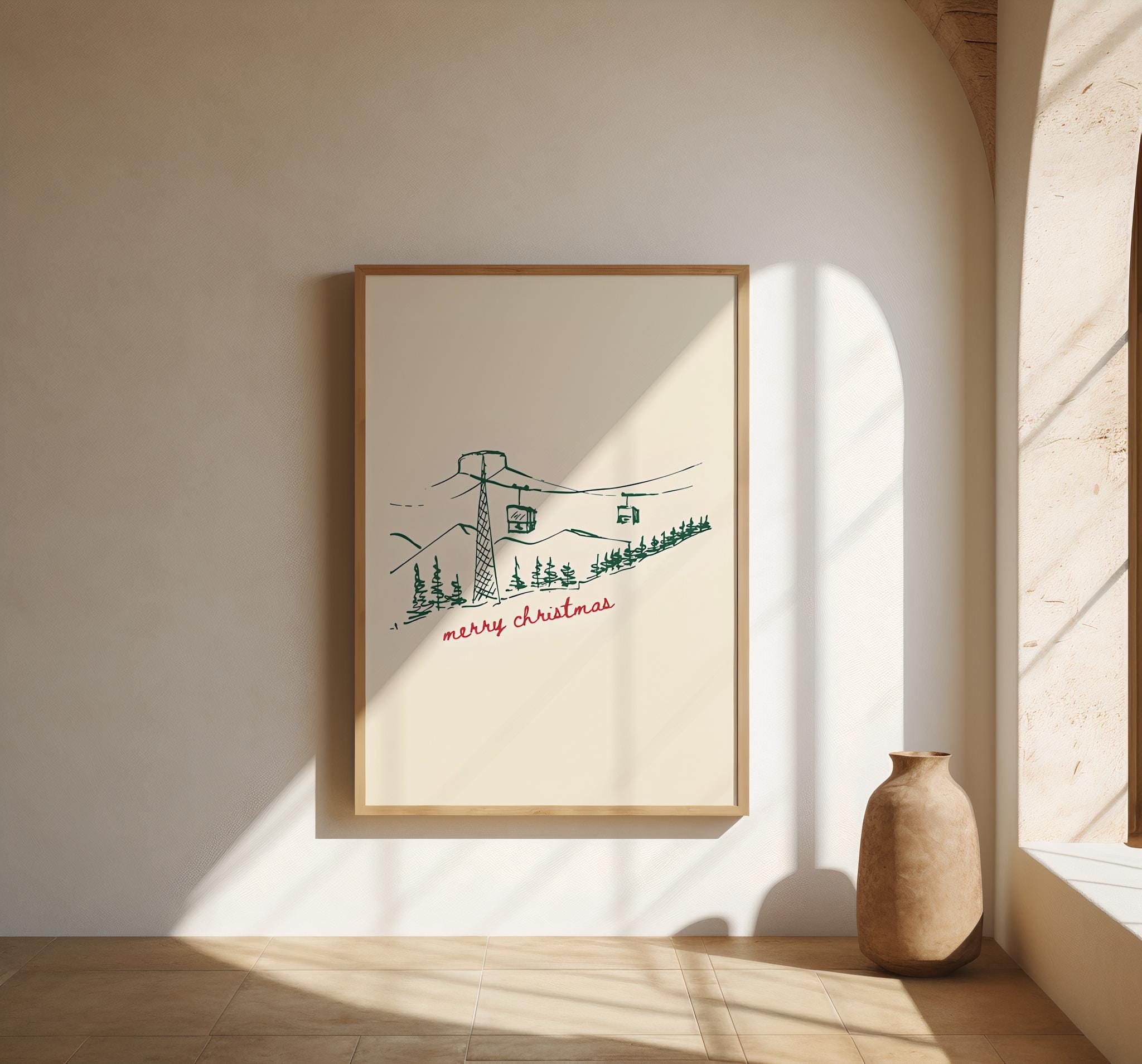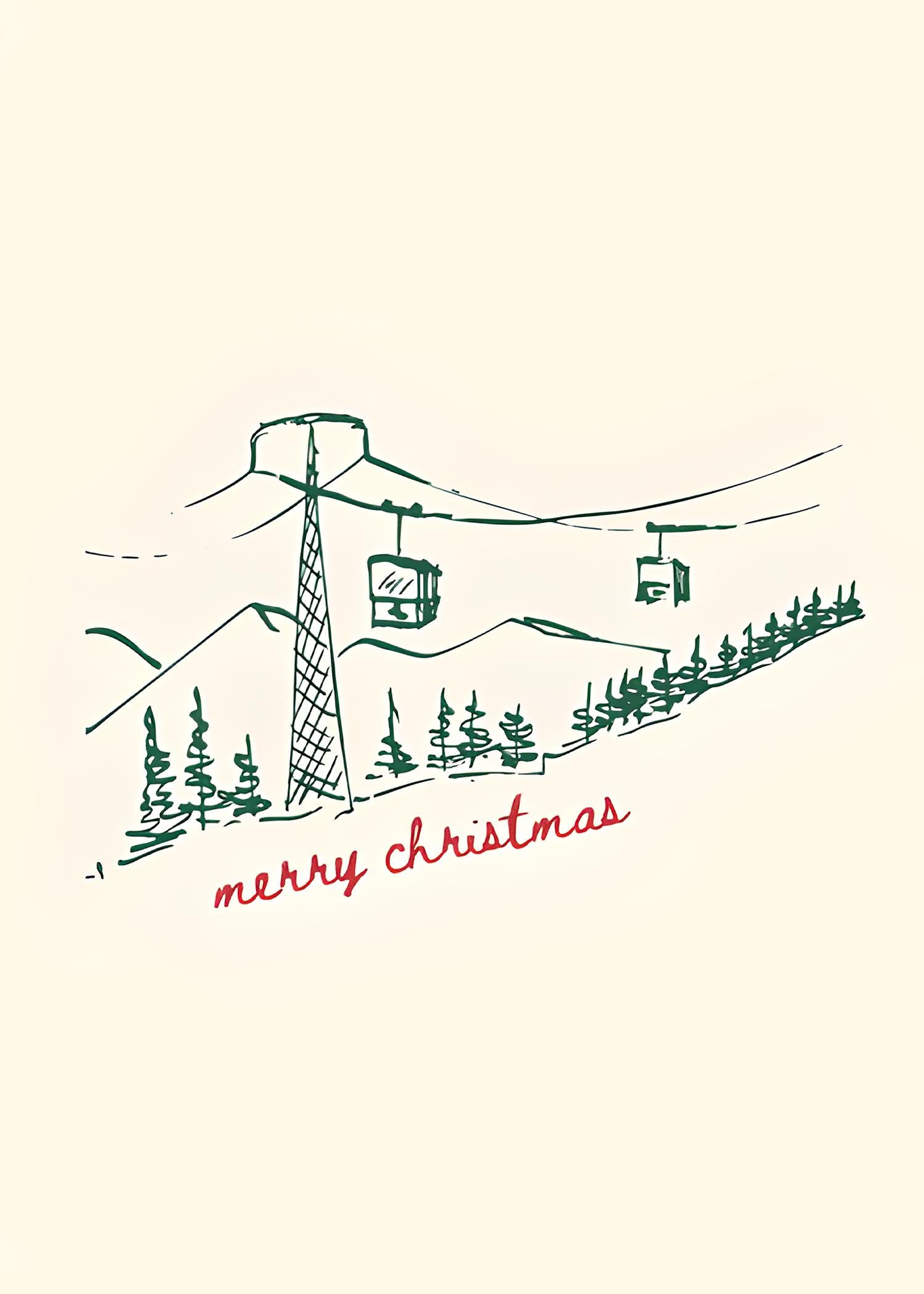 A cozy, minimalist alpine Christmas illustration featuring ski lifts, pine trees, and mountain peaks—finished with a handwritten “merry christmas” in festive red. This modern winter sketch brings soft holiday charm without heavy colors, perfect for cabins, ski homes, neutral interiors, or anyone who loves mountain Christmas vibes.