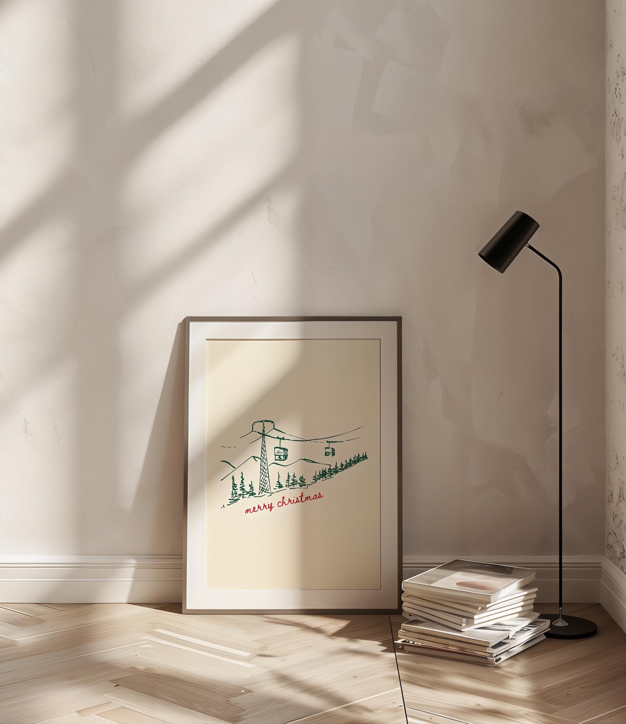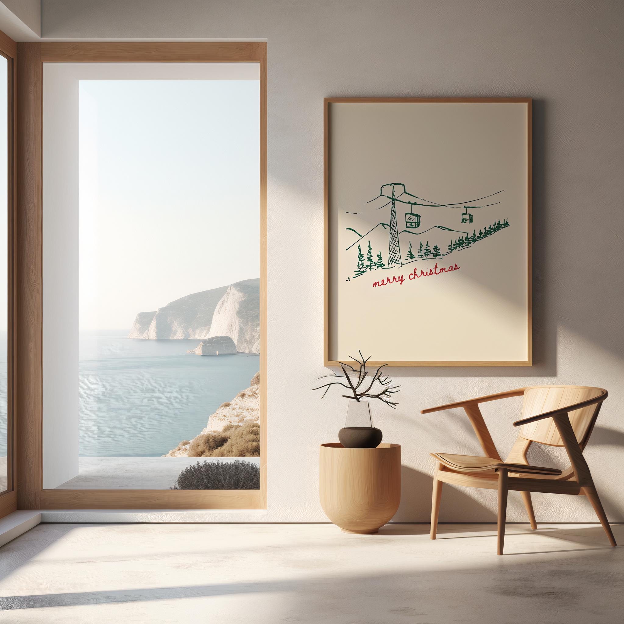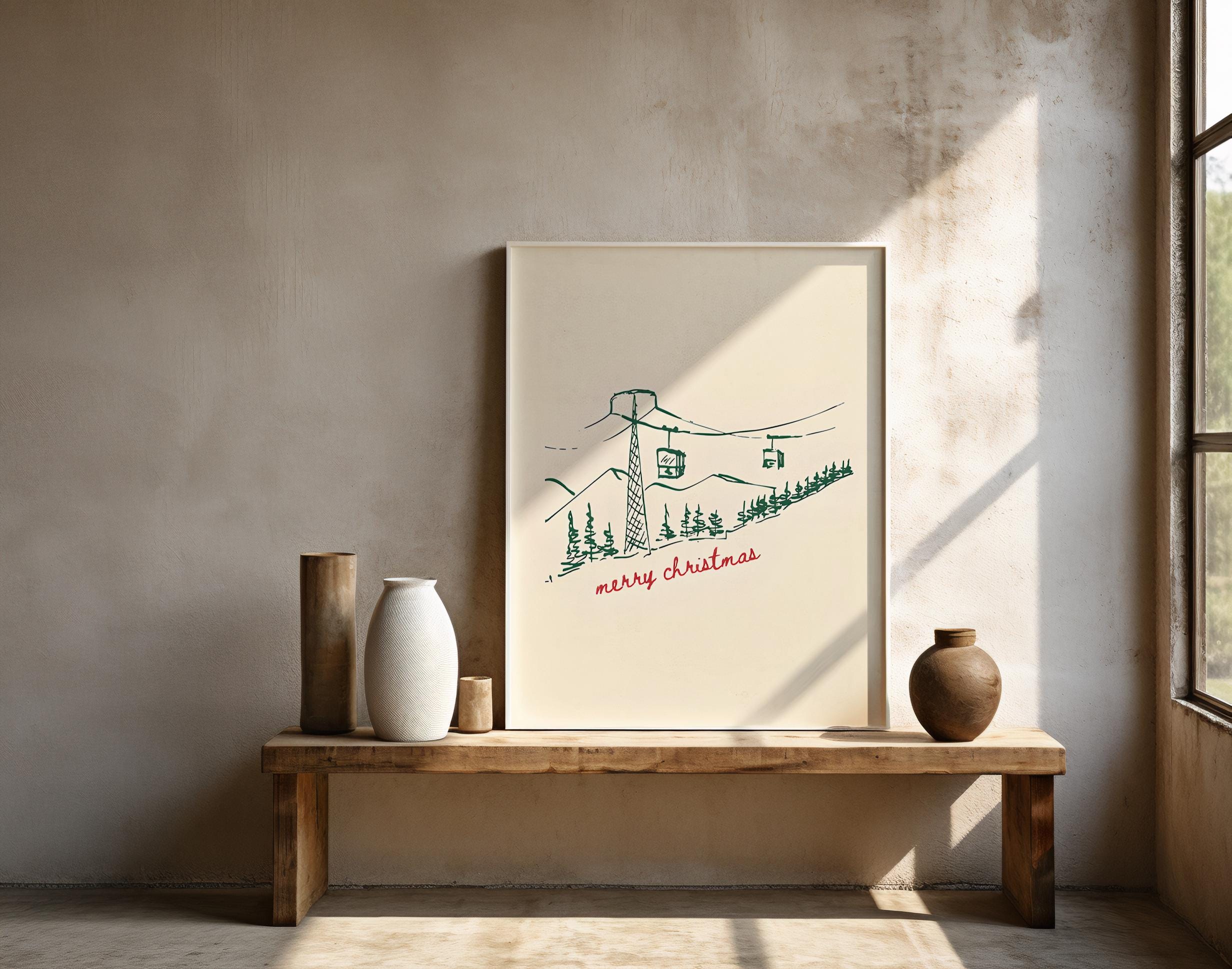 A cozy, minimalist alpine Christmas illustration featuring ski lifts, pine trees, and mountain peaks—finished with a handwritten “merry christmas” in festive red. This modern winter sketch brings soft holiday charm without heavy colors, perfect for cabins, ski homes, neutral interiors, or anyone who loves mountain Christmas vibes.